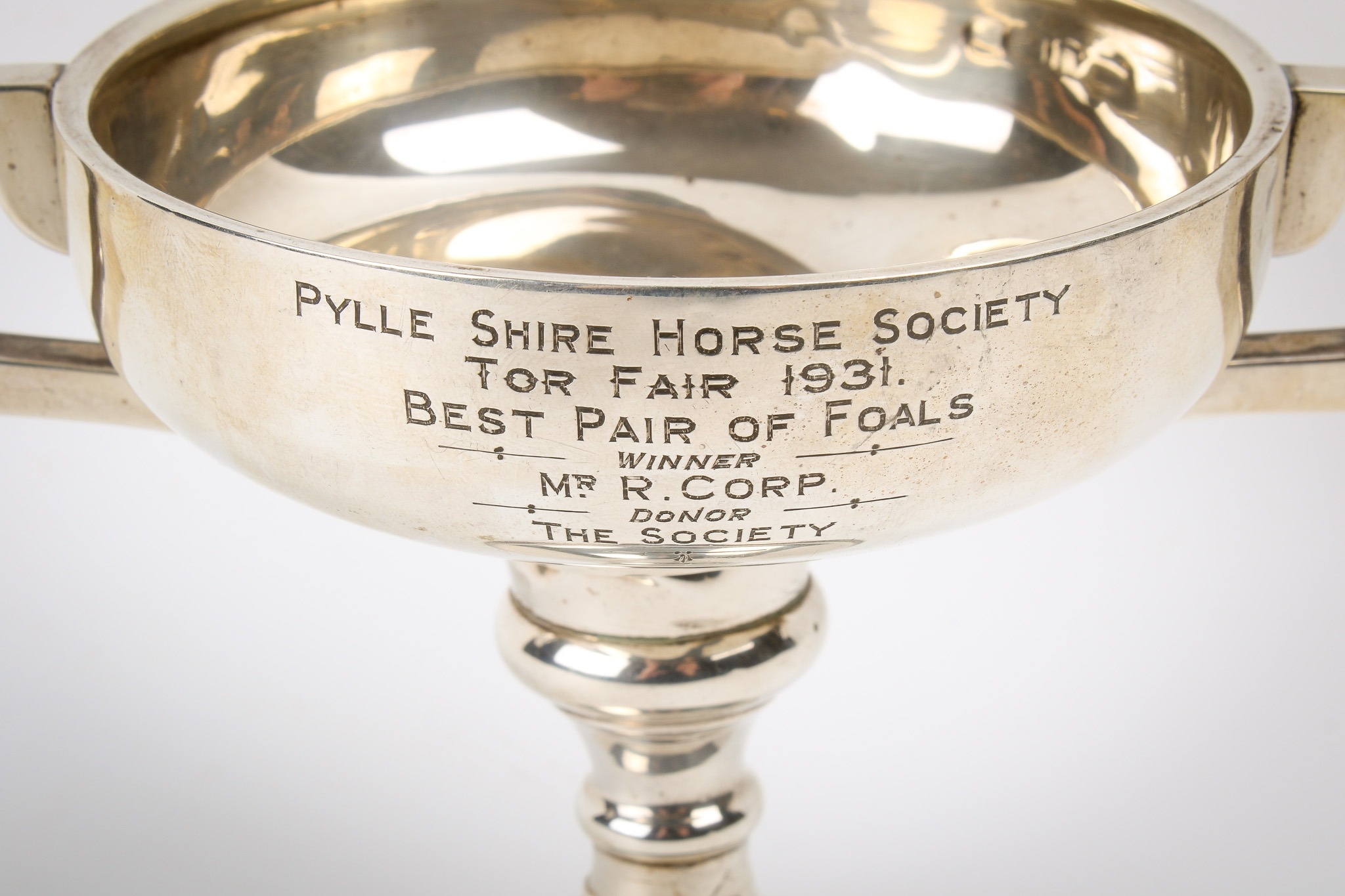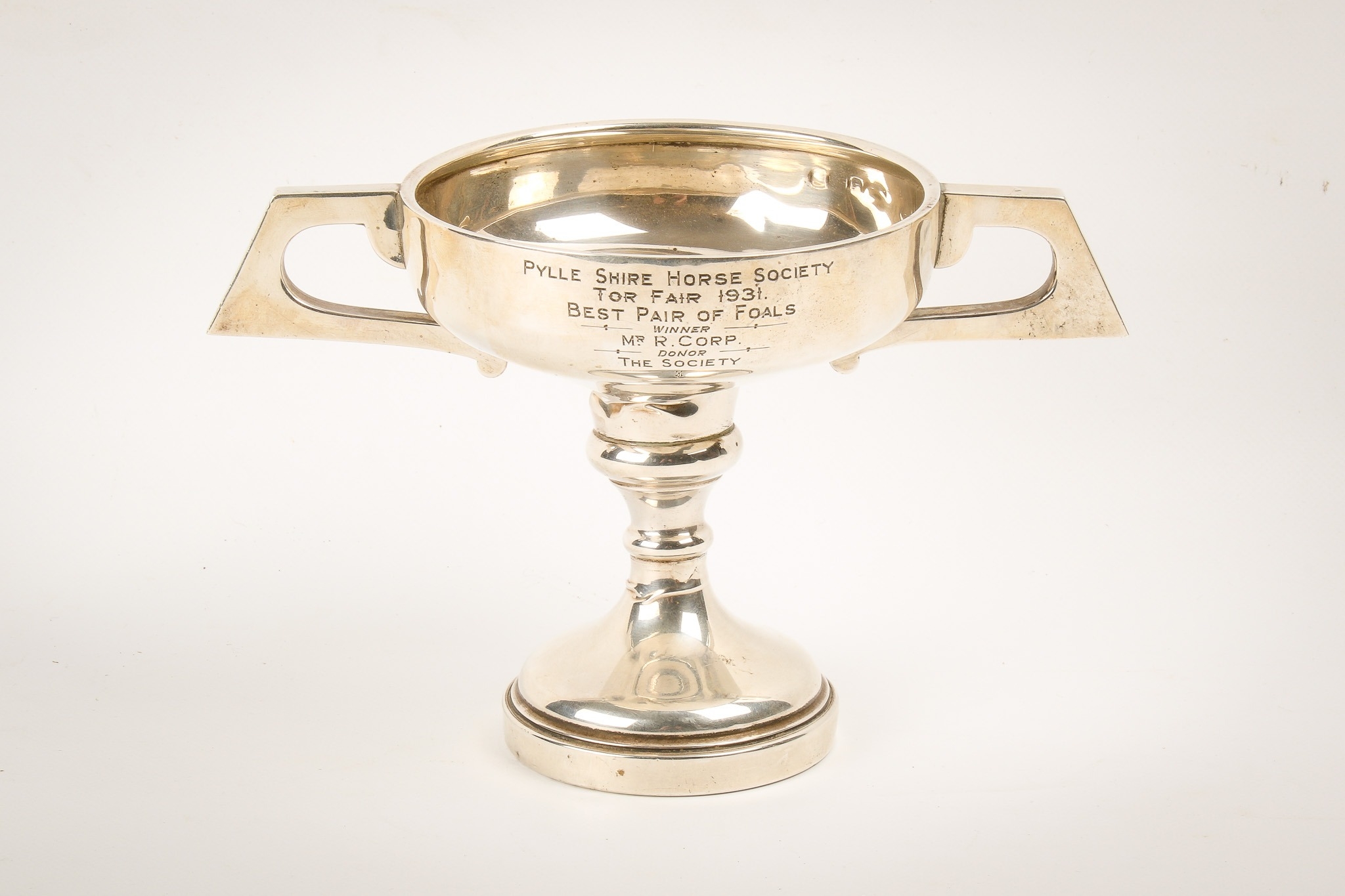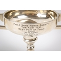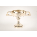 An Art Deco twin-handled weighted silver trophy. The shallow cup engraved 'Pylle Shire Horse Society Tor Fair 1931, Best Pair of Foals ...', hallmarks for Marson & Jones, Birmingham 1930, H12cm, gross weight 260.6g (AF).