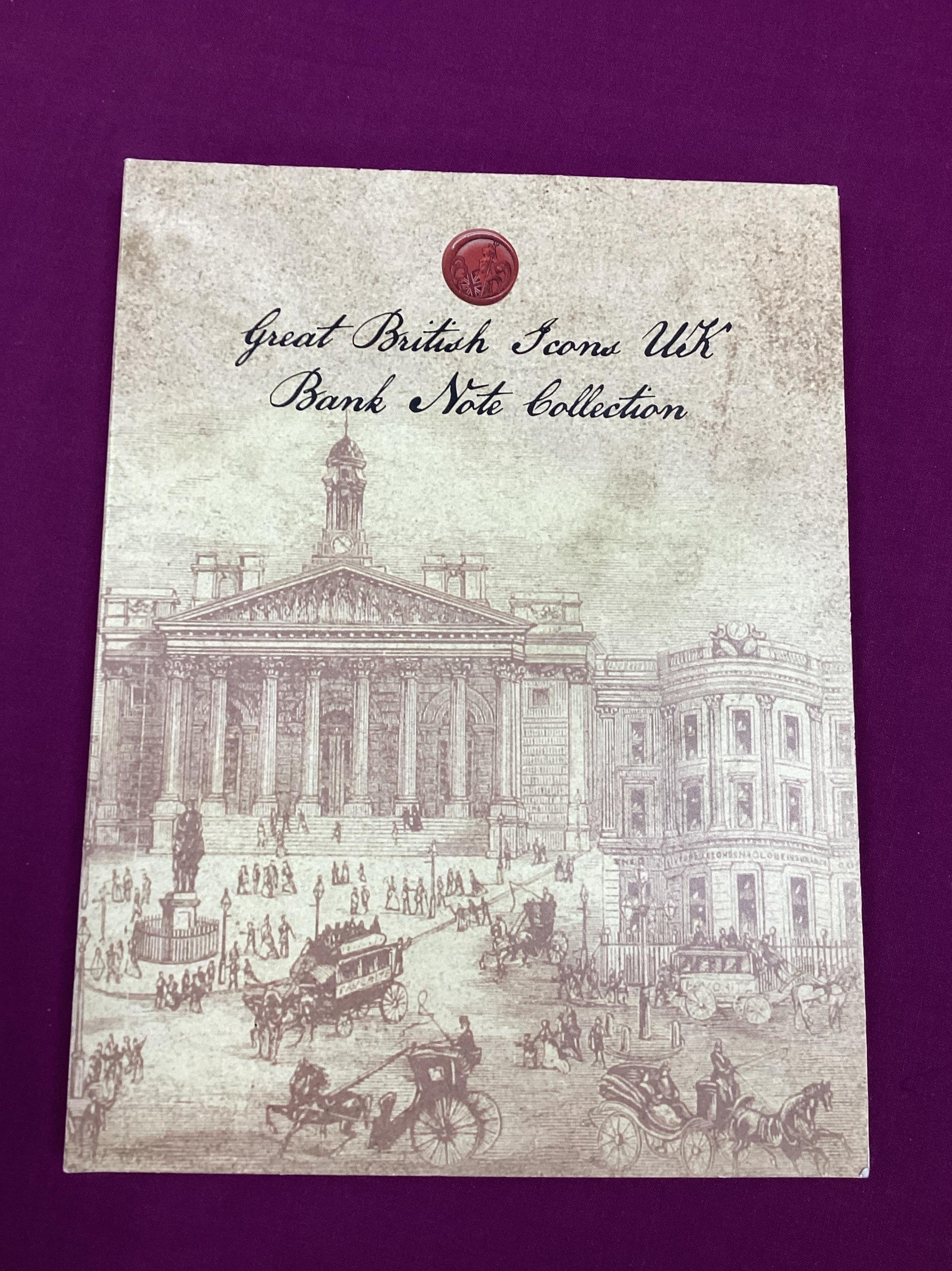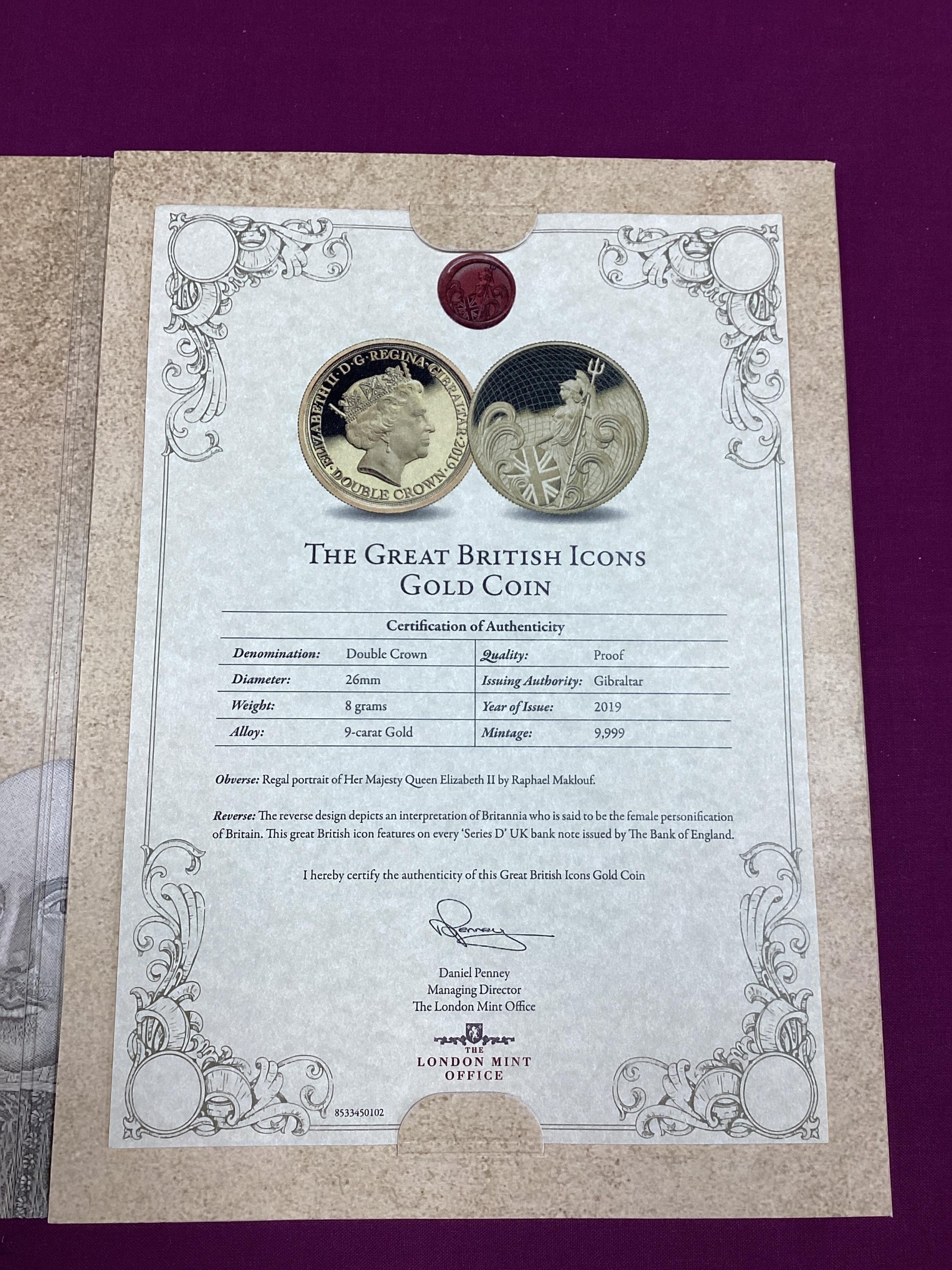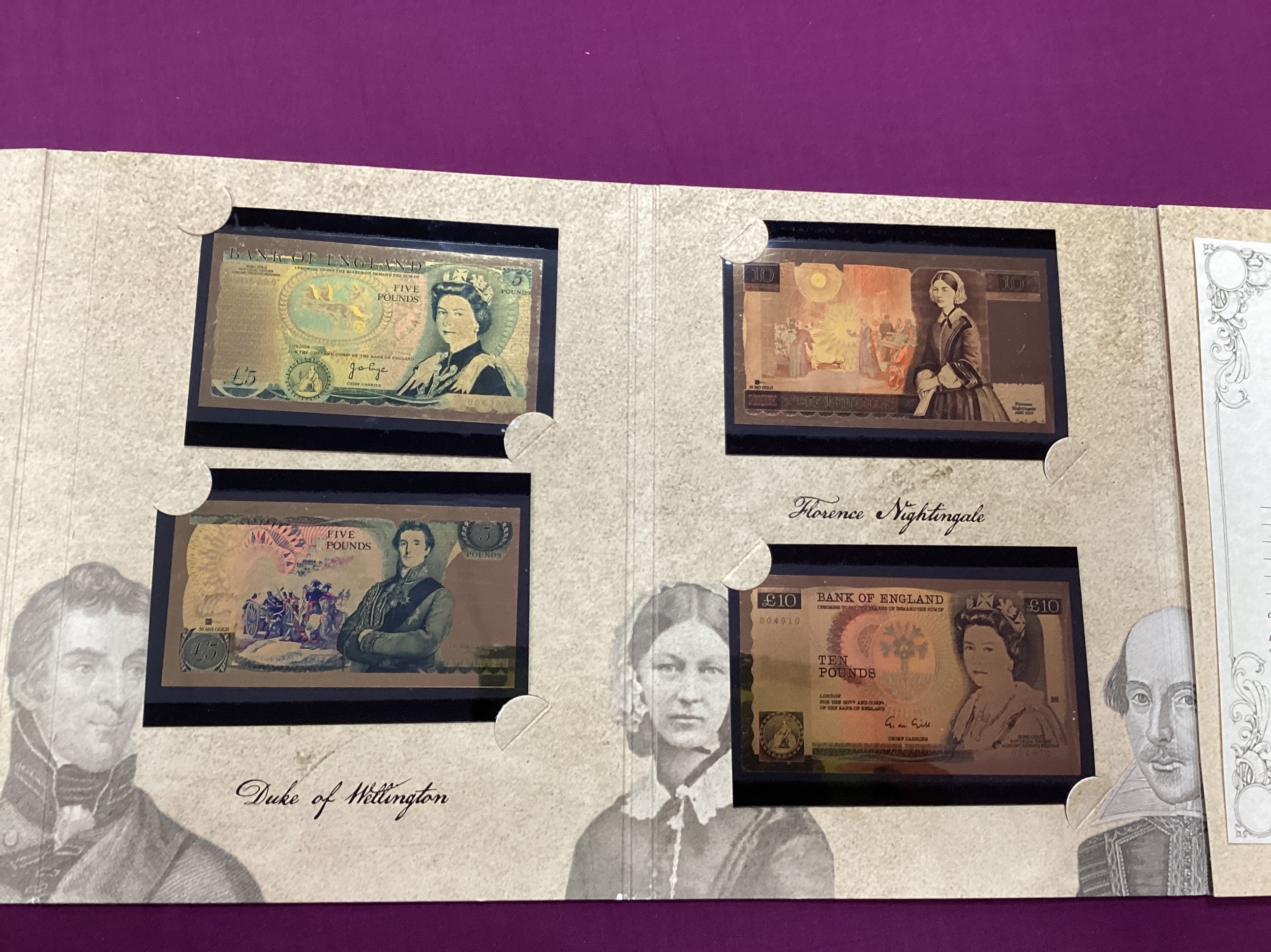 London Mint 'Great British Icons UK Banknote Collection, features ten gold British banknotes from £1 to £50, and a 9ct gold proof Gibraltar Double Crown (8g), in afolder with a certificate of authenticity.