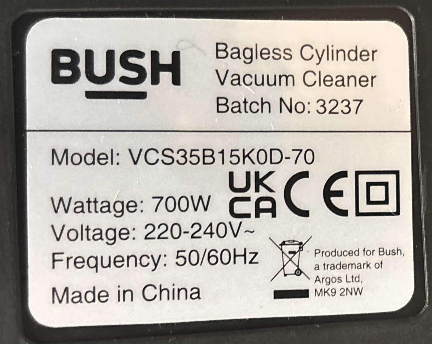 Bush 700W bagless, cylinder vacuum cleaner. Model no. VCS35B15KOD-70. PAT test passed & functionality test indicates in working order.
