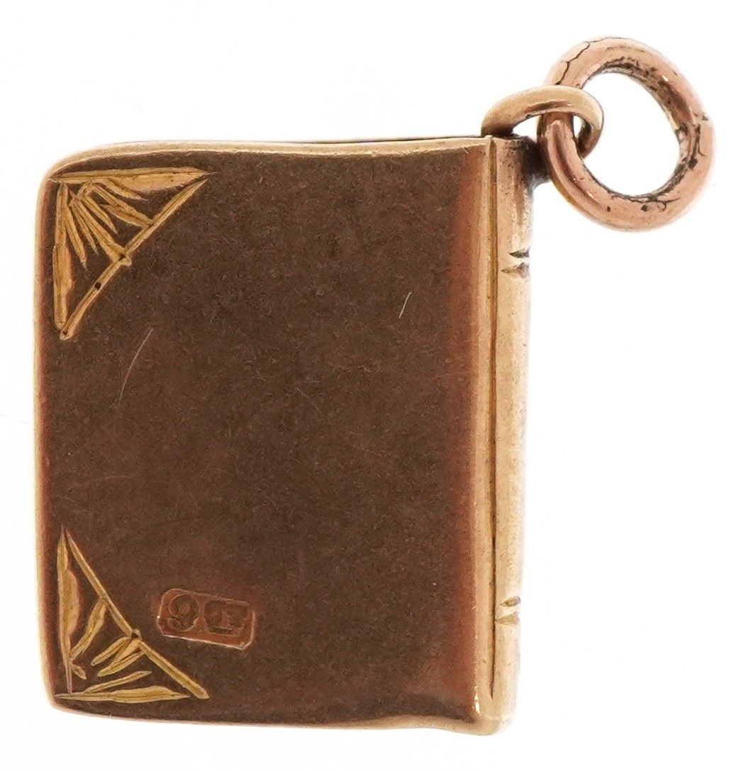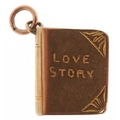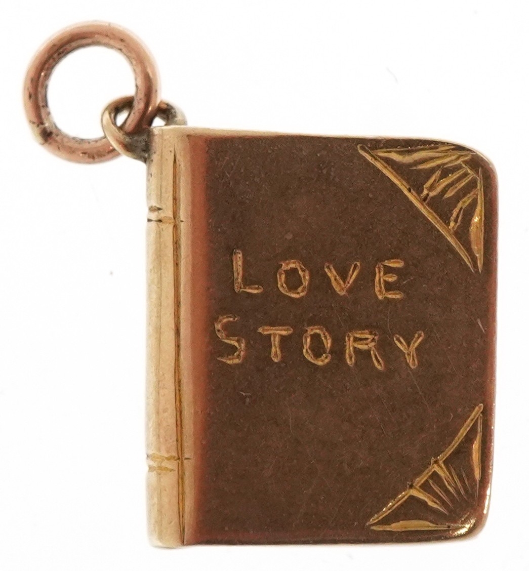 A 9ct gold charm in the form of a book inscribed 'Love Story...