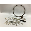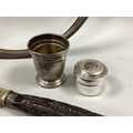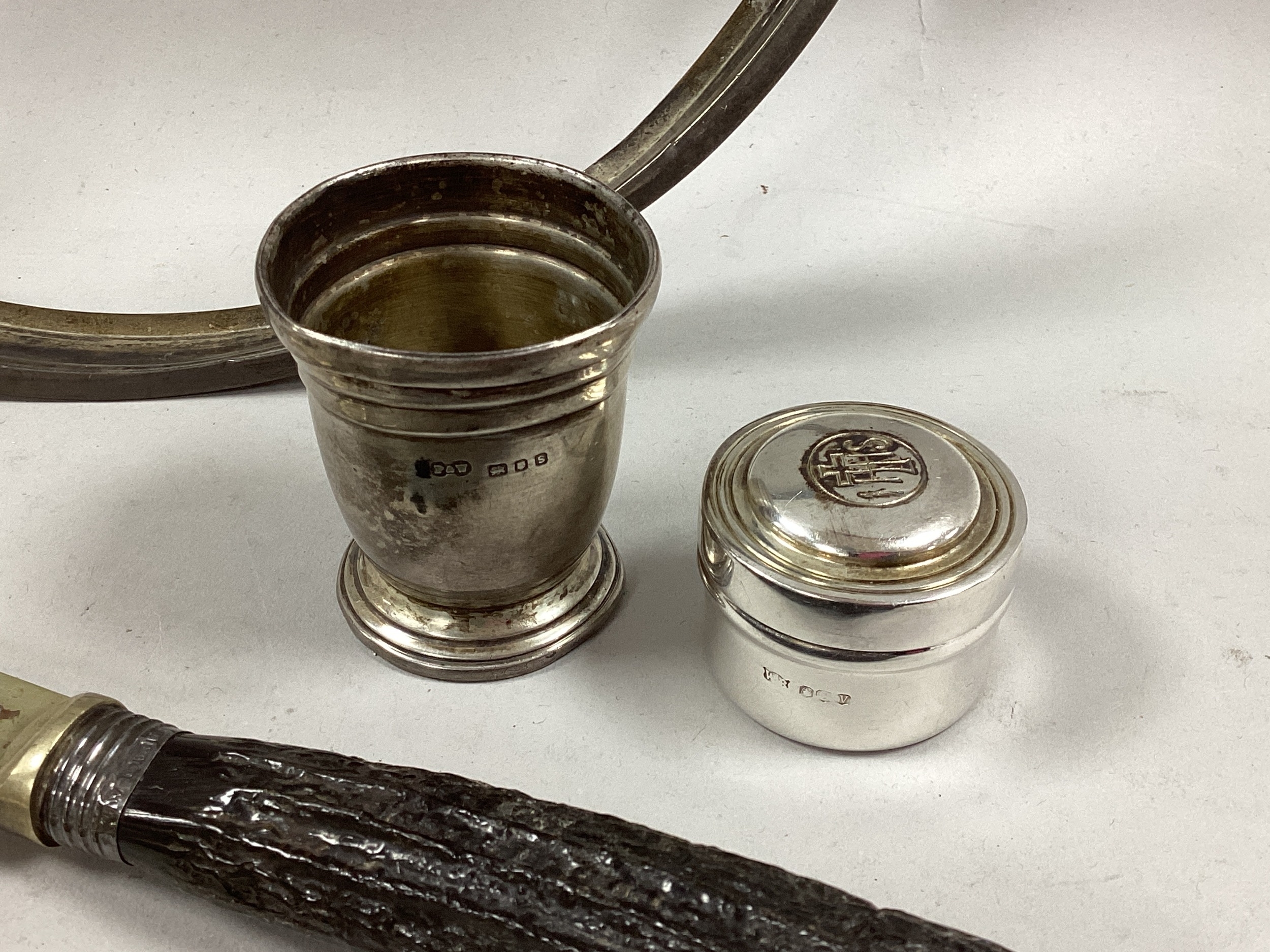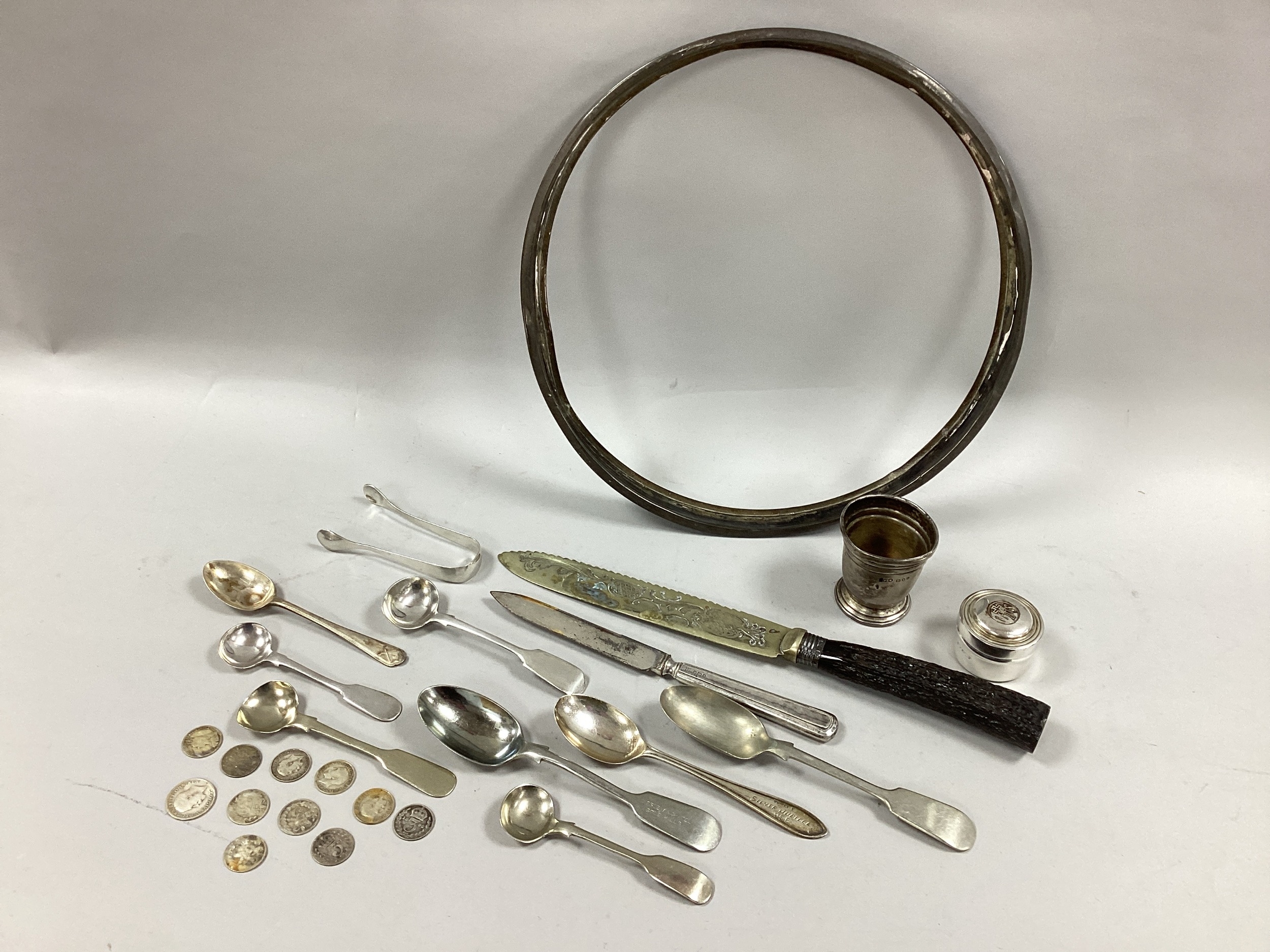 A Hallmarked Silver Pyx, the Christogram "IHS" to lid; Together with a Pair of Hallmarked Silver Sugar Tongs, a hallmarked silver egg cup (damages), assorted fiddle pattern and other spoons, coinage, etc.
