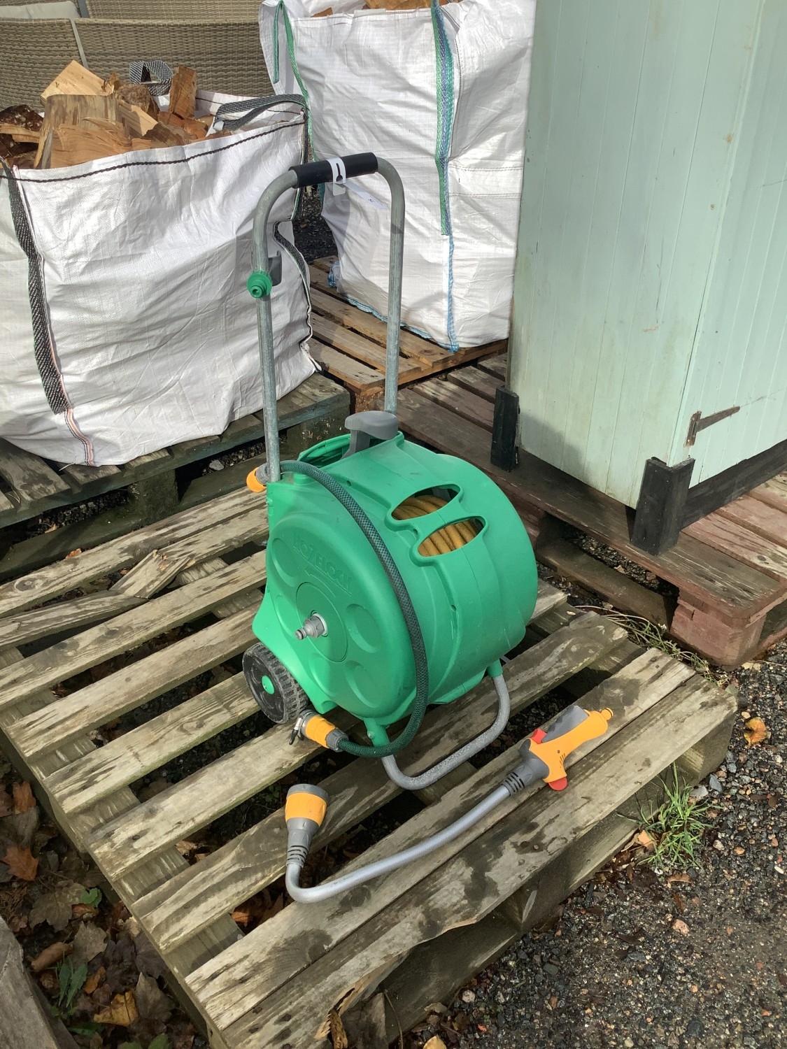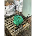 A Hozelock hose reel together with a sprinkler attachment