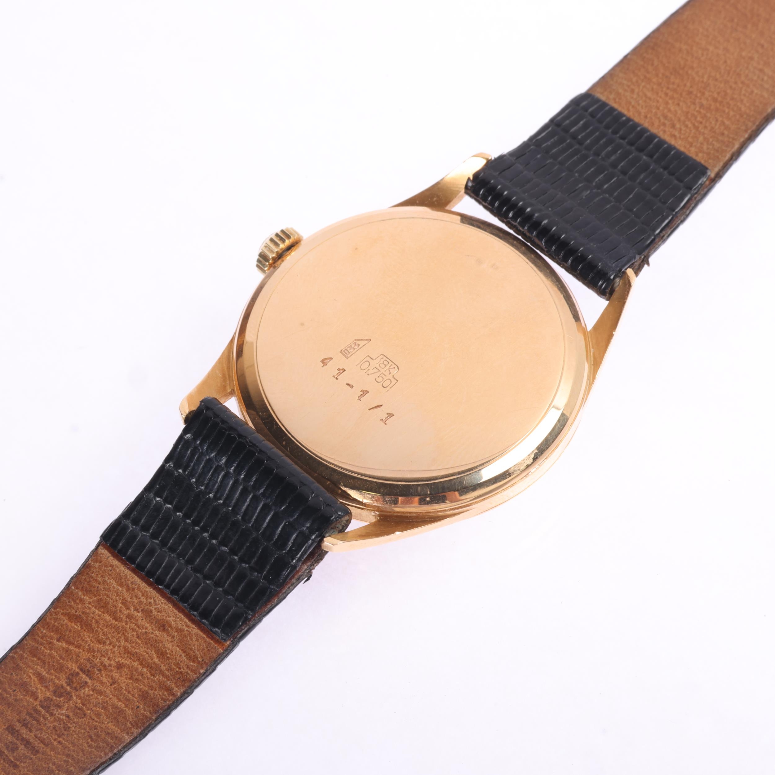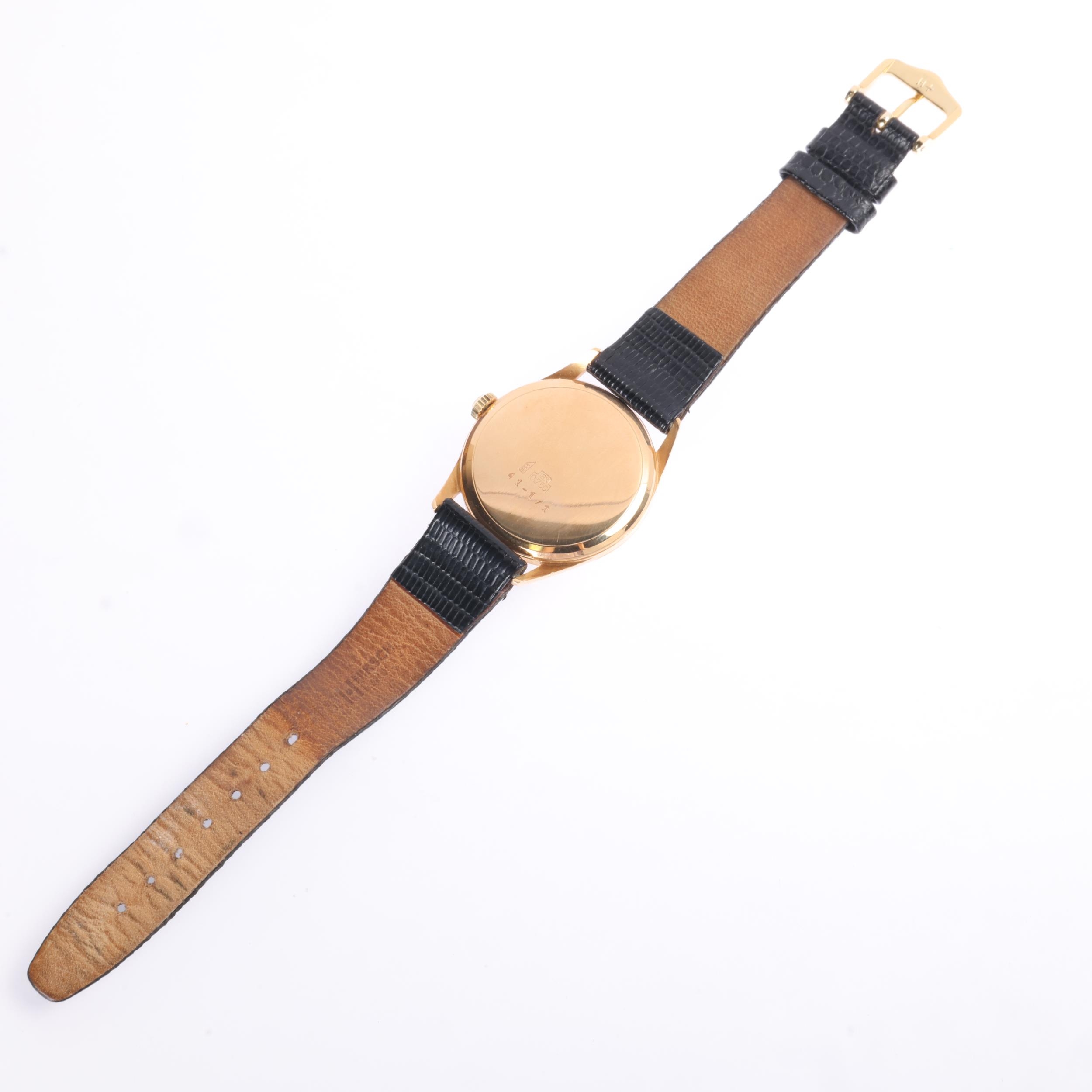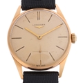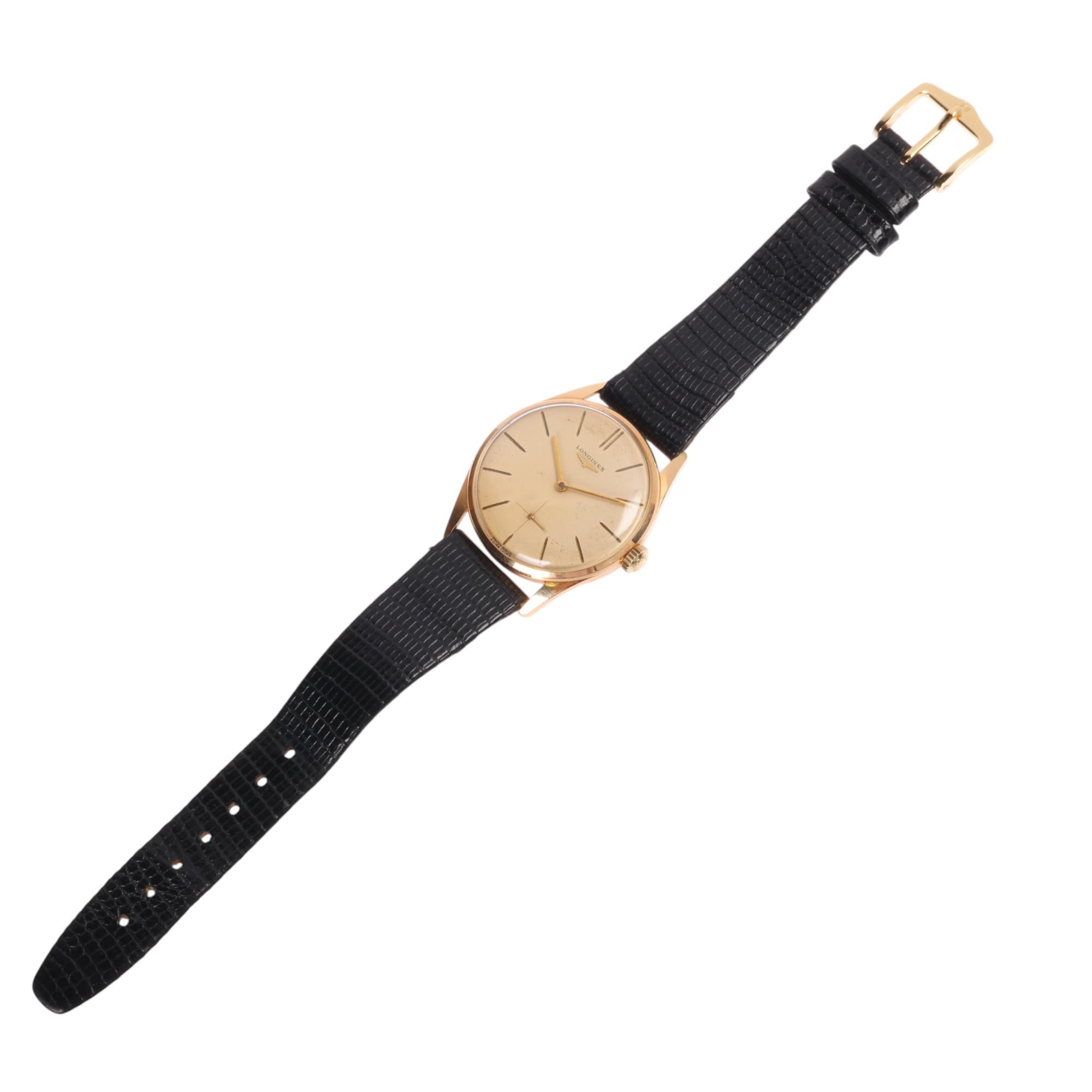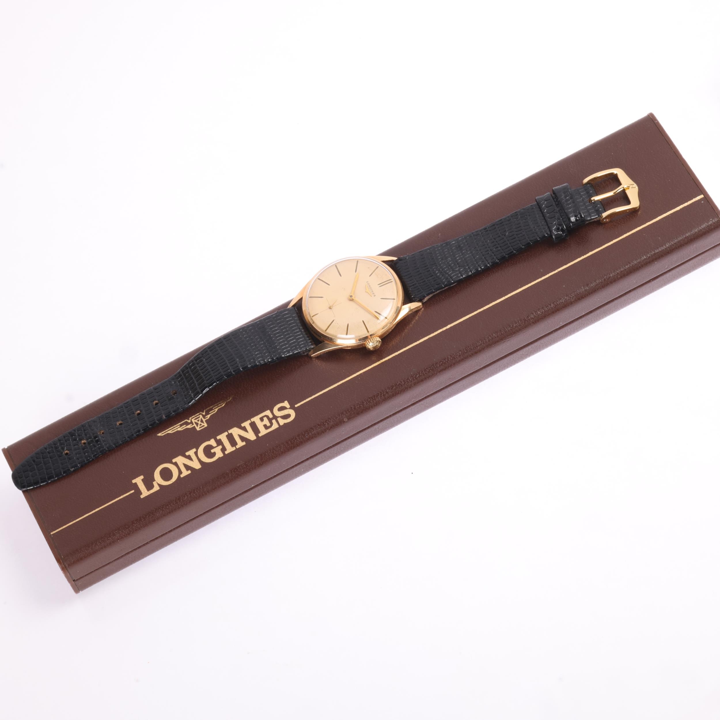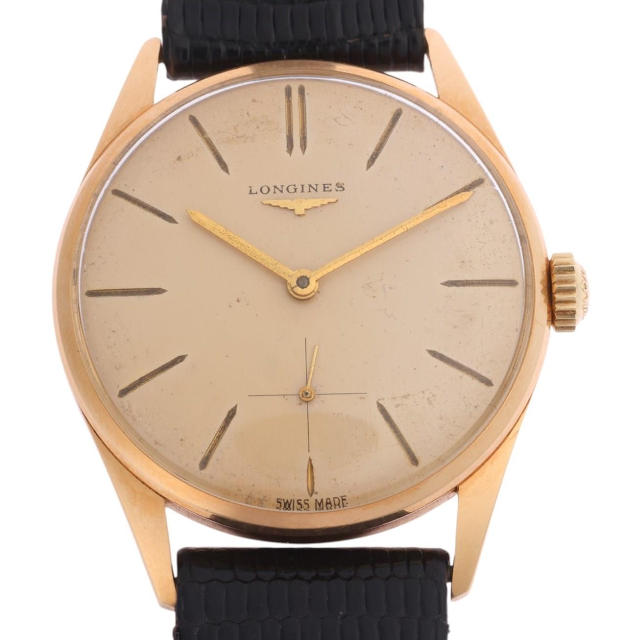 LONGINES - a Vintage 18ct gold mechanical wristwatch, ref. 41-1/1, cream dial with gilt arrowhead baton hour markers, gilt pencil hands and subsidiary crosshair seconds dial, 17 jewel movement with calibre 30L, serial no. 11866163, case width 34mm, 35g gross, working order, boxed
