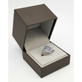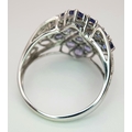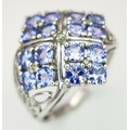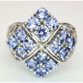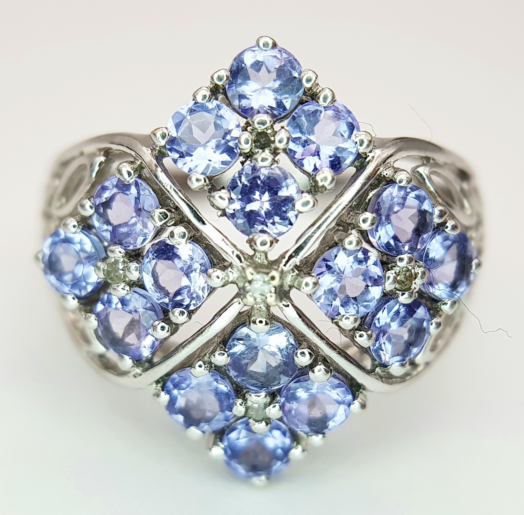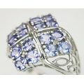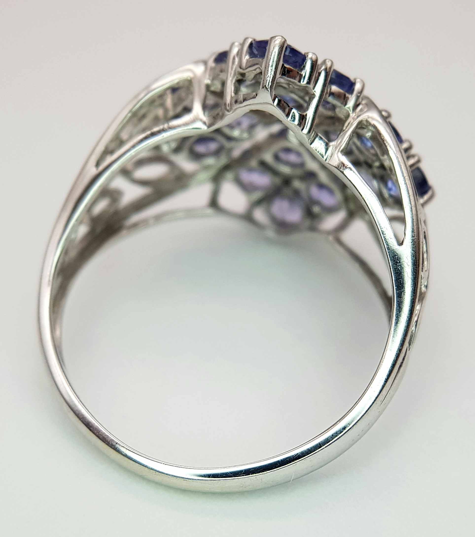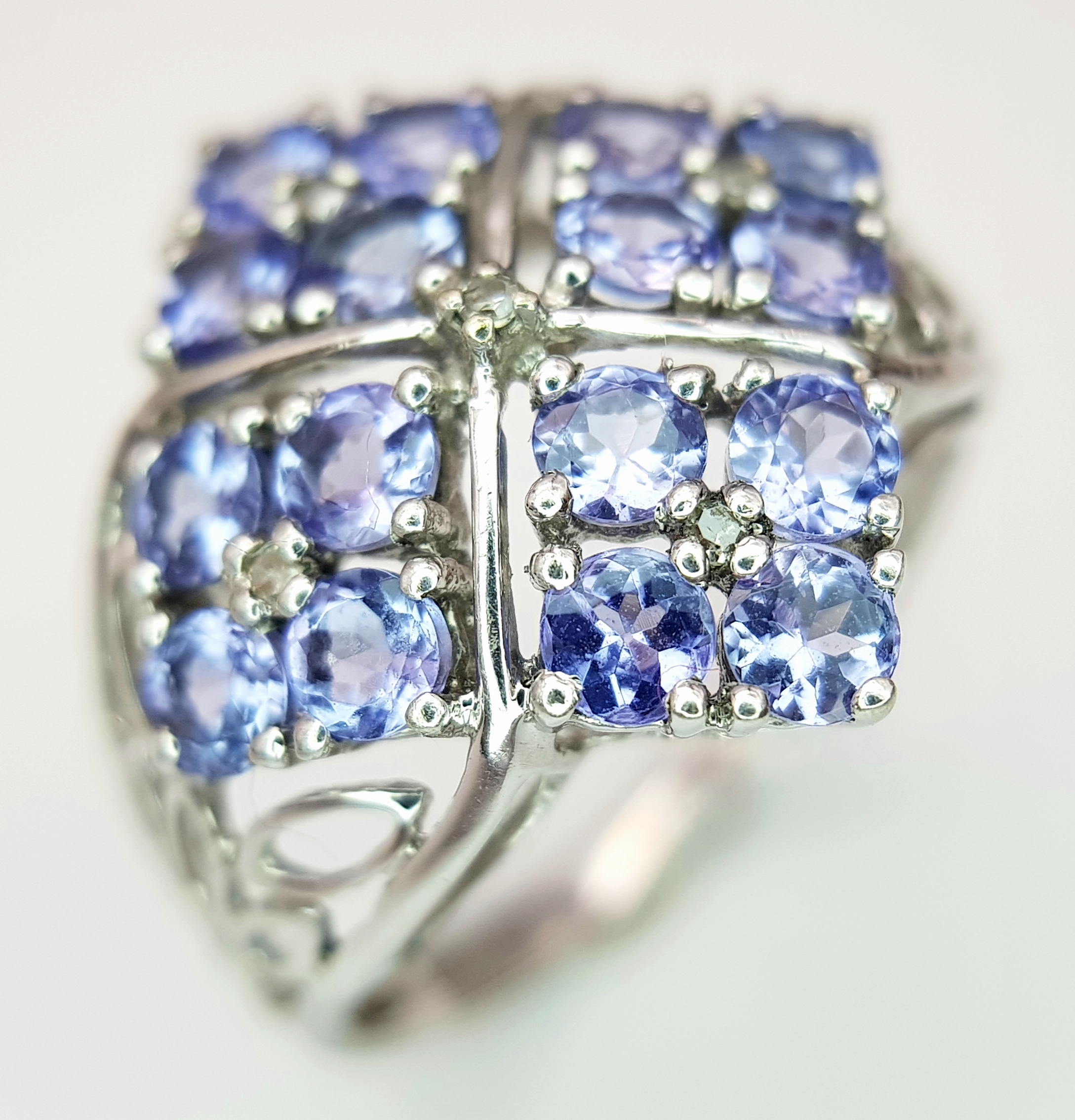 An Impressive 9 Carat White Gold Tanzanite and Diamond Set Ring, Size O. The Ring is set with sixteen 3mm Round Cut Tanzanites and Five 1mm Round Cut Diamonds in an open work mount. Gross Weight 3.3 Grams. Comes in Presentation Box.