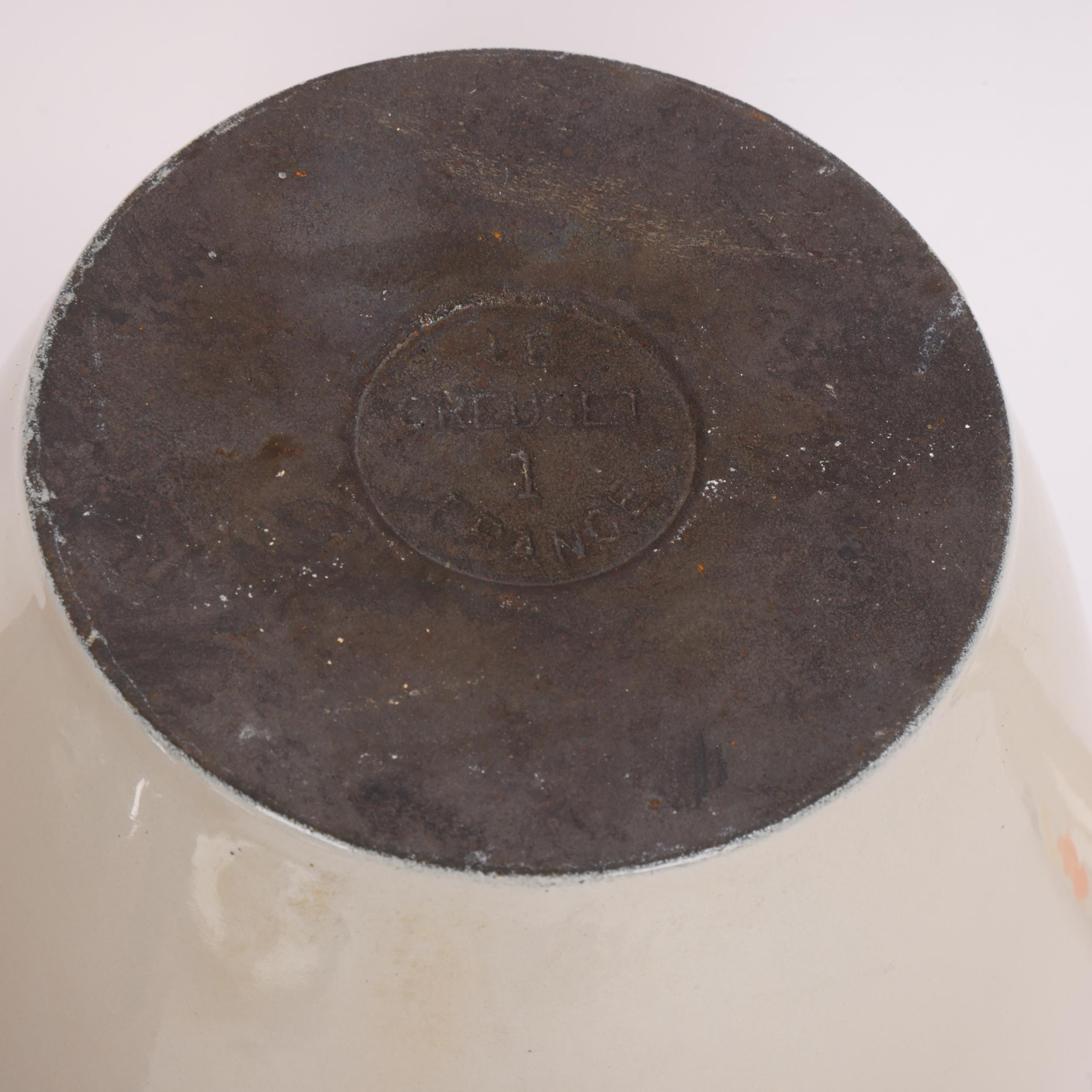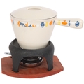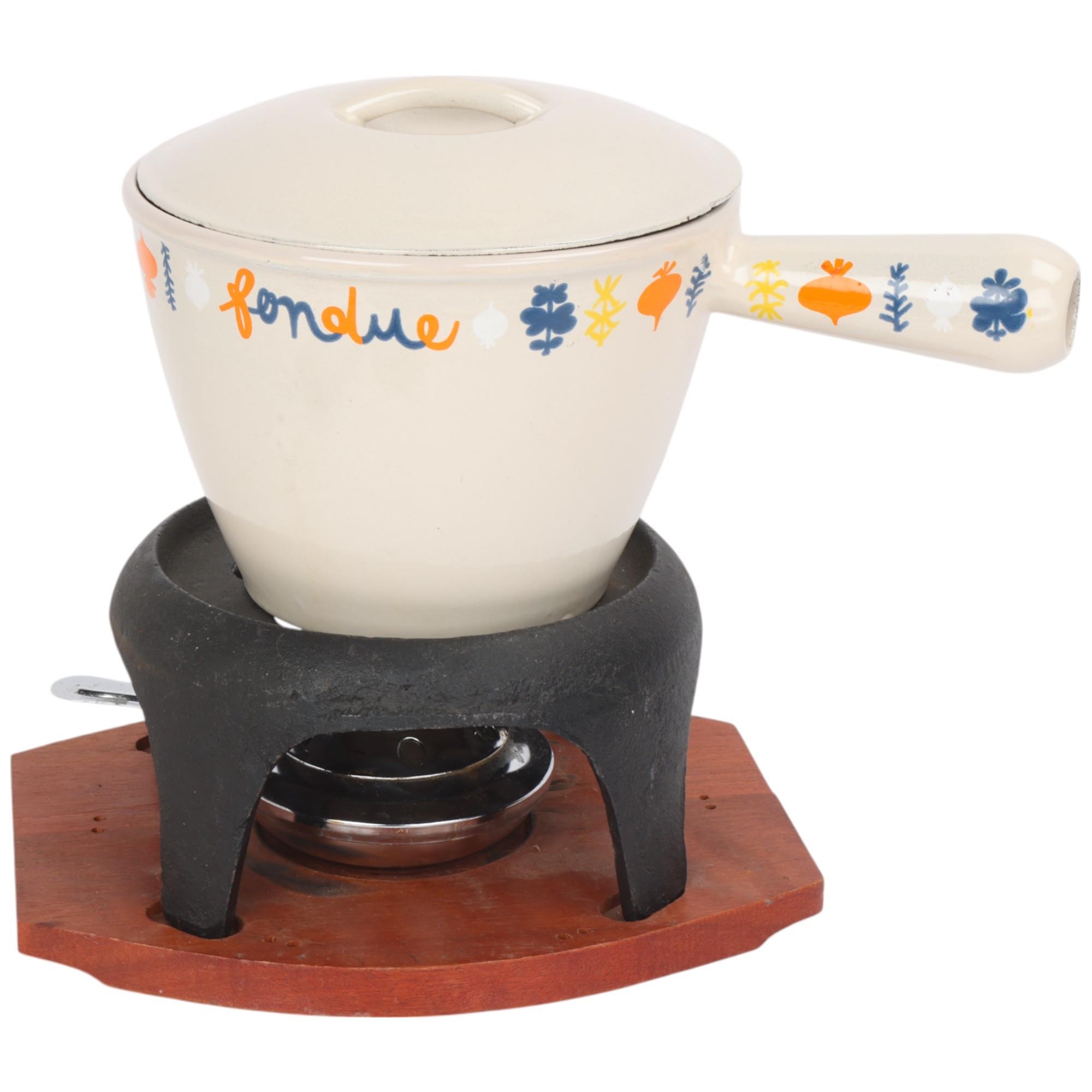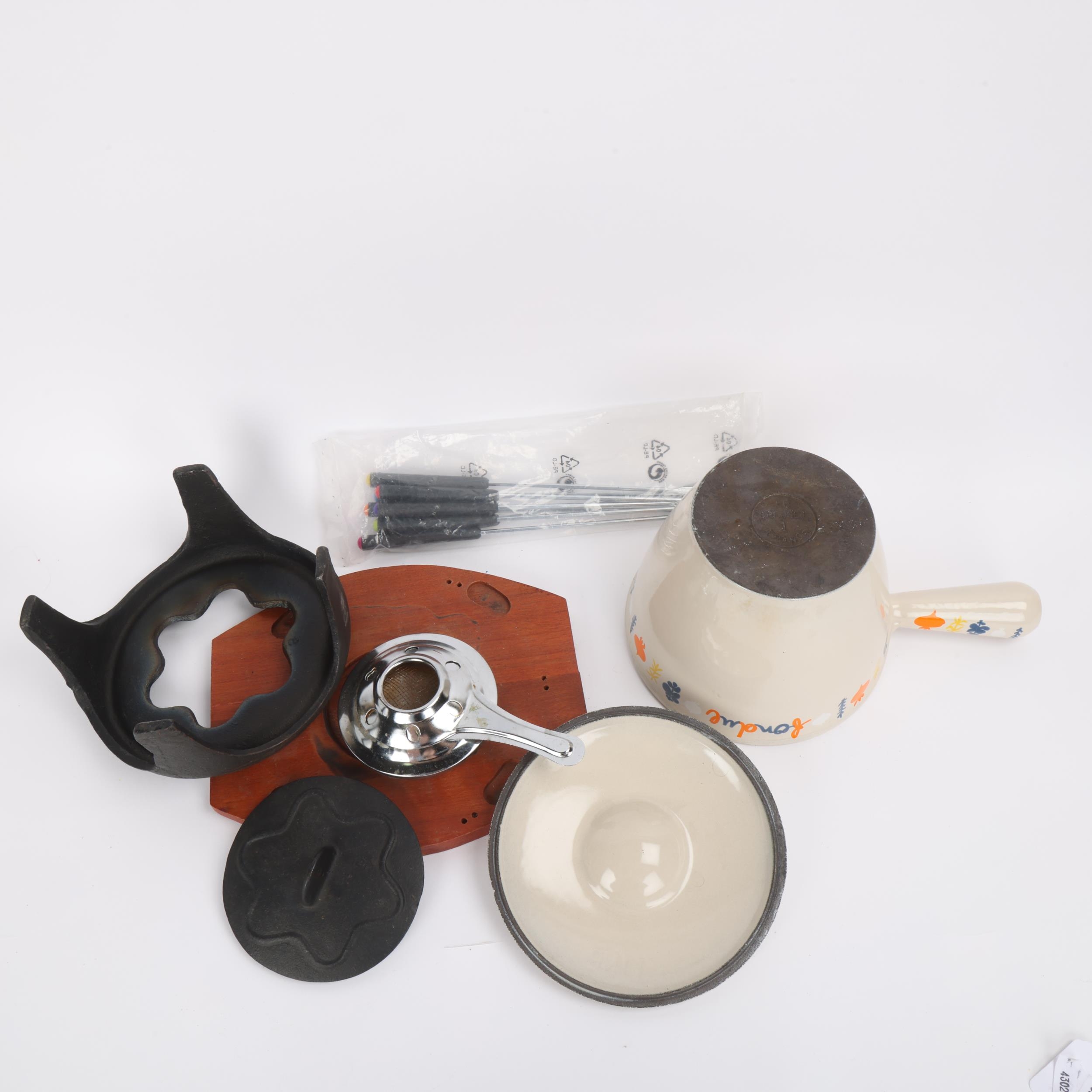 A Le Creuset No 1 fondue pan and cover, with an earlier fondue teak and iron base together with a set of fondue forks.