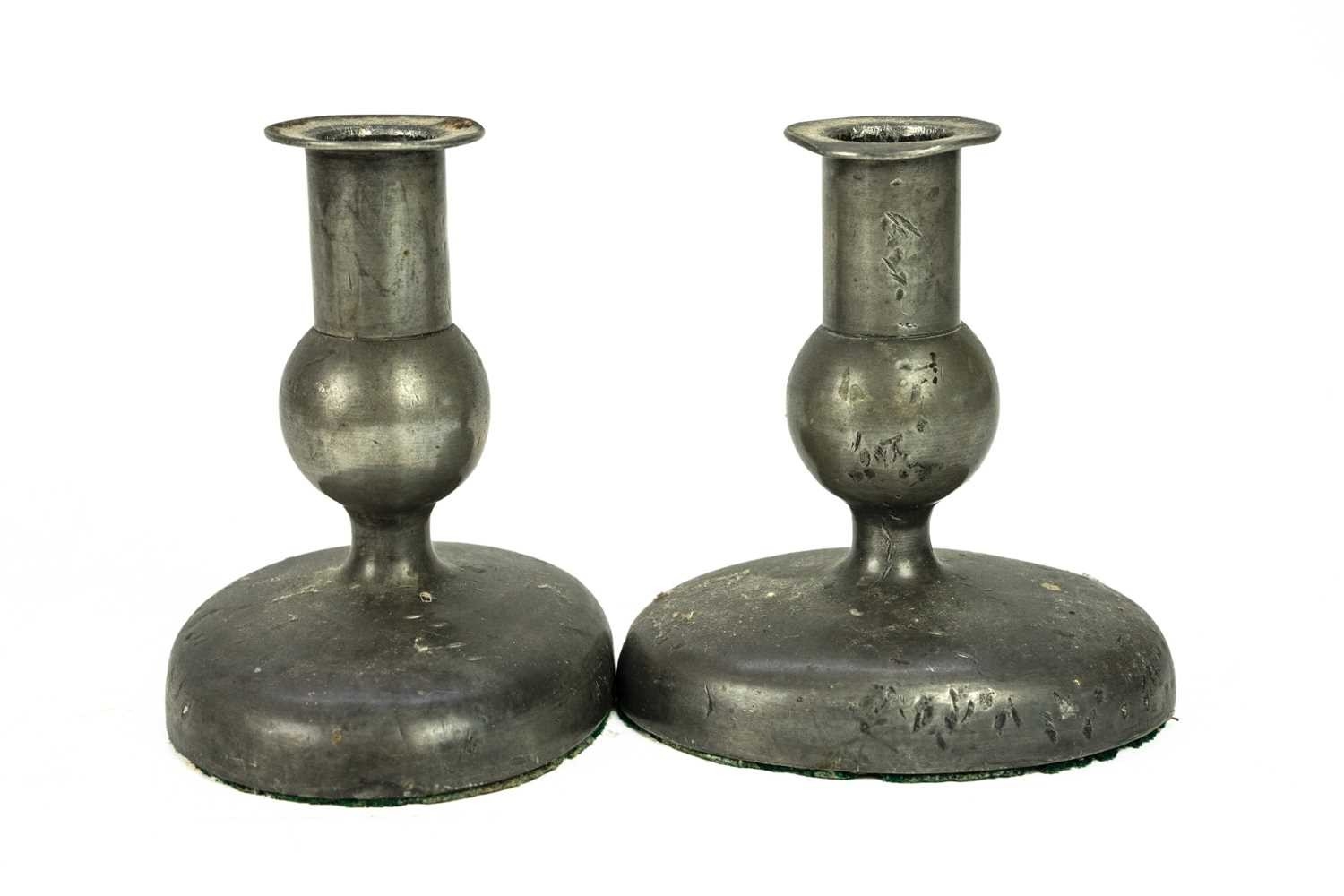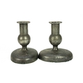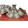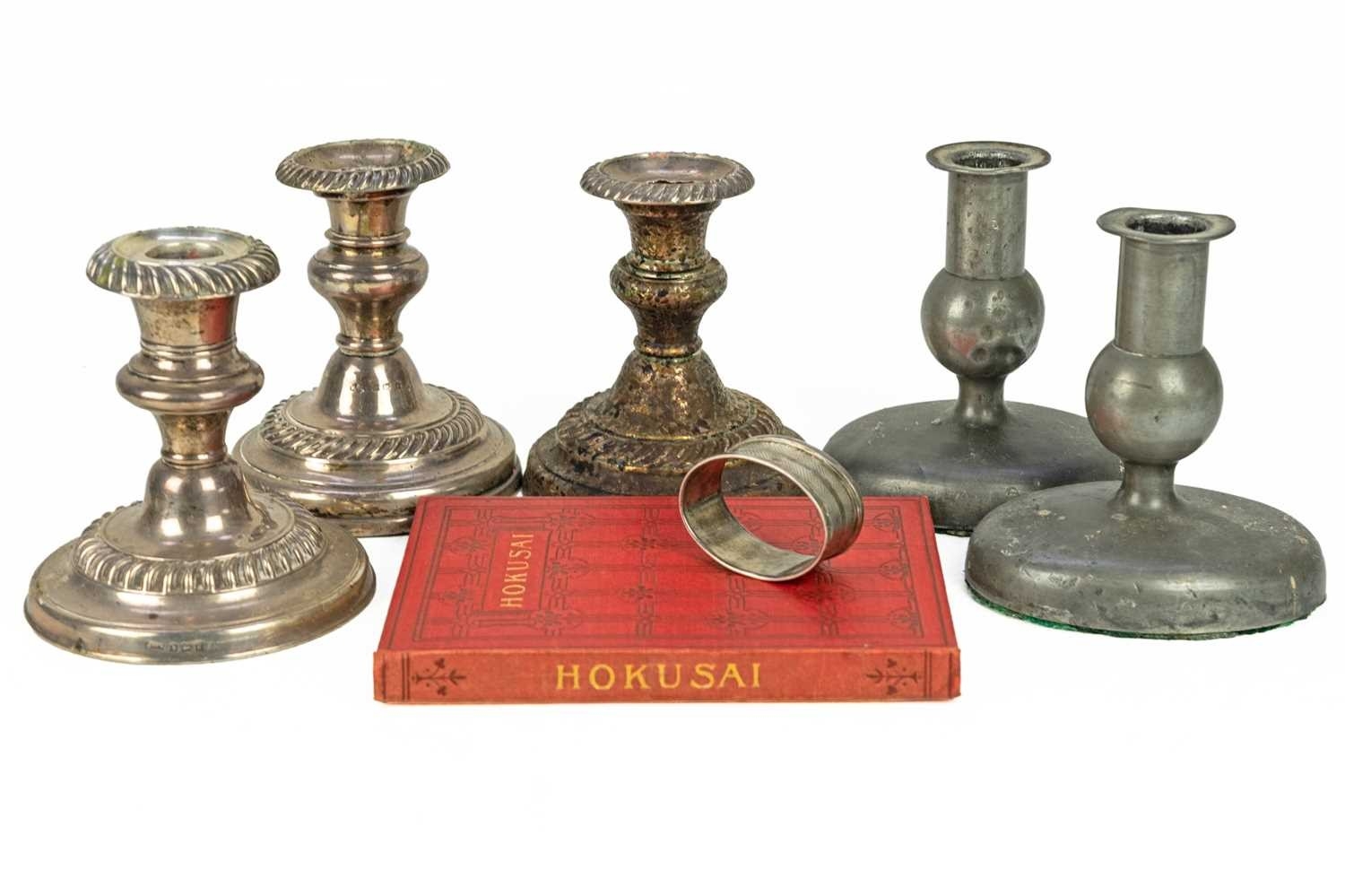 Three loaded silver piano candlesticks. Mixed dates and makers, height 11cm, together with a silver napkin ring, a pair of pewter candlesticks and a book.