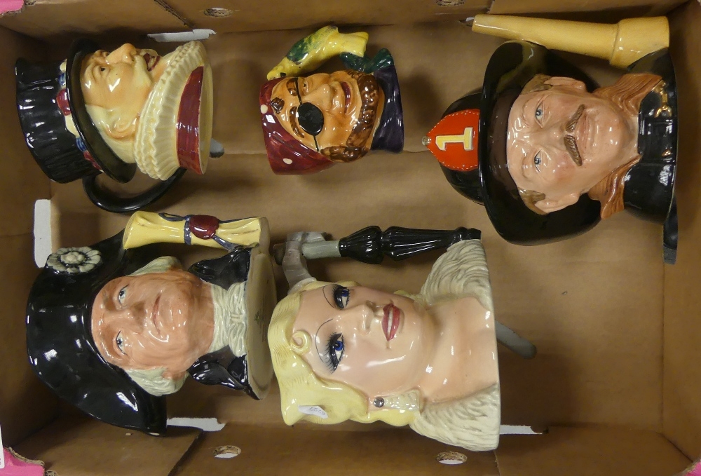 Royal Doulton Character Jugs to include:- Mae West D6688, George Washington D6669, The fireman D6697(all seconds) together with Shorter & Sons, Pirate, Beefeater(829)(1tray)