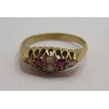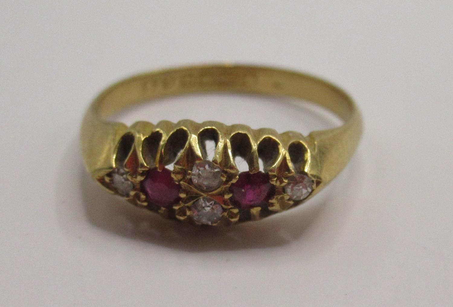 18ct yellow gold six stone diamond and ruby ring, stamped 18, size O, 3.56g