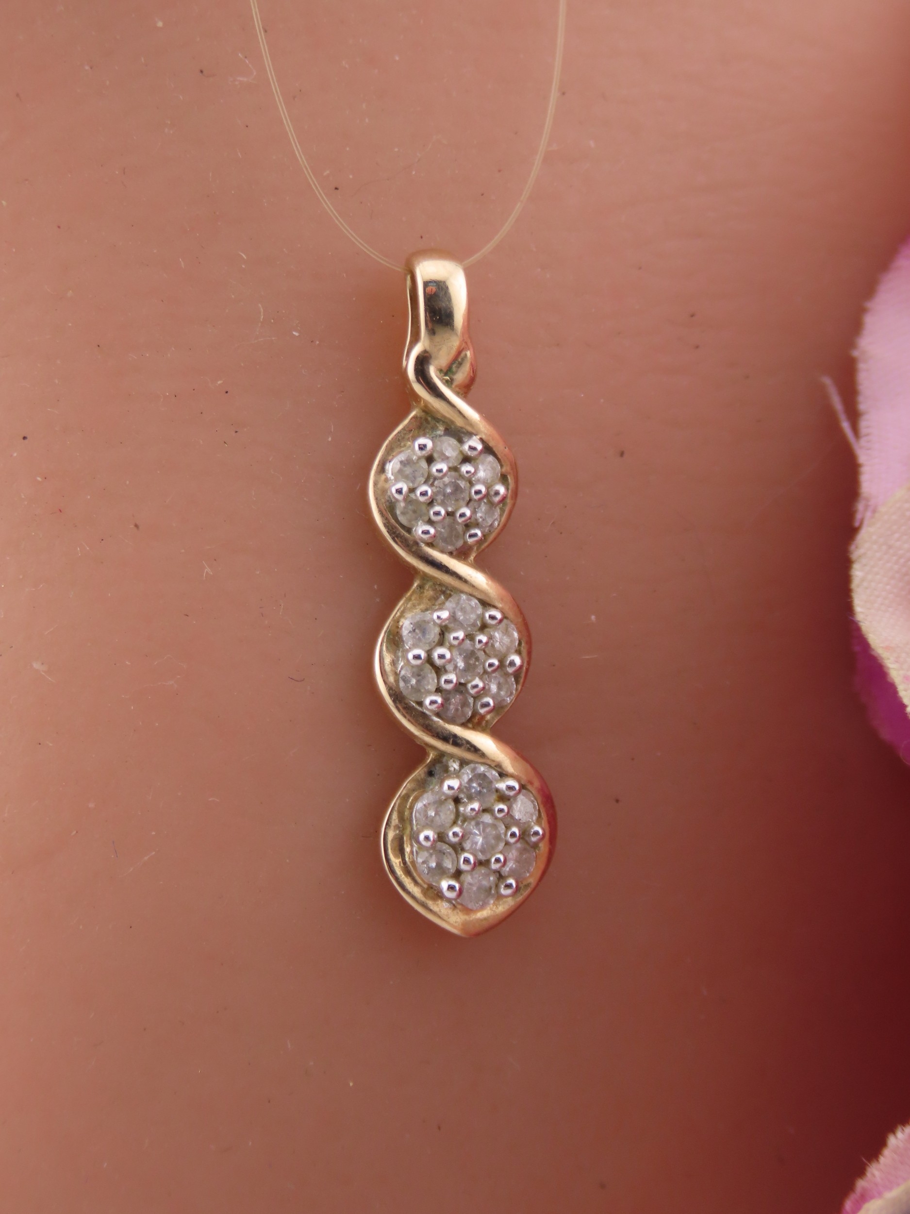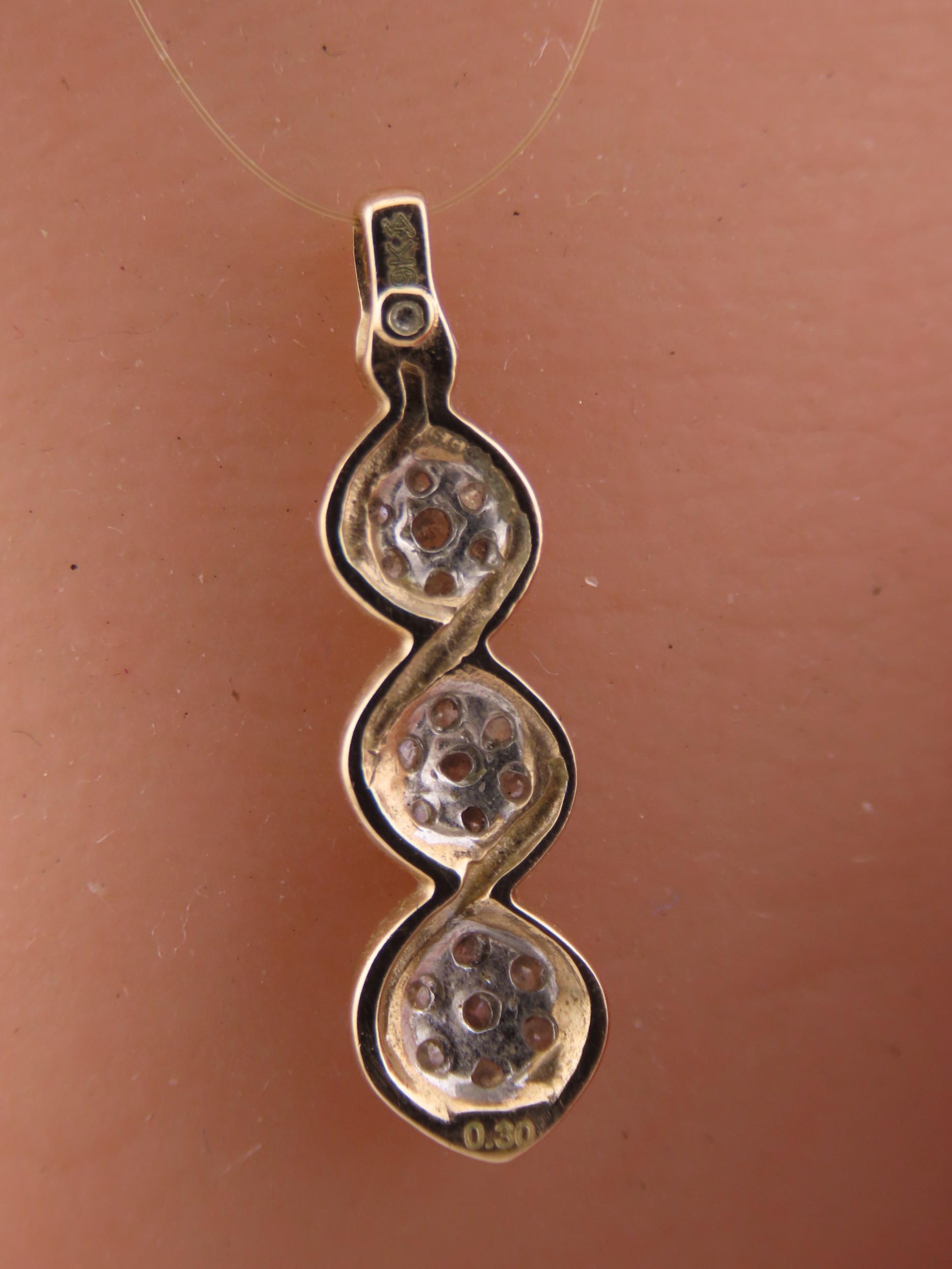 A 9 carat gold diamond set pendant, designed as a graduated three stone drop set with round brilliant cut diamonds. Gross weight approximately 1.3 grams.