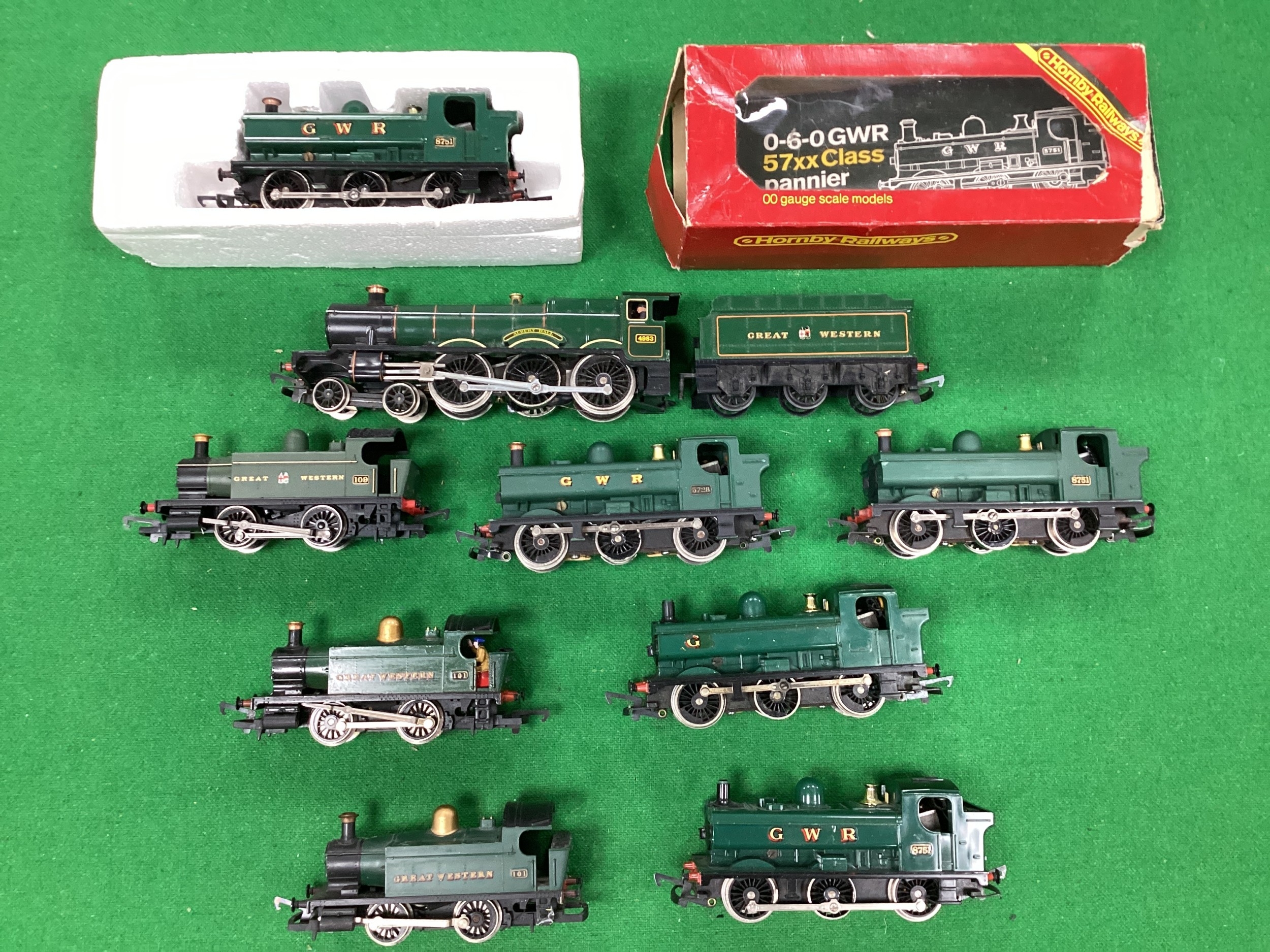 Nine 00 gauge Great Western locomotive's, by Triang and Hornby including "Albert Hall" 4-6-0, three 0-4-0 tank engines and five 0-6-0 Pannier tanks including one boxed; all playworn and untested, two locomotives missing chimney caps.