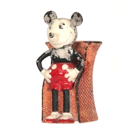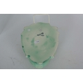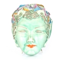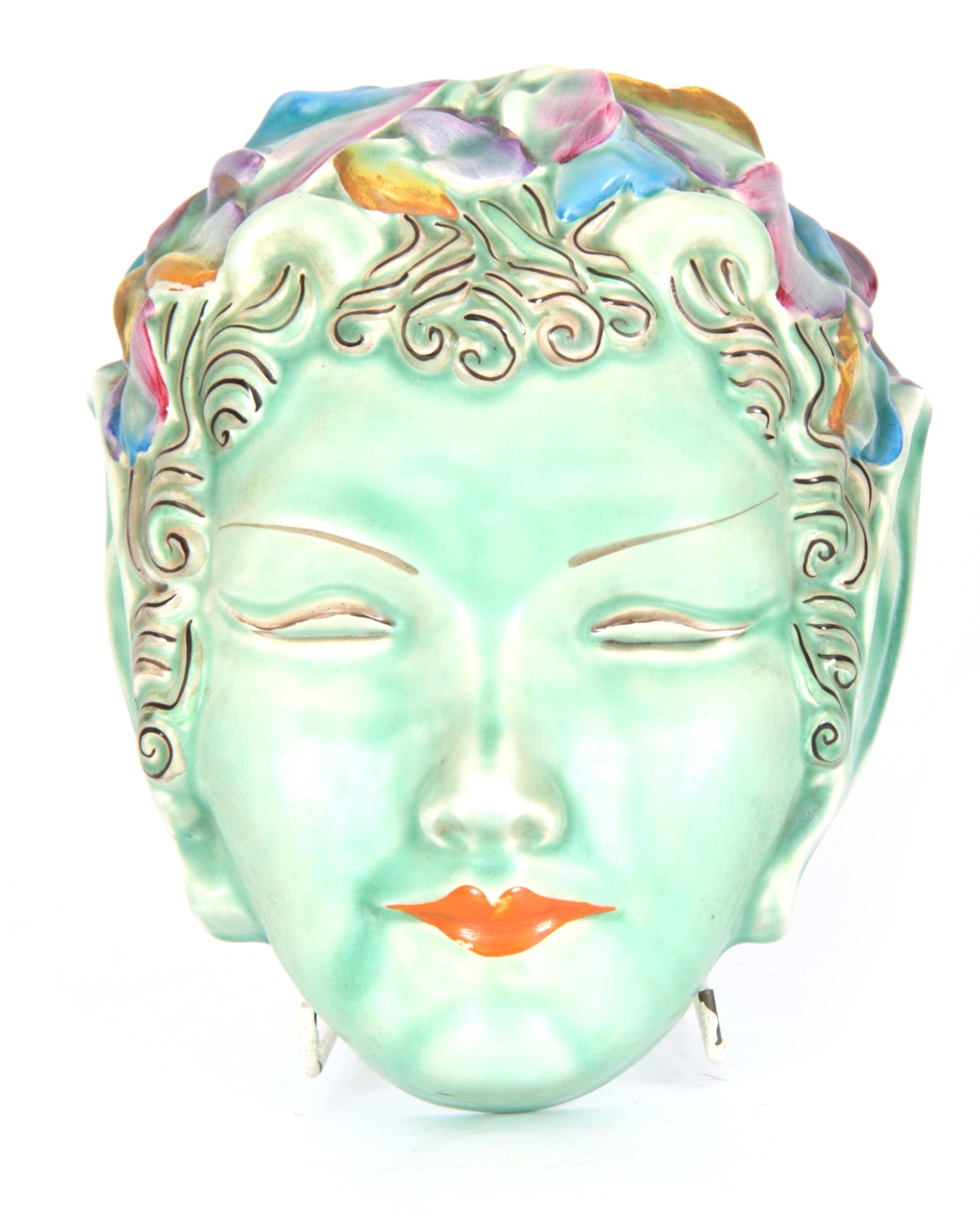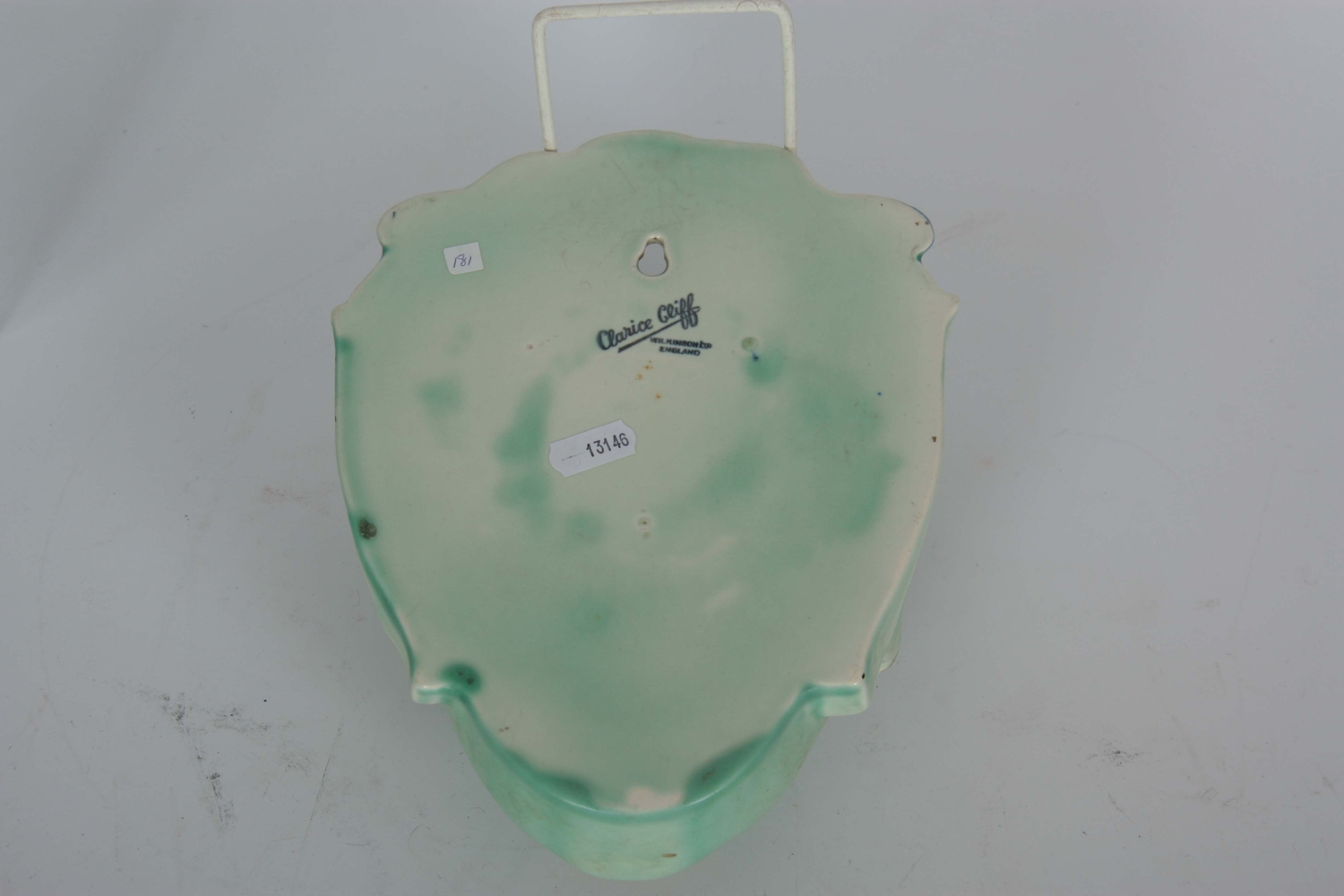 A 20TH CENTURY CLARICE CLIFF HANGING WALL MASK / POCKET depicting an oriental lady with brightly coloured floral hair decoration on a green ground - stamped to reverse Clarice Cliff, Wilkinson Ltd. England 23cm high 19cm wide.