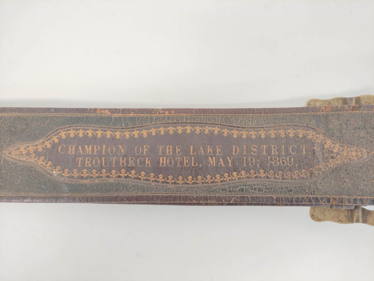 Antique Victorian leather Cumberland wrestling belt bearing a central plaque which reads "Champion Of The lake District. Troutbeck Hotel May 19 1869" . Length 148cm