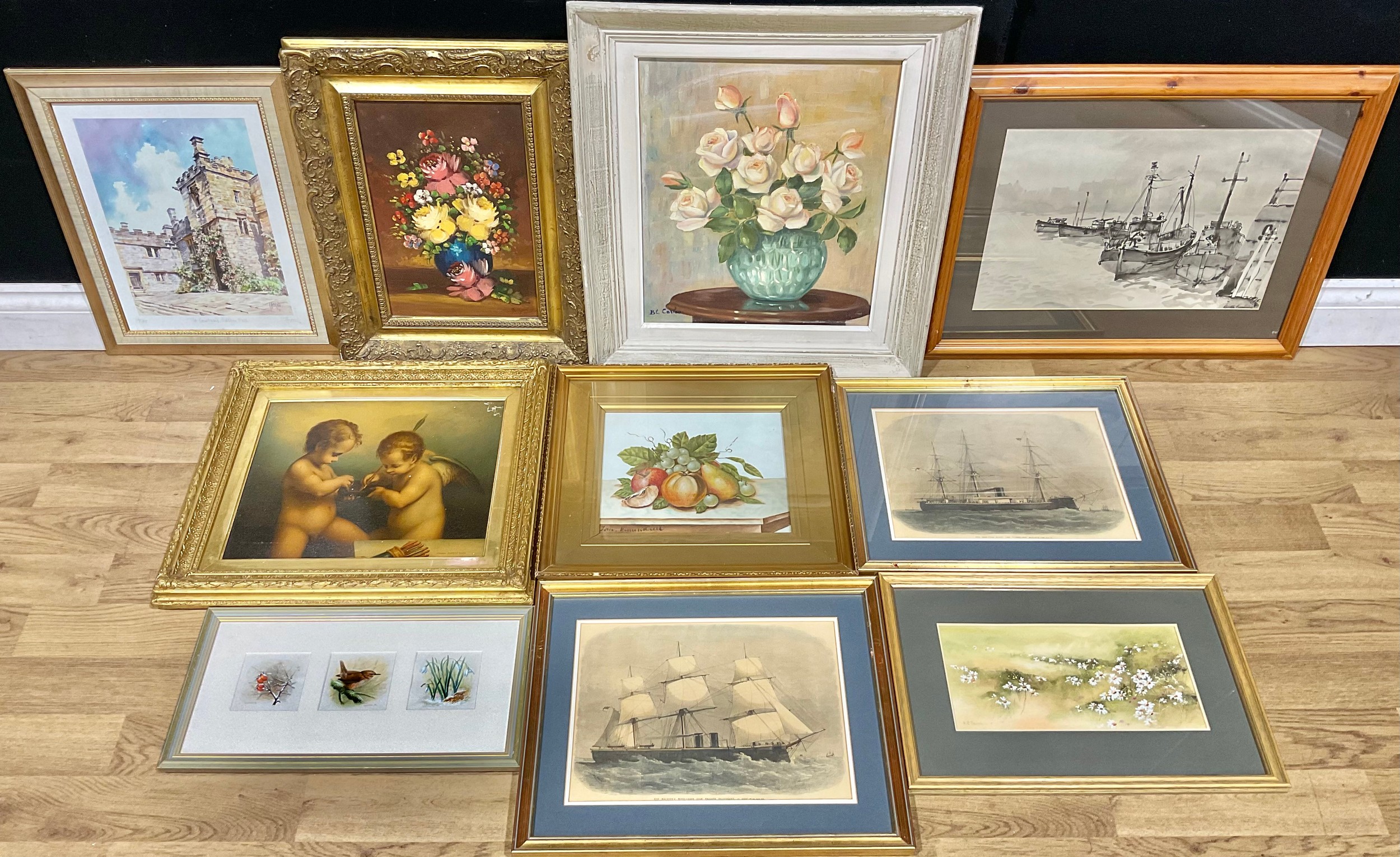 Pictures and Prints - Brian Rushton, a set of three, Studies from Nature, signed, mixed media, each 8cm x 8.5cm, framed as one; B. E. Theobald, Flower Meadow, signed, watercolour, 14.5cm x 32cm; B. L. Carleo, Roses in a Vase, signed, oil on canvas, 45cm x 36.5cm; other original works; etc (10)