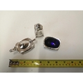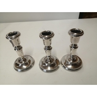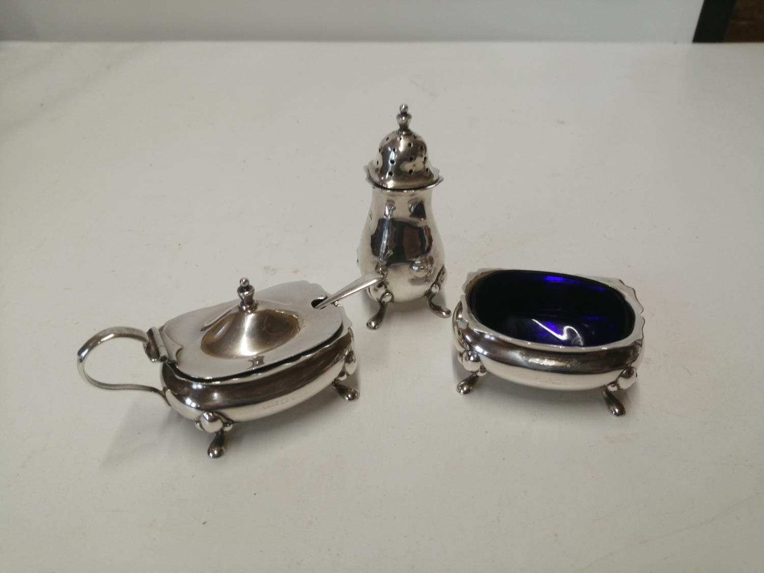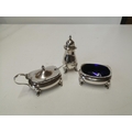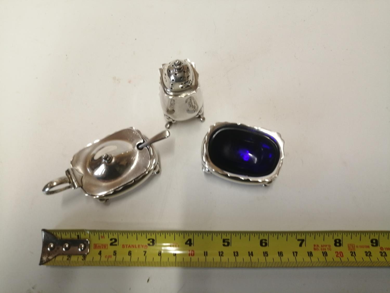 Silver cruet set : pepper pot, salt and mustard with blue glass liners, marks rubbed London Walker and Hall pepper 92 g