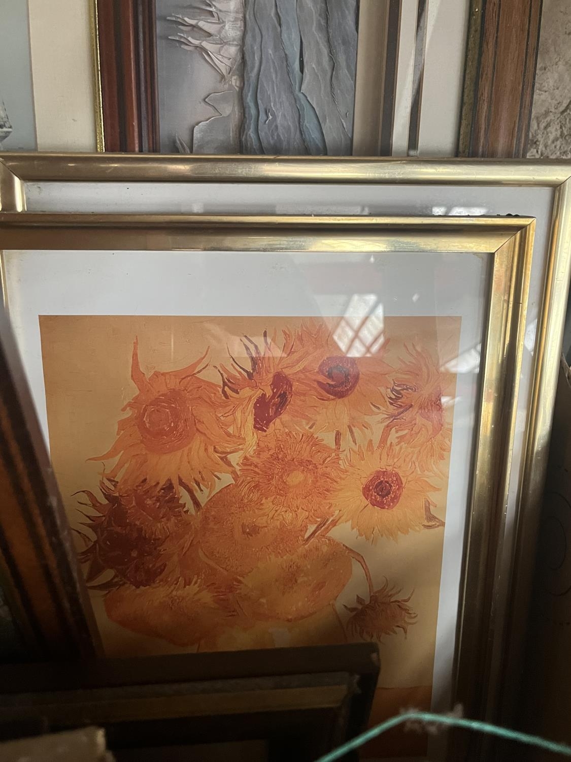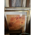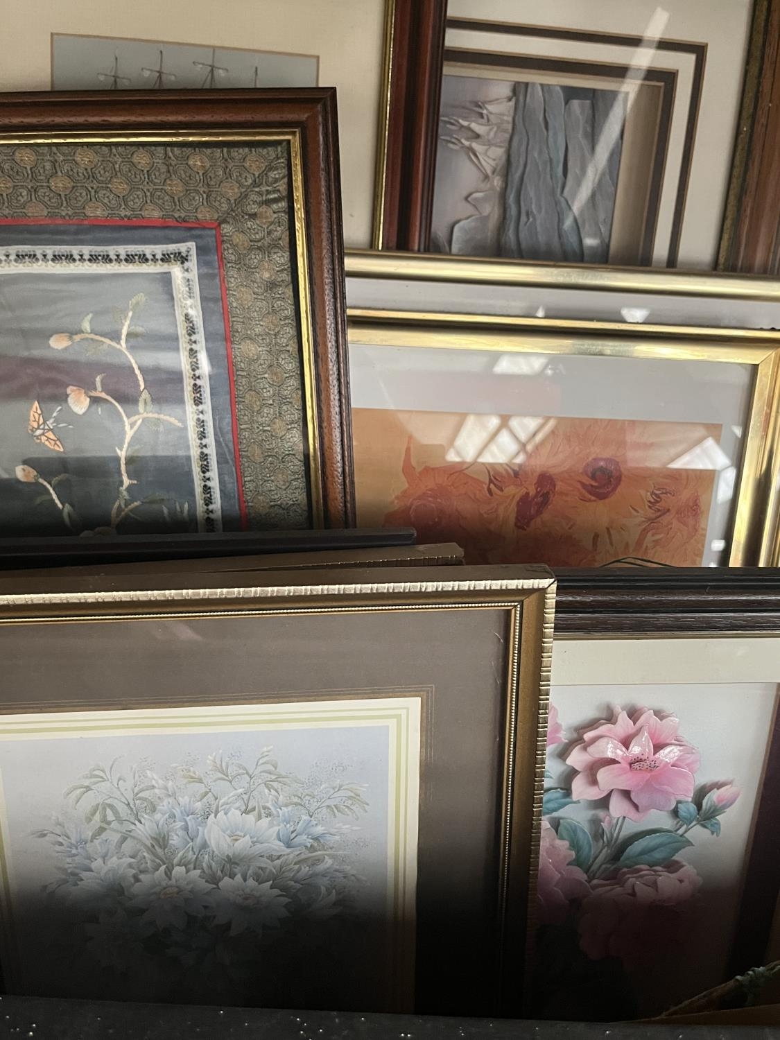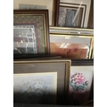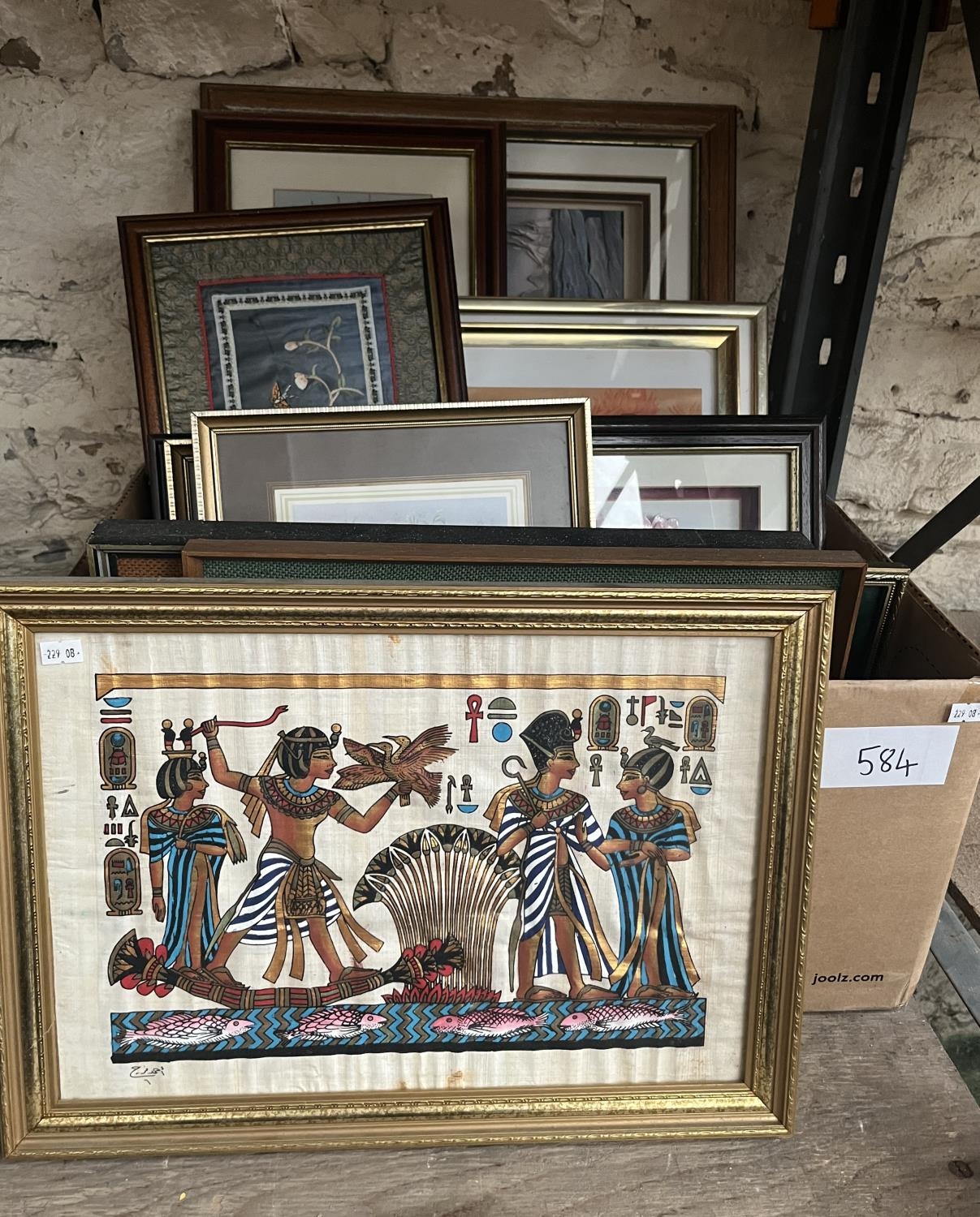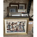 Quantity of framed and glazed prints, silk art work and Egyptian papayas artwork etc