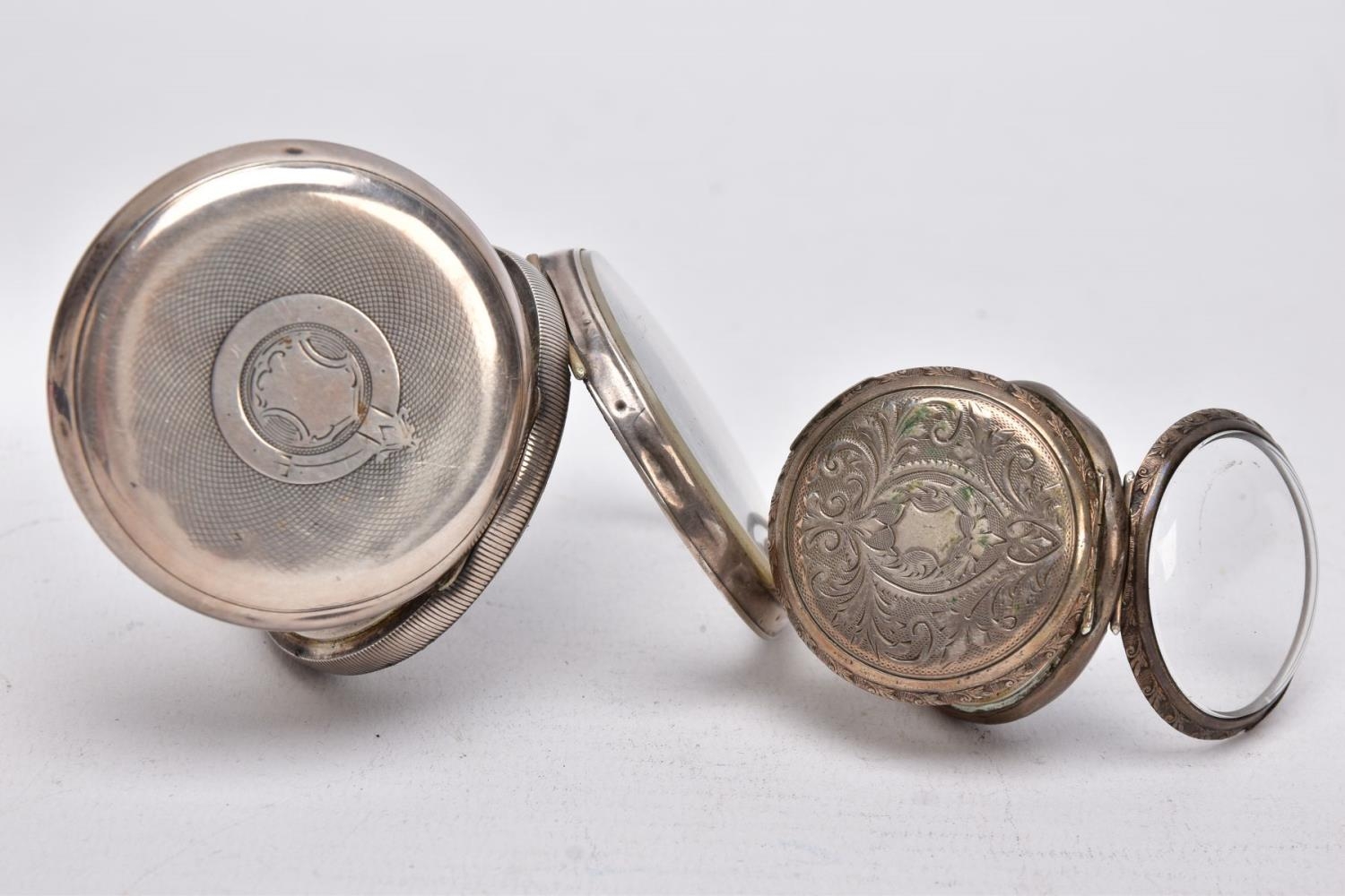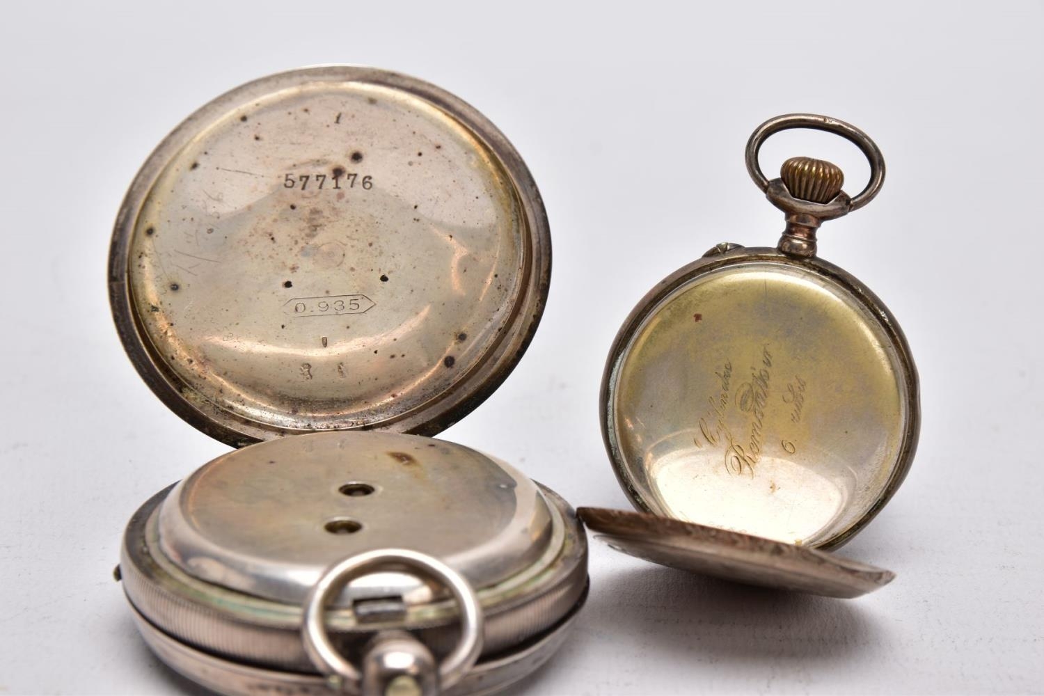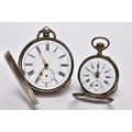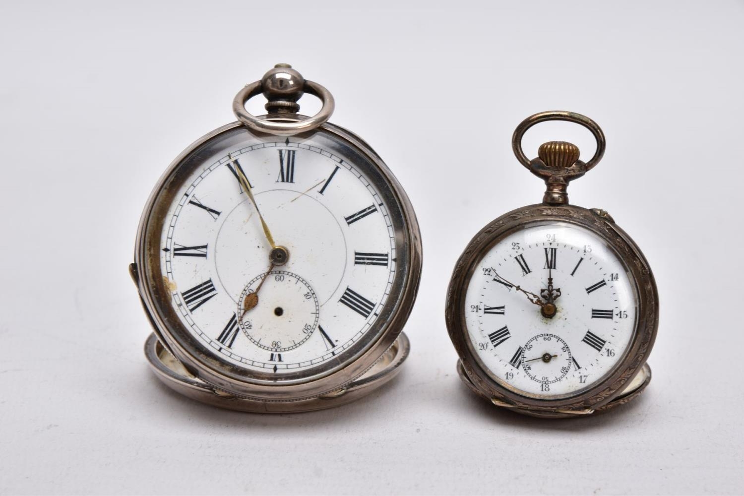 TWO OPEN FACED POCKET WATCHES, the first with a round white dial, Roman numerals, seconds subsidiary dial at the six o'clock position, within an engine turn design case with a vacant cartouche, stamped 0.935 Swiss control marks to the case back, approximate case width 56.1mm, also with two keys, together with a smaller watch with a round white dial, Roman numerals, second subsidiary dial at the six o'clock position, gold tone hands, within a decorative foliate and scroll case with a vacant cartouche, stamped 0.800 to the case back, approximate case width 41.4mm