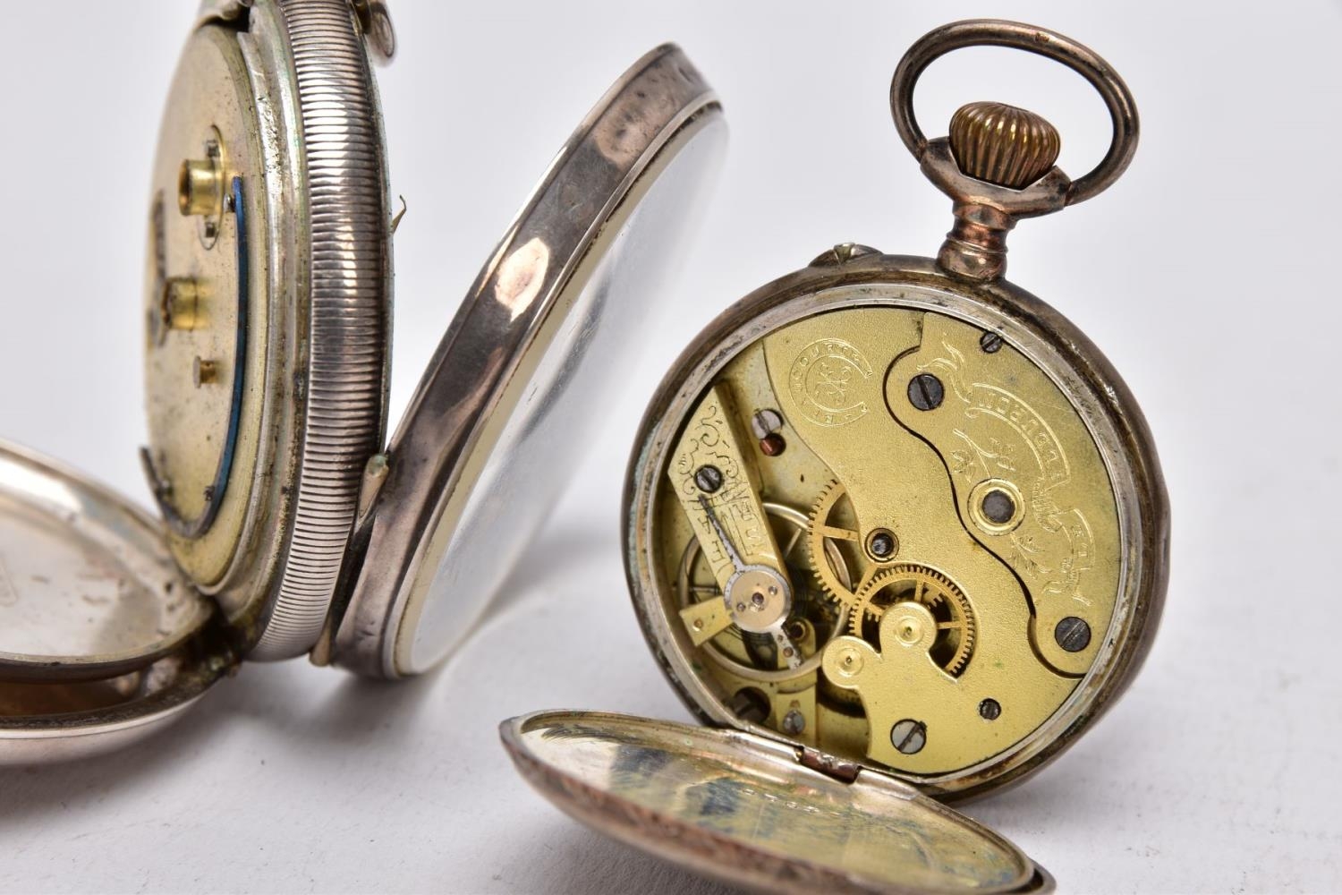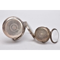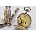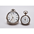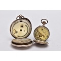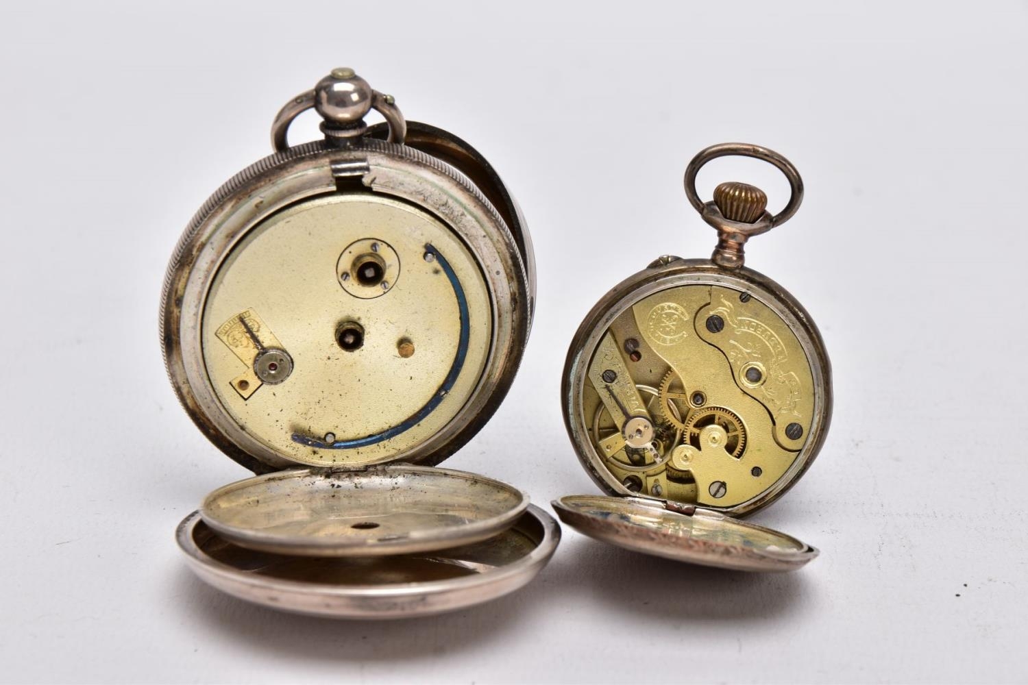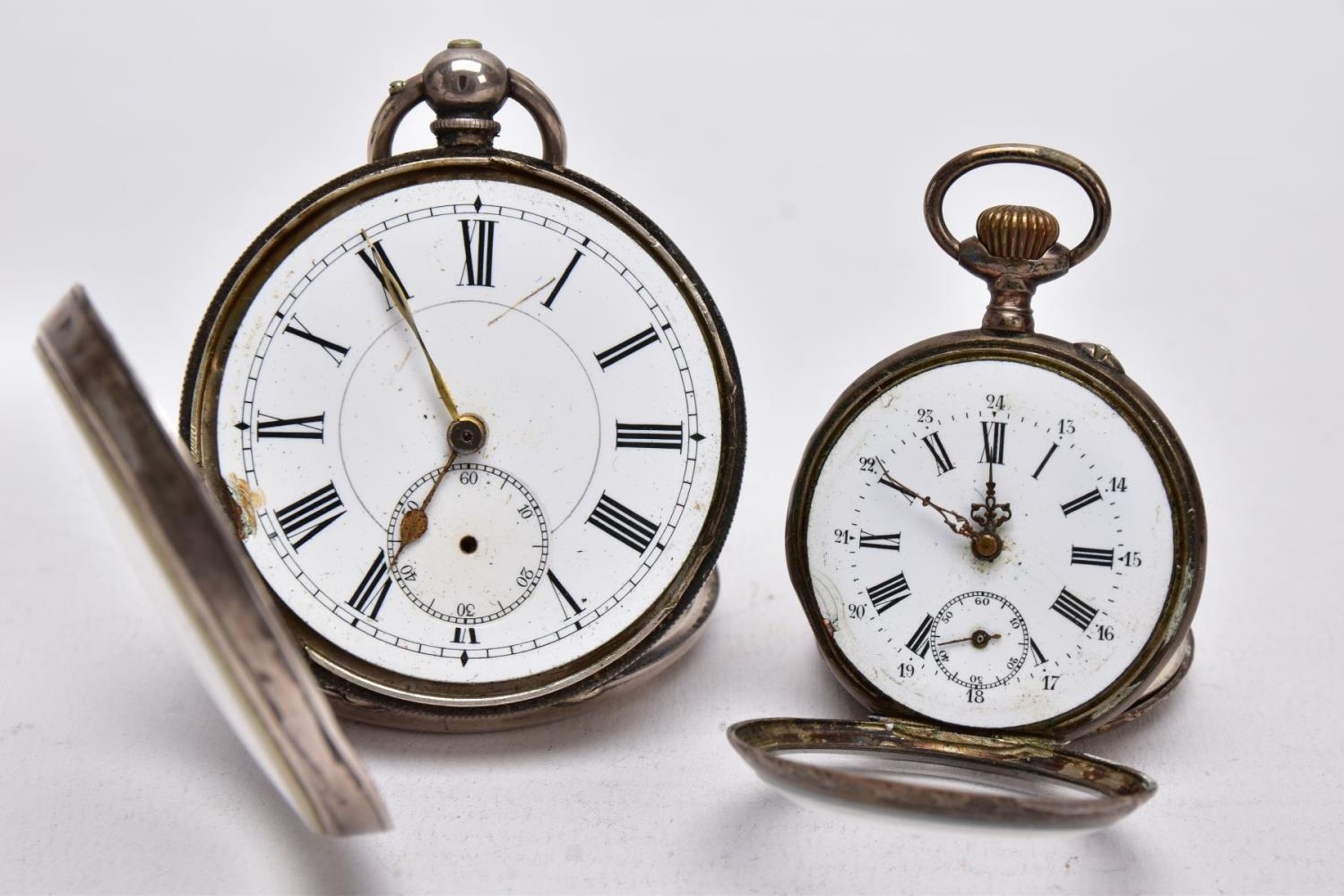 TWO OPEN FACED POCKET WATCHES, the first with a round white dial, Roman numerals, seconds subsidiary dial at the six o'clock position, within an engine turn design case with a vacant cartouche, stamped 0.935 Swiss control marks to the case back, approximate case width 56.1mm, also with two keys, together with a smaller watch with a round white dial, Roman numerals, second subsidiary dial at the six o'clock position, gold tone hands, within a decorative foliate and scroll case with a vacant cartouche, stamped 0.800 to the case back, approximate case width 41.4mm