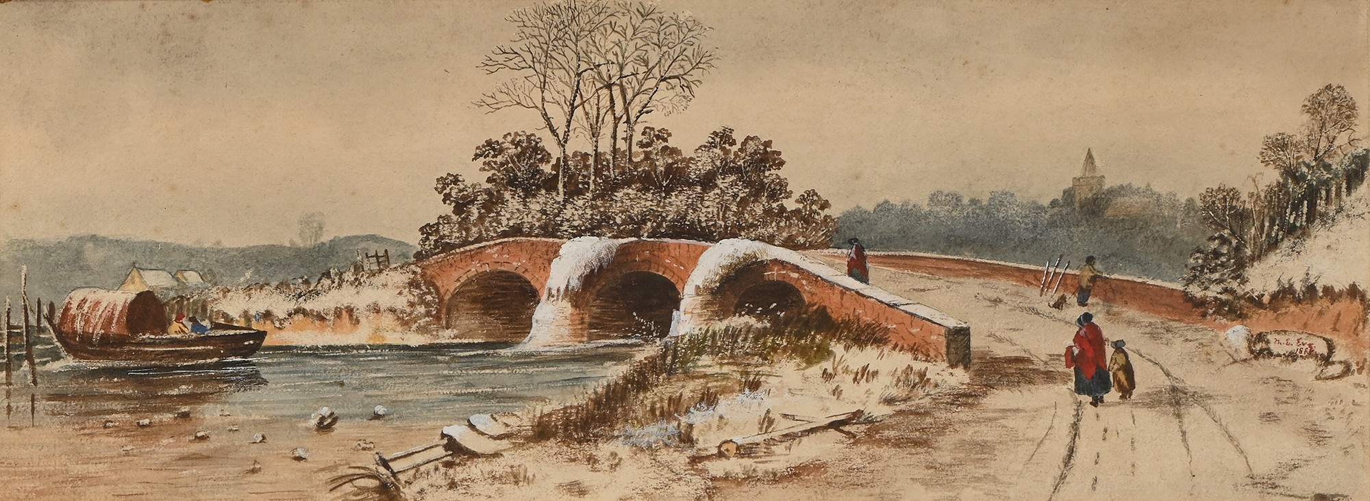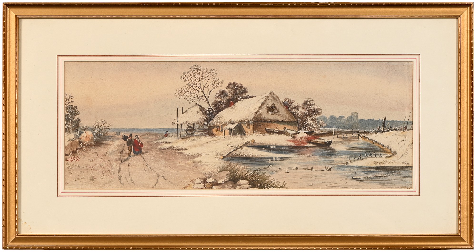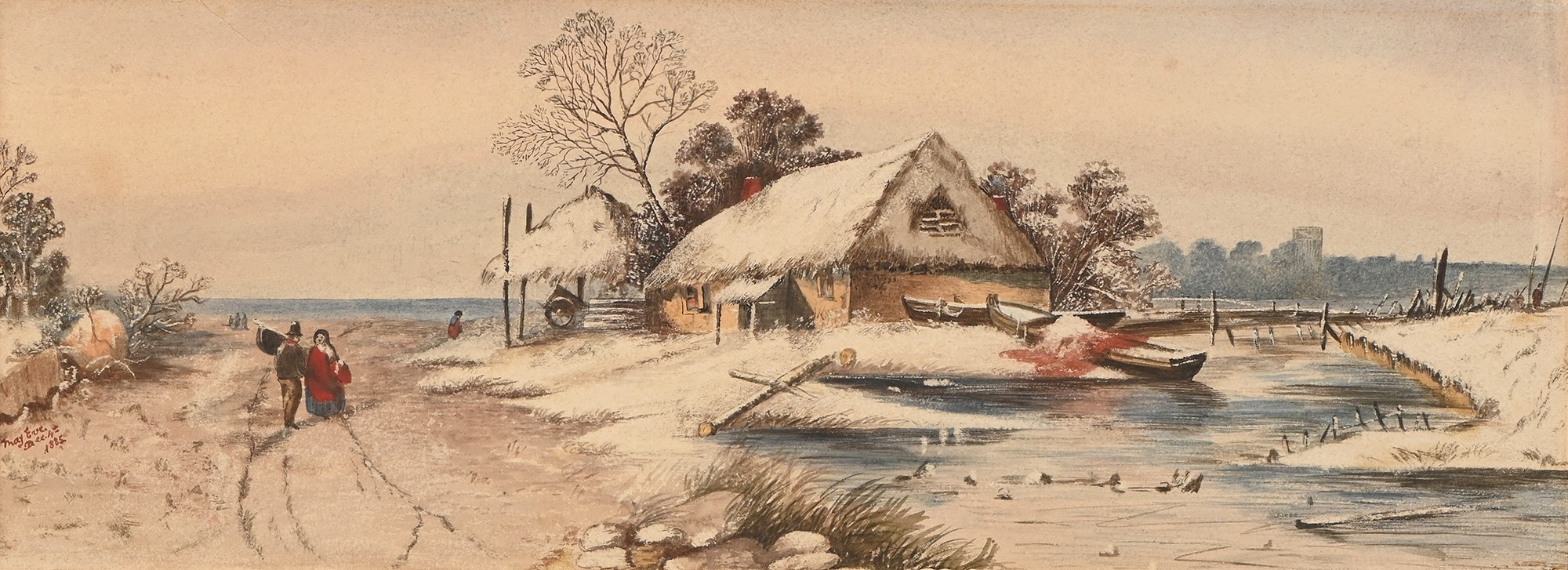A. Beebe, second-half 19th century - Courting Renaissance Figures, signed and dated 1875, watercolour, 47.5 x 35cm, English School, 19th century - Alpine Mountainscape, watercolour, picked-out in gouache, 23 x 42cm, and a pair of Winter Landscaped by M.E. Eve, signed and dated 1885, watercolour and gouache, 17 x 47.5cm (4)