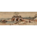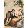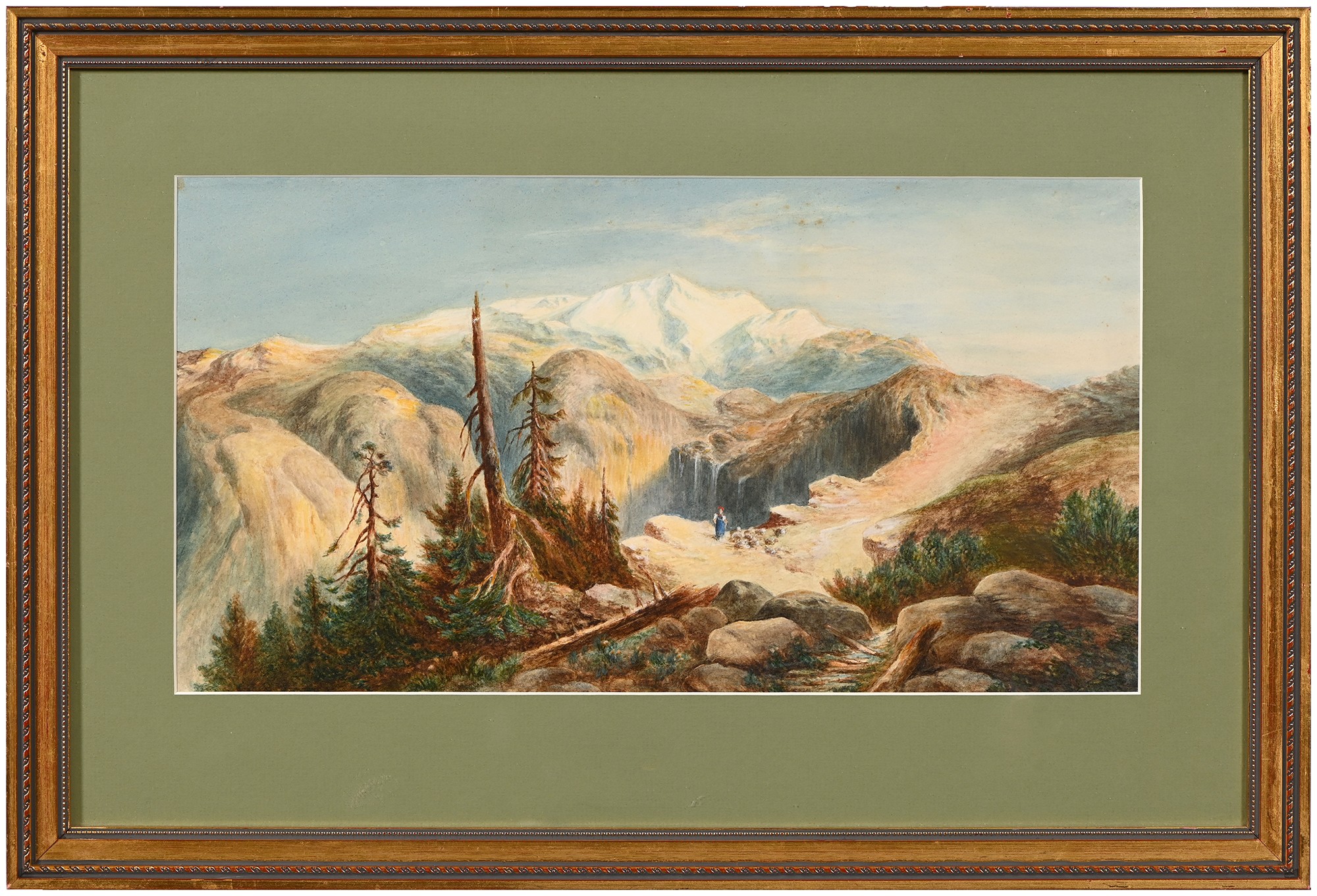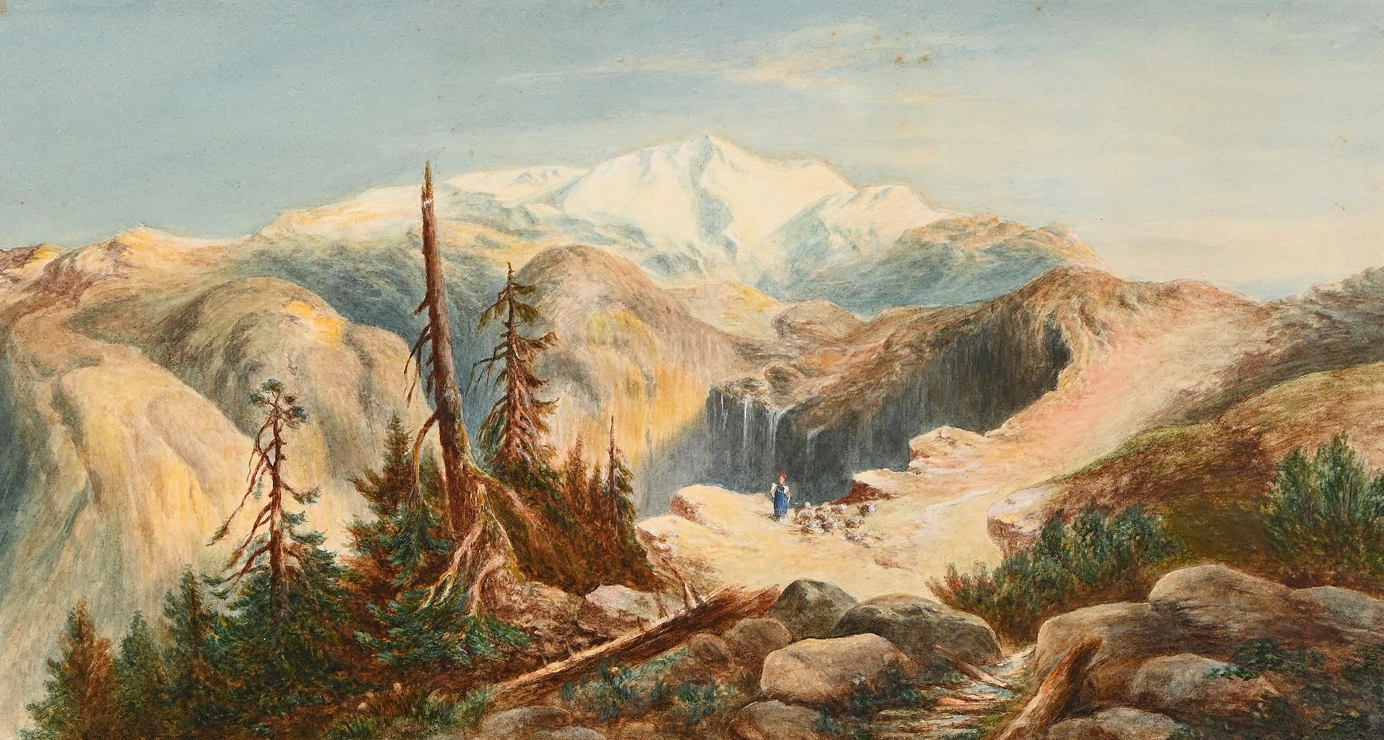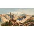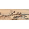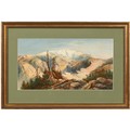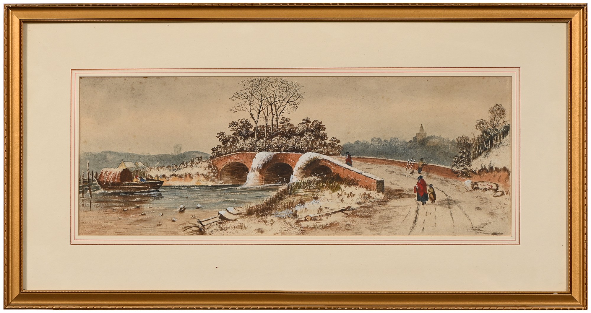 A. Beebe, second-half 19th century - Courting Renaissance Figures, signed and dated 1875, watercolour, 47.5 x 35cm, English School, 19th century - Alpine Mountainscape, watercolour, picked-out in gouache, 23 x 42cm, and a pair of Winter Landscaped by M.E. Eve, signed and dated 1885, watercolour and gouache, 17 x 47.5cm (4)