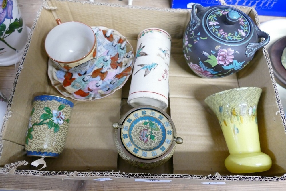 Chinese Satsuma Vase decorated with Birds, Small Vasart Spill Vase, Cloisonne Ashtray, etc
