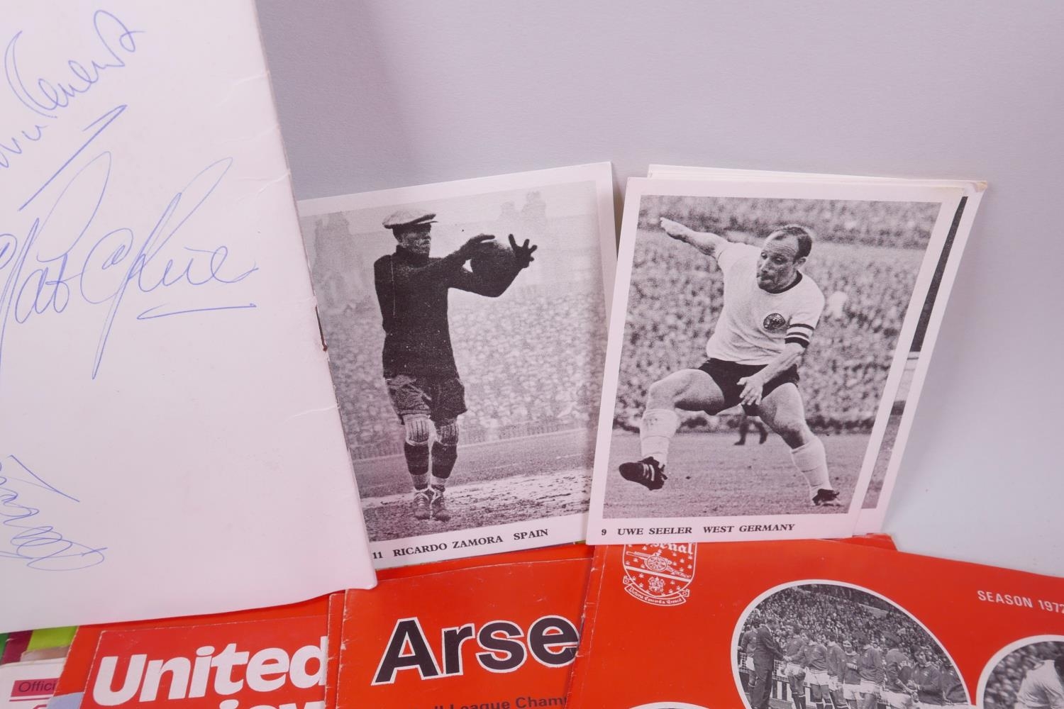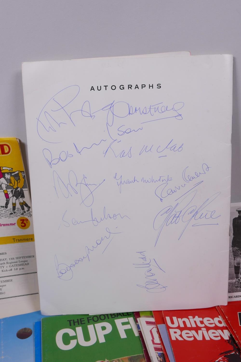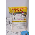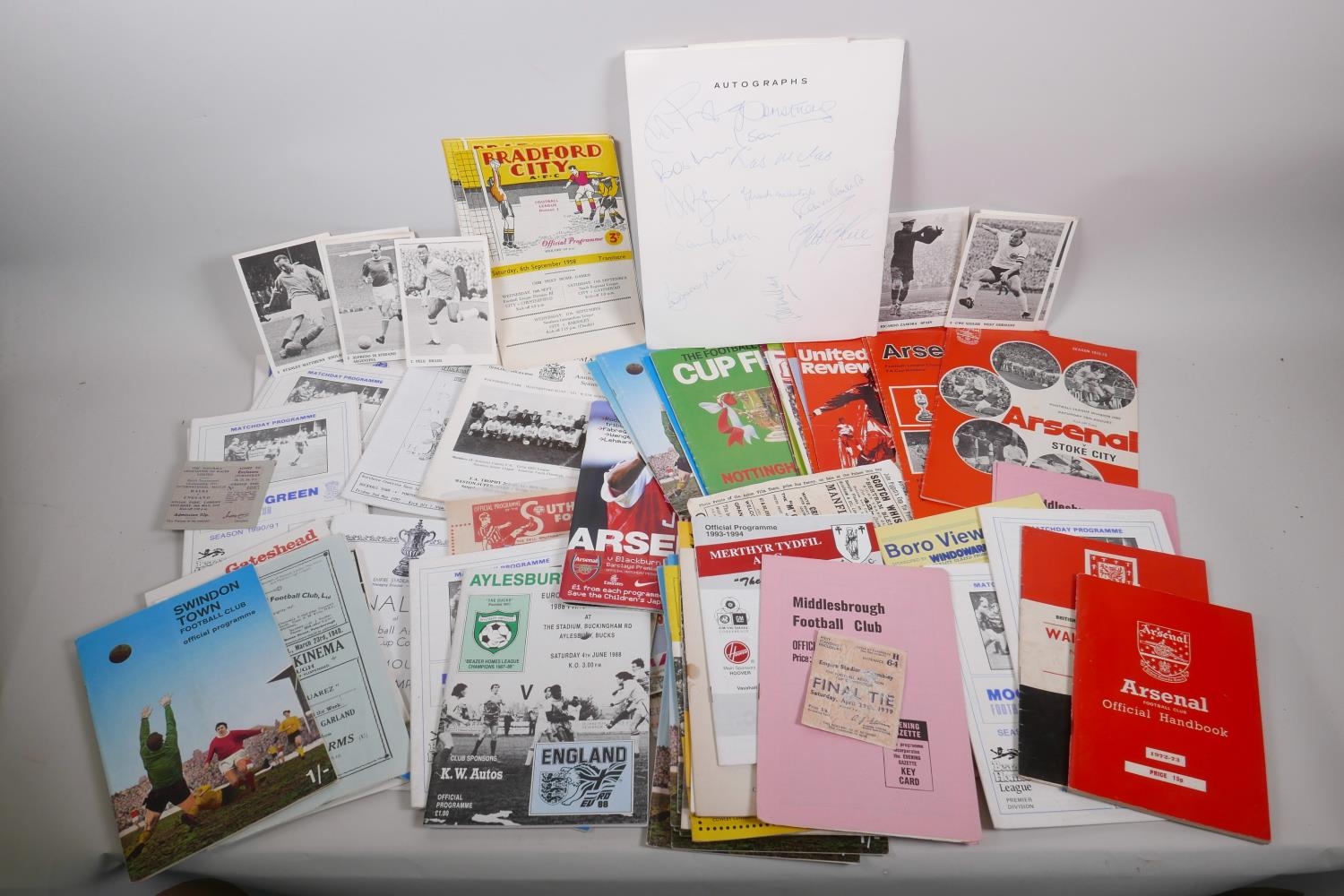 A George Armstrong of Arsenal Testimonial Dinner and Ball programme, 1974, with menu, raffle ticket and seating plan, autographed, and a collection of football programmes from Bradford City FC, 1958 and 1962, Swindon Town 1969, Leicester City 1969-70, Watford 1969-70, Huddersfield Town, 1964, Aresenal 1970s