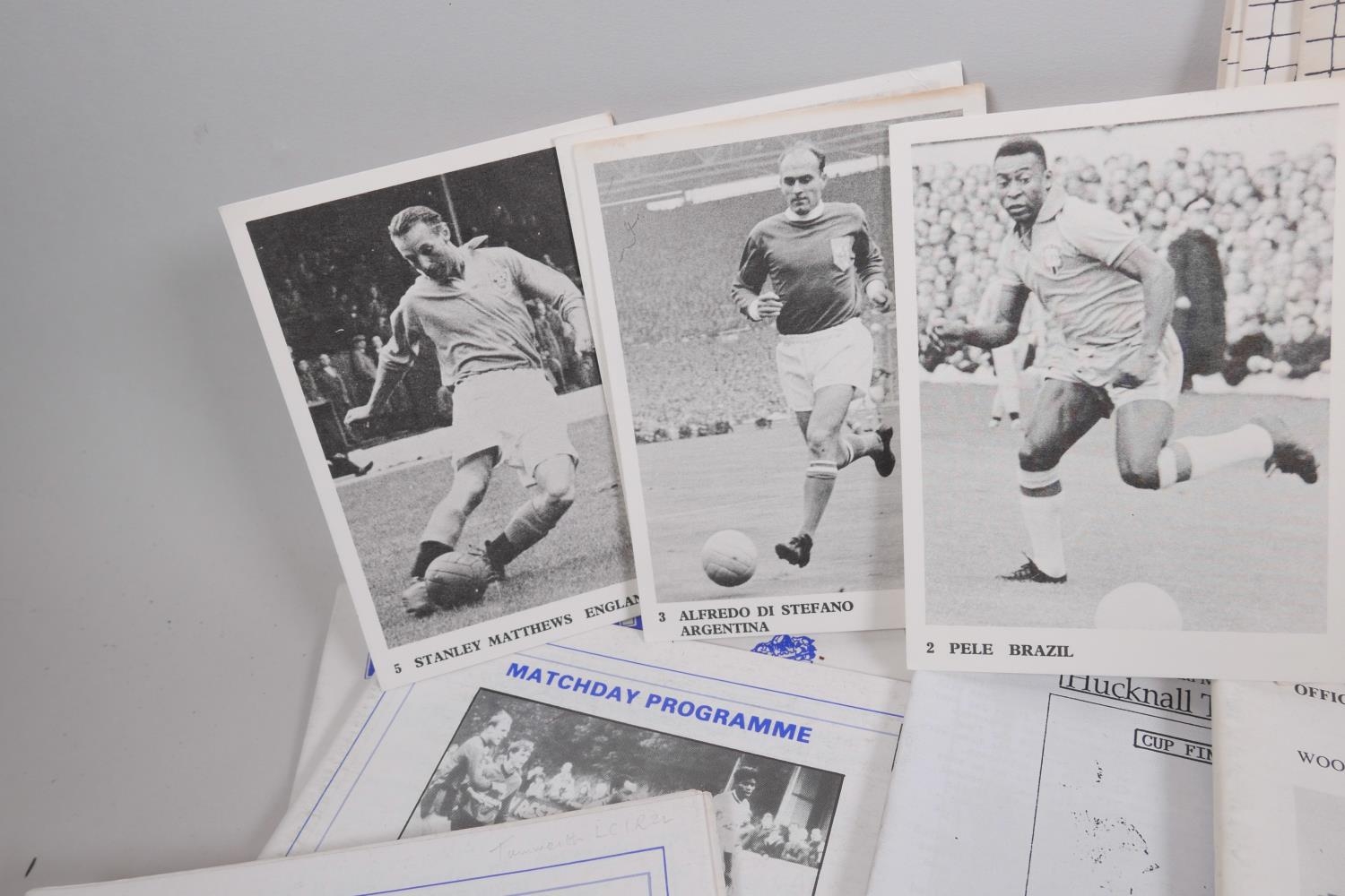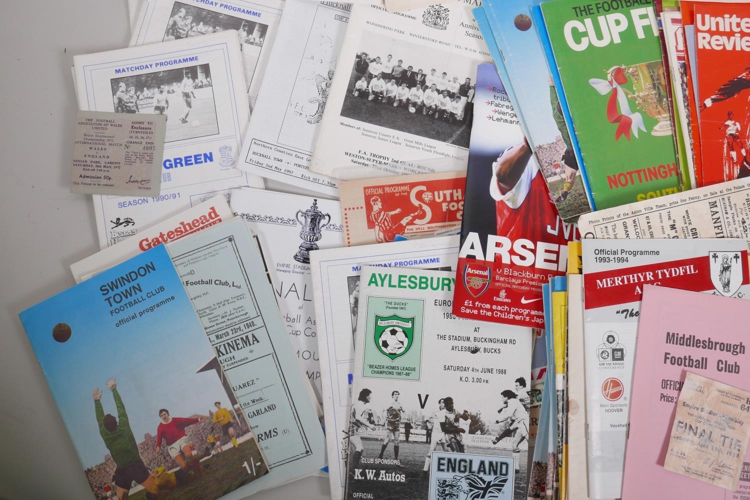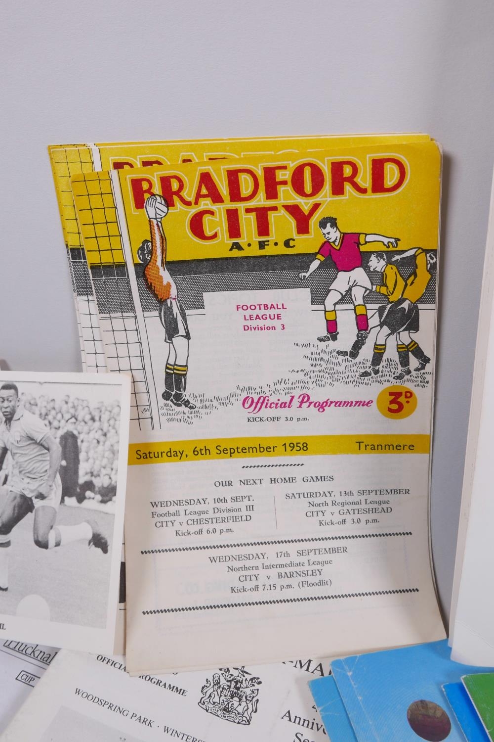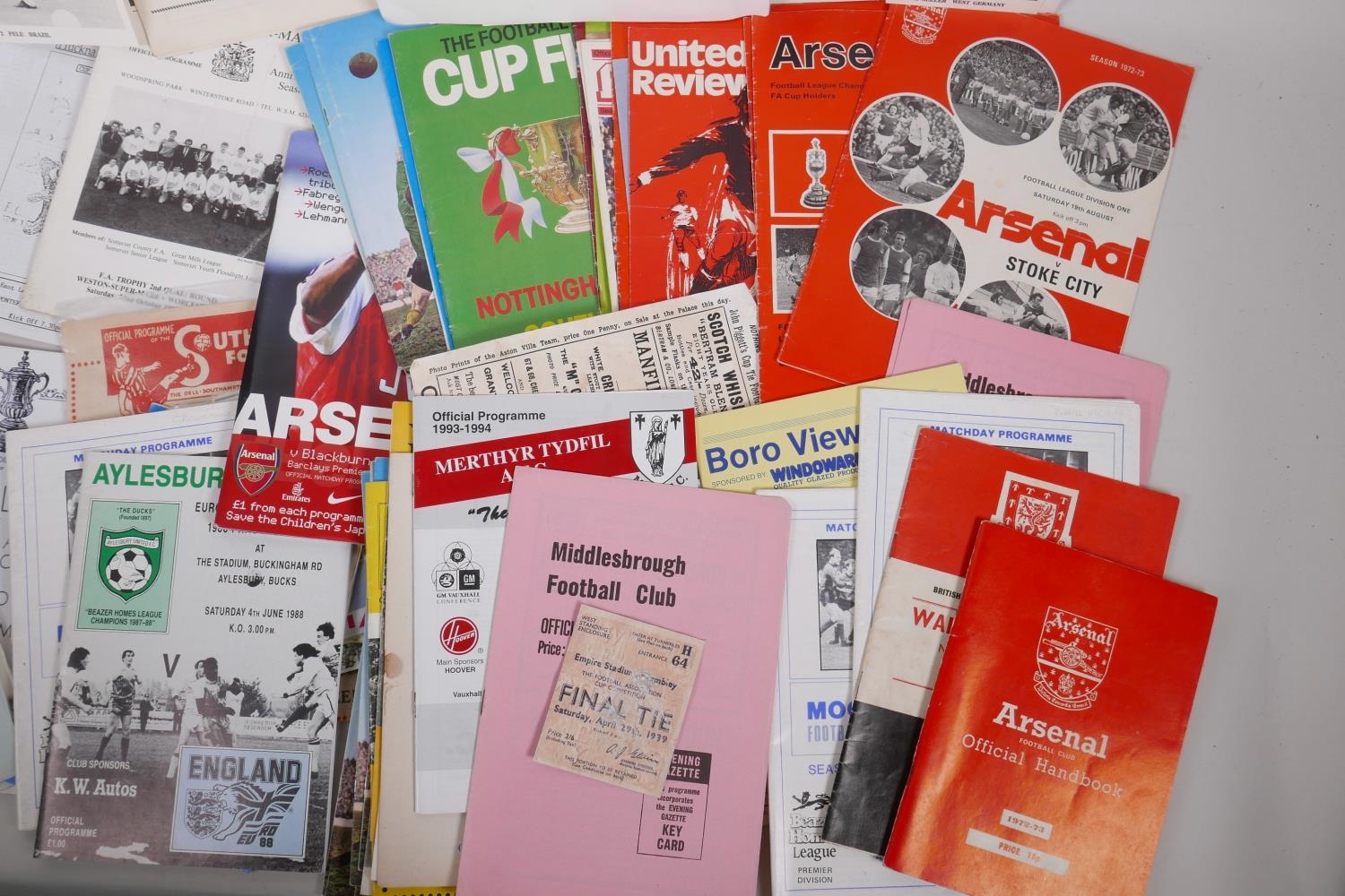 A George Armstrong of Arsenal Testimonial Dinner and Ball programme, 1974, with menu, raffle ticket and seating plan, autographed, and a collection of football programmes from Bradford City FC, 1958 and 1962, Swindon Town 1969, Leicester City 1969-70, Watford 1969-70, Huddersfield Town, 1964, Aresenal 1970s