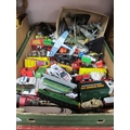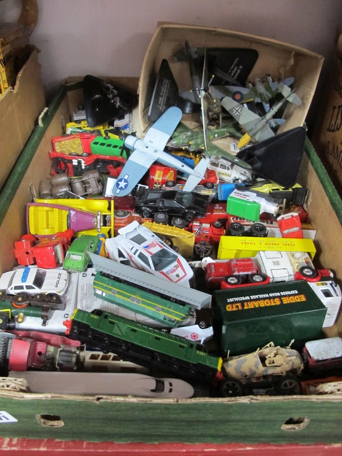 A Large Box of Loose Vintage Die Cast Vehicles and Planes on Stands