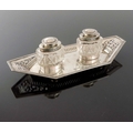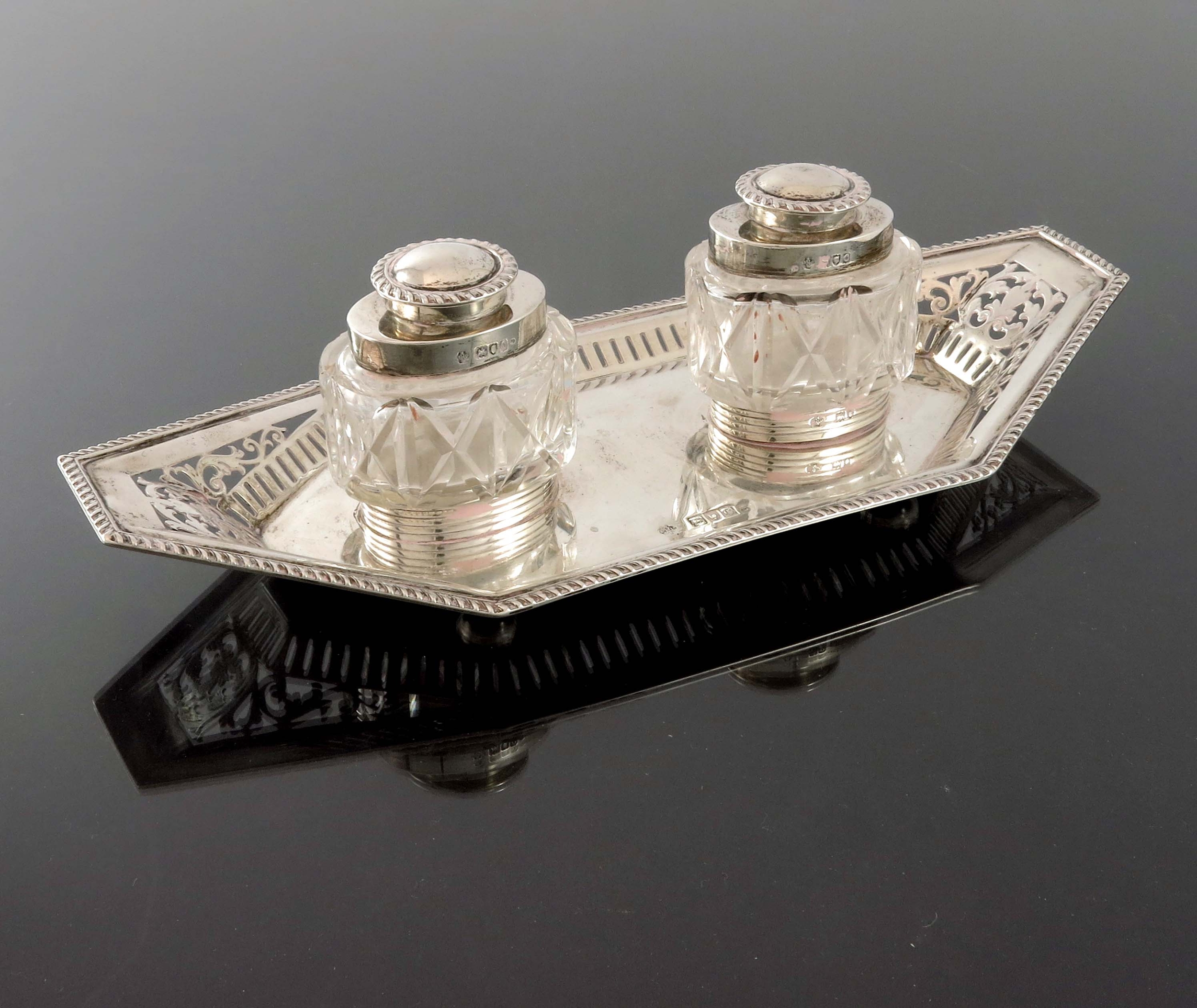 A Victorian silver double inkstand, William Hutton, London 1898, the elongated octagonal tray pierced with fluting an foliate scrolls, the two cut glass inkwells with hinged gadrooned rims, 27cm long