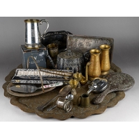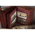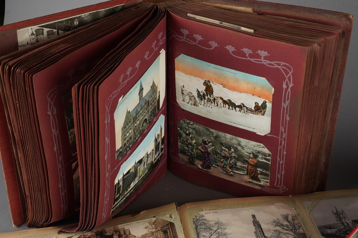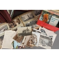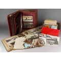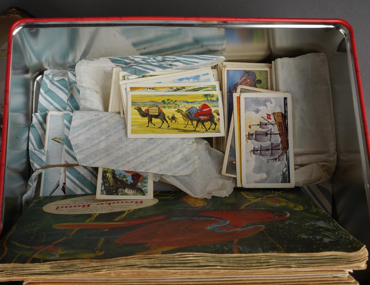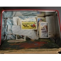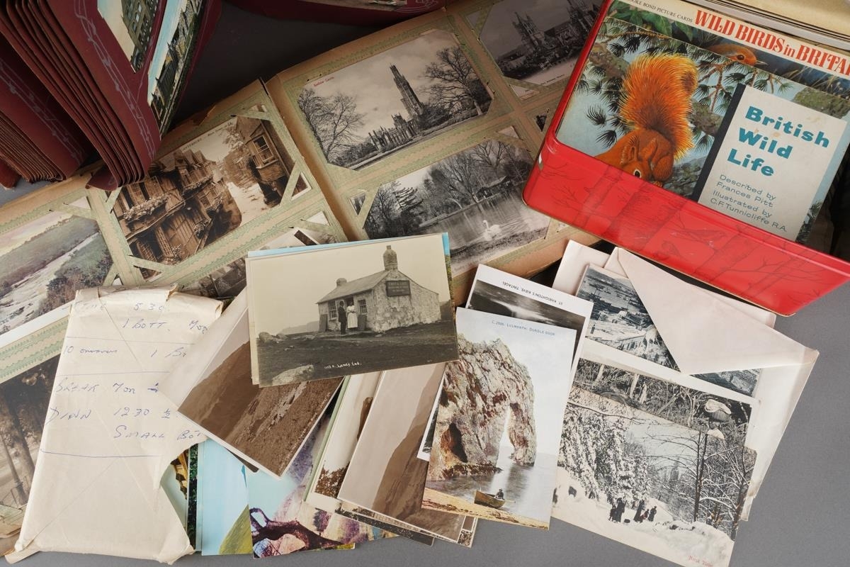 A tin containing various post cards and albums of tea cards and two albums of early 20th century and later topographical post cards and small number of scraps ( 2 bags)
