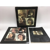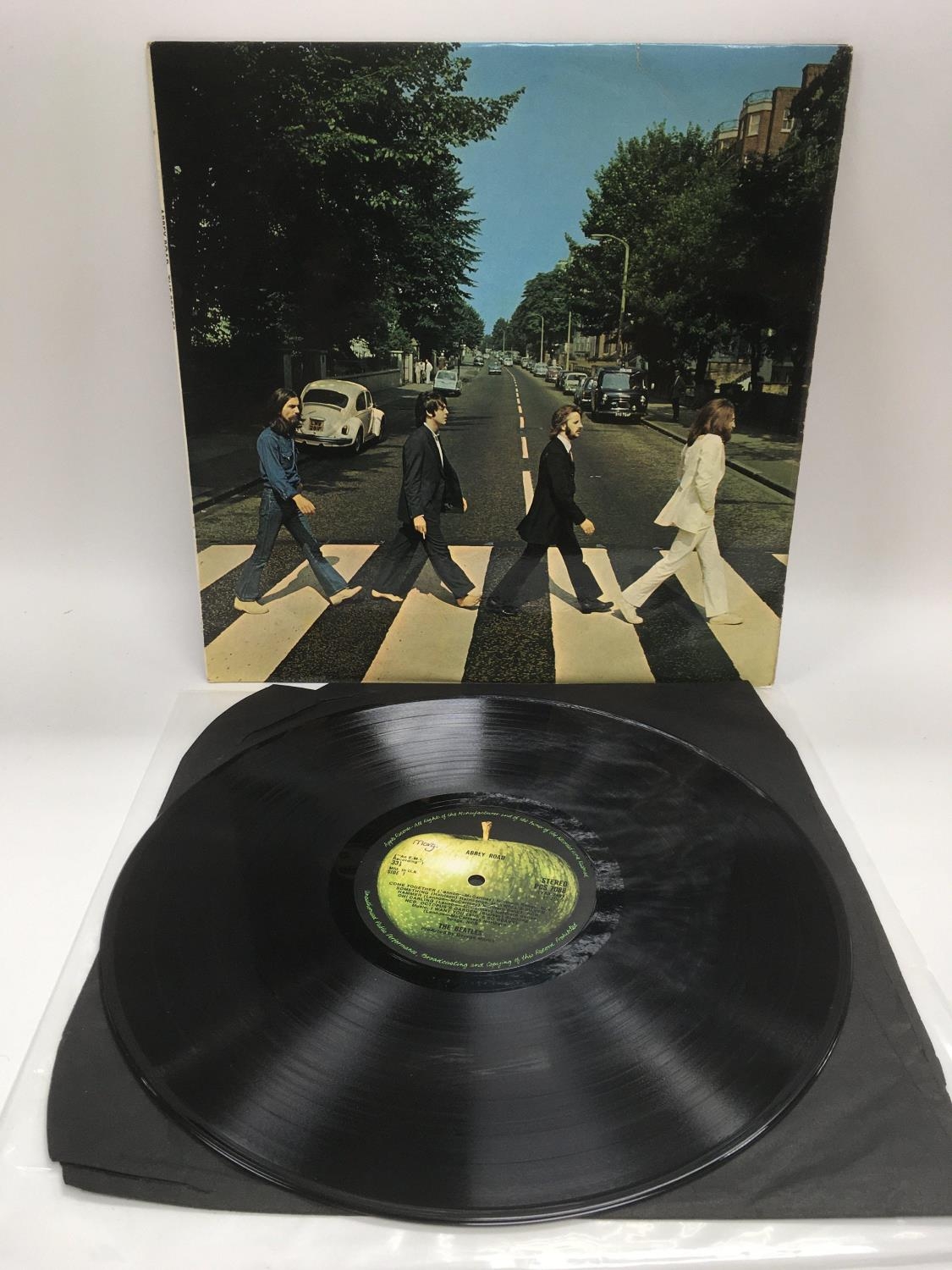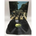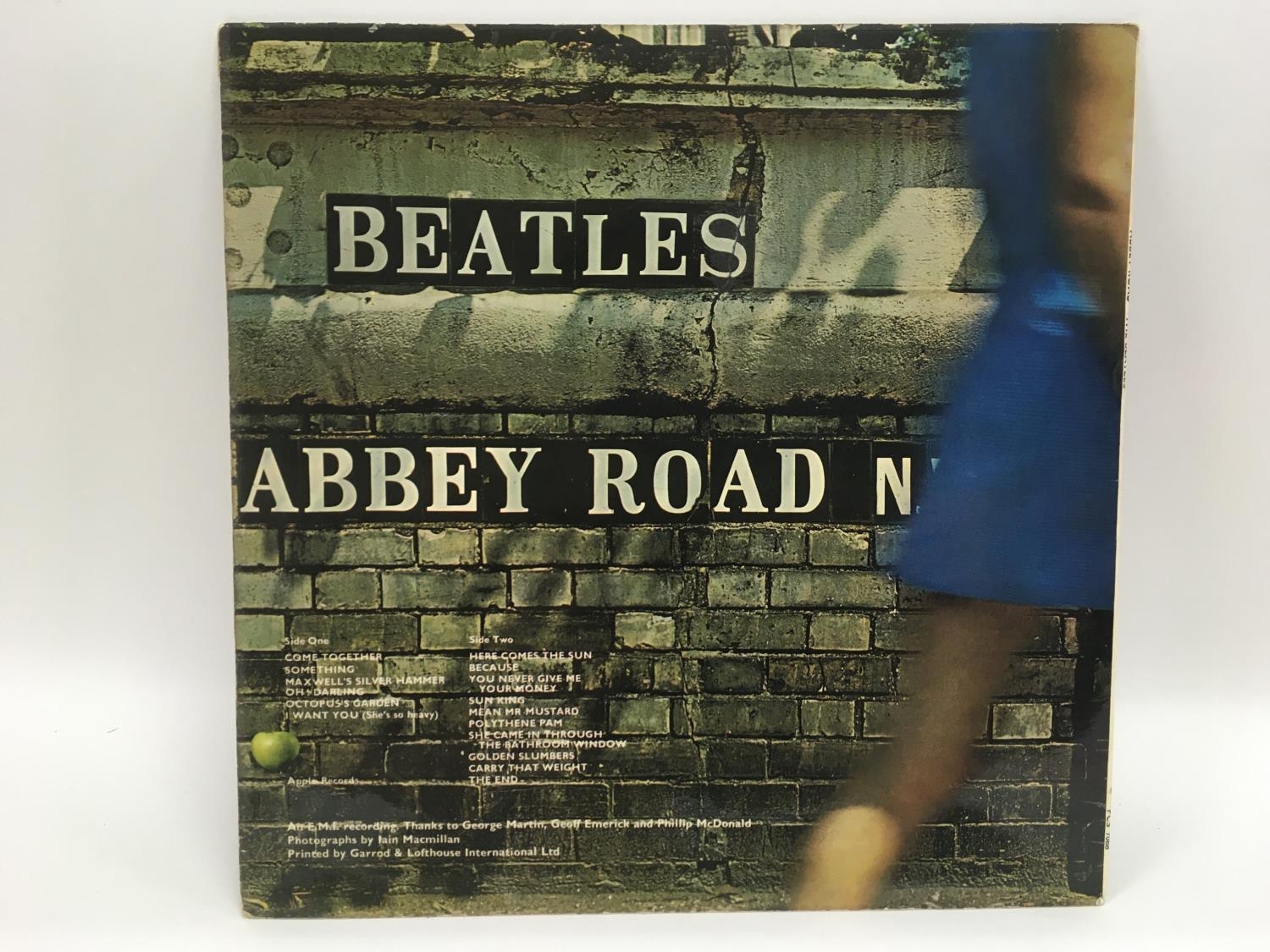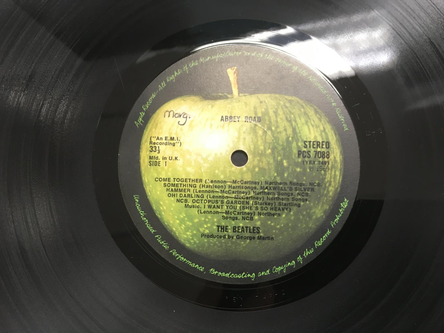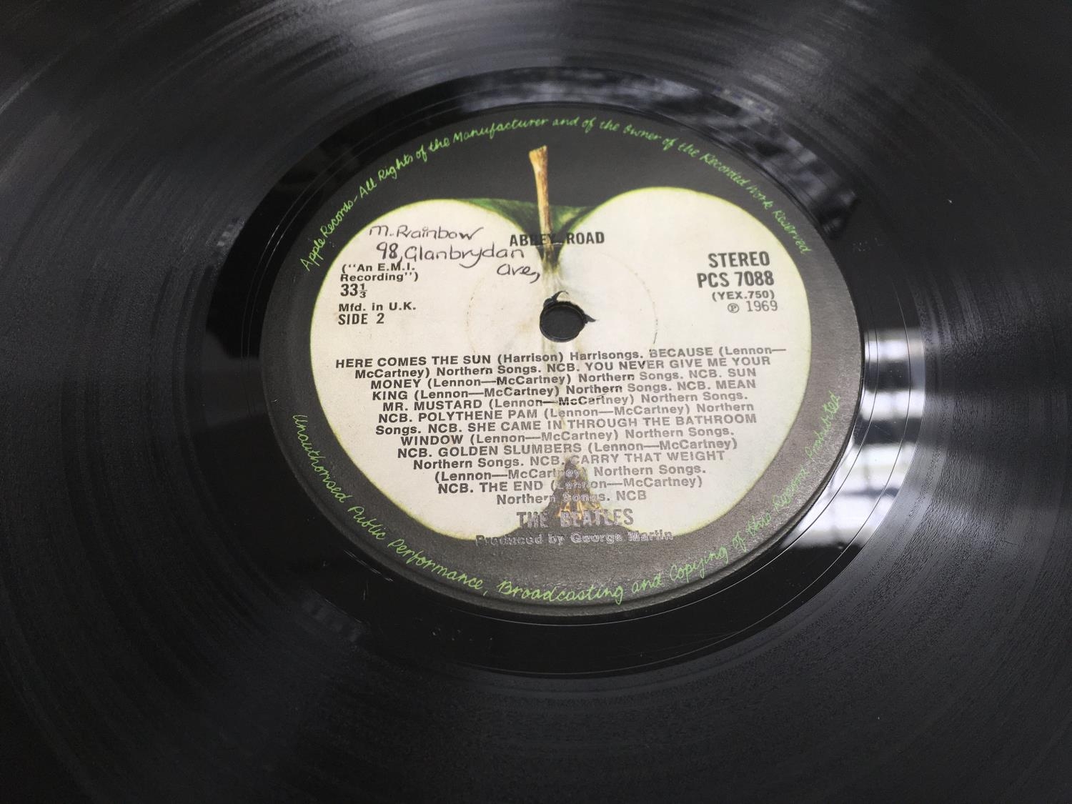 A first UK pressing of The Beatles 'Abbey Road' LP PCS 7088 with misaligned Apple logo on rear sleeve, no credits for 'Her Majesty' on either label or rear sleeve. Complete with black inner sleeve. Sleeve is bent, not in bad condition, vinyl is VG with light scratch through last track on Side 1 and further lighter surface marks to Side 2. Writing on both labels of previous owner.
