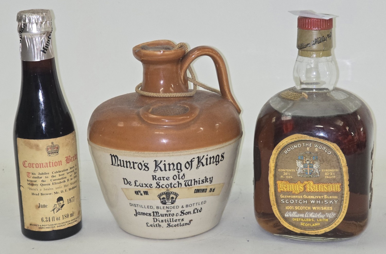 Quantity of vintage alcohol to include 1940's/50's bottle King's Ransom "Round The World" Scotch Whisky, 1960's Munro's King of Kings De Luxe Scotch Whisky and a bottle of 1977 Coronation Brew.