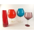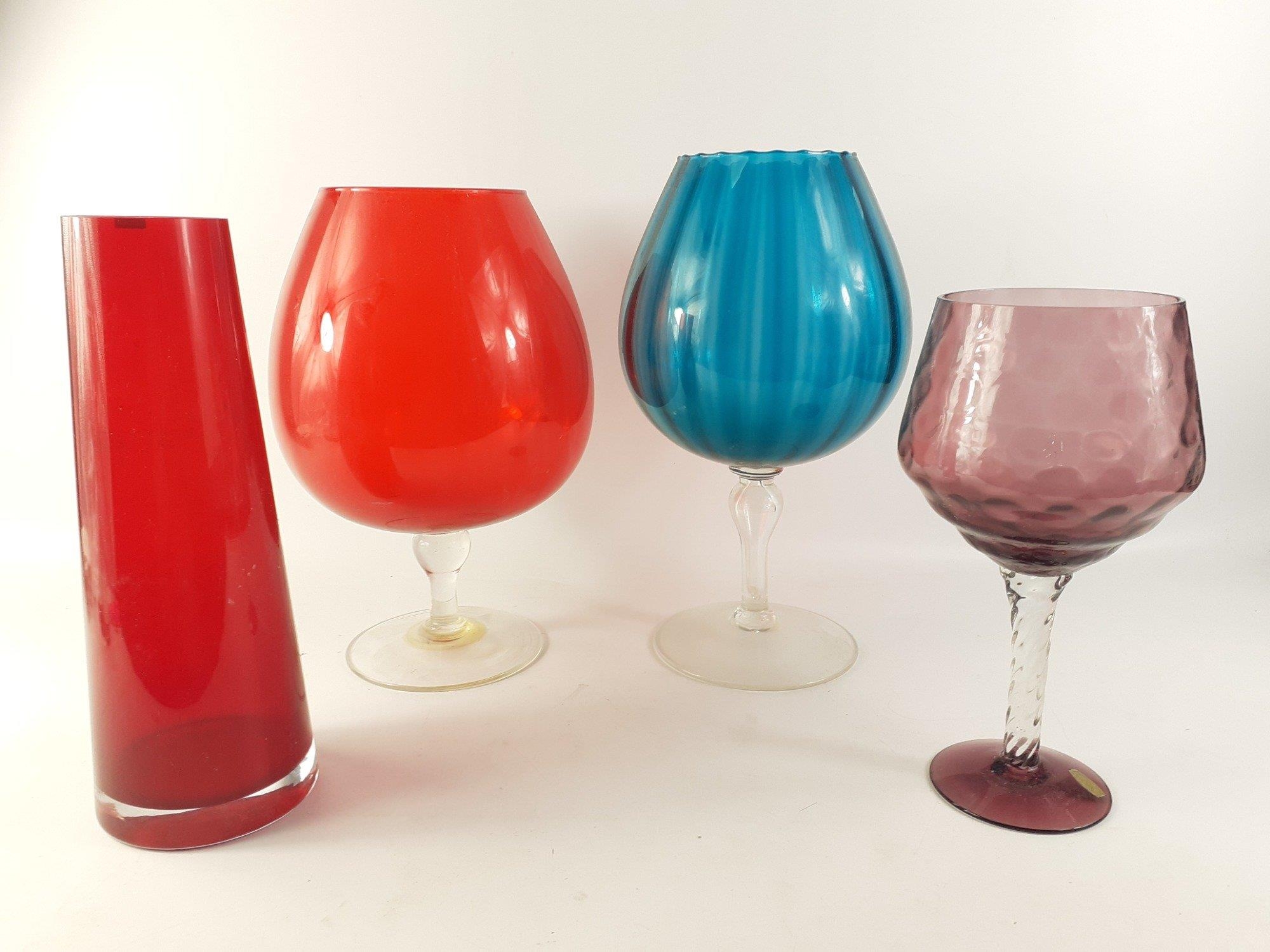 Two stonking brandy balloons one red with clear glass stem (30cm high 12cm dia at rim), and one in ribbed teal (31cm tall, 10cm dia at rim) plus one 25cm high and a Finnish made red glass vase 28cm high