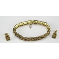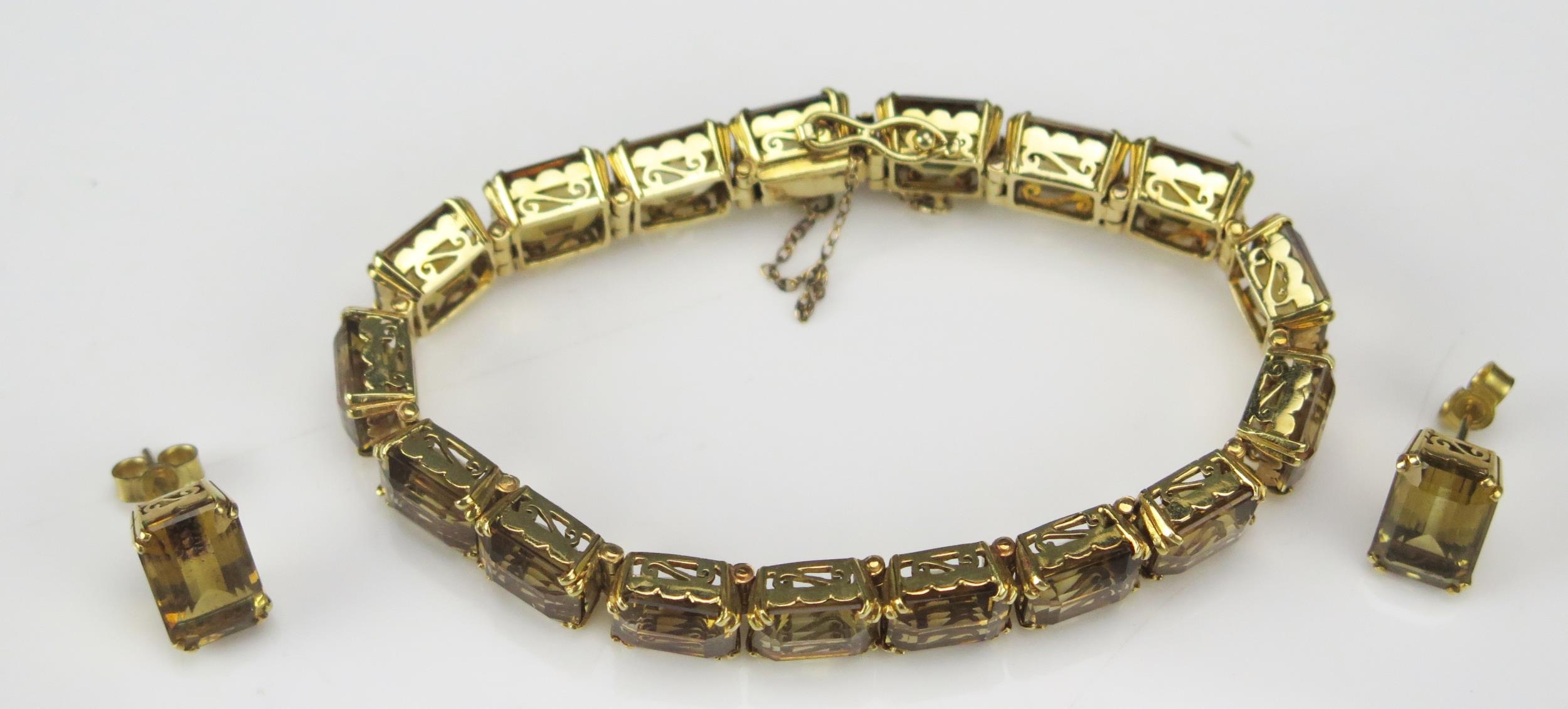A Citrine Bracelet in a high carat precious yellow metal setting with a pair of matching earrings, KEE tests as 18ct, 35.52g. UNLESS OTHERWISE STATED, THE KEE TEST IS A SURFACE TEST ONLY AND IS NOT A GUARANTEE OF GOLD PURITY.