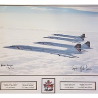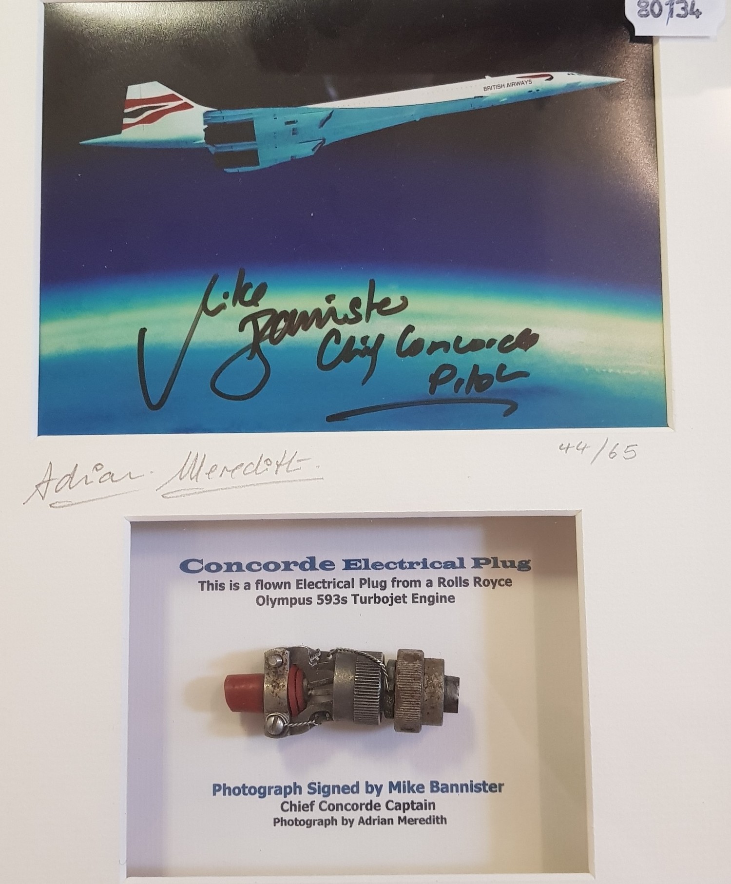 Concorde memorabilia: Concorde Engine Plug, mounted with a photograph signed by Chief Concorde Captain Mike Bannister, photographer, Adrian Meredith, 44/65, 35 x 26 cm