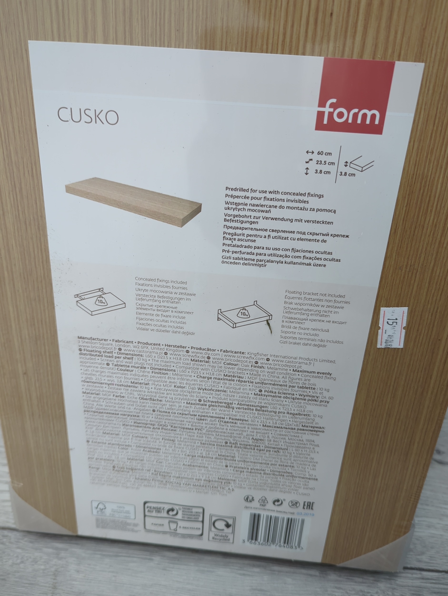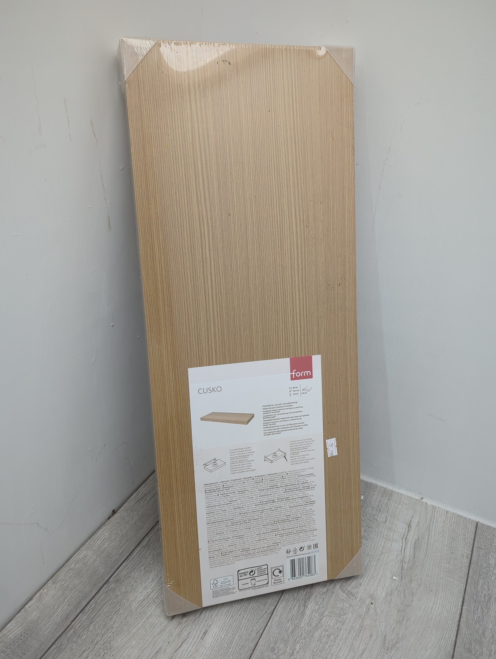 The Form Cusko Shelf is a sleek and stylish shelving unit designed for seamless installation with concealed fixings. Its clean design allows it to blend effortlessly into various decor styles. The packaging provides detailed instructions for mounting, ensuring easy setup.