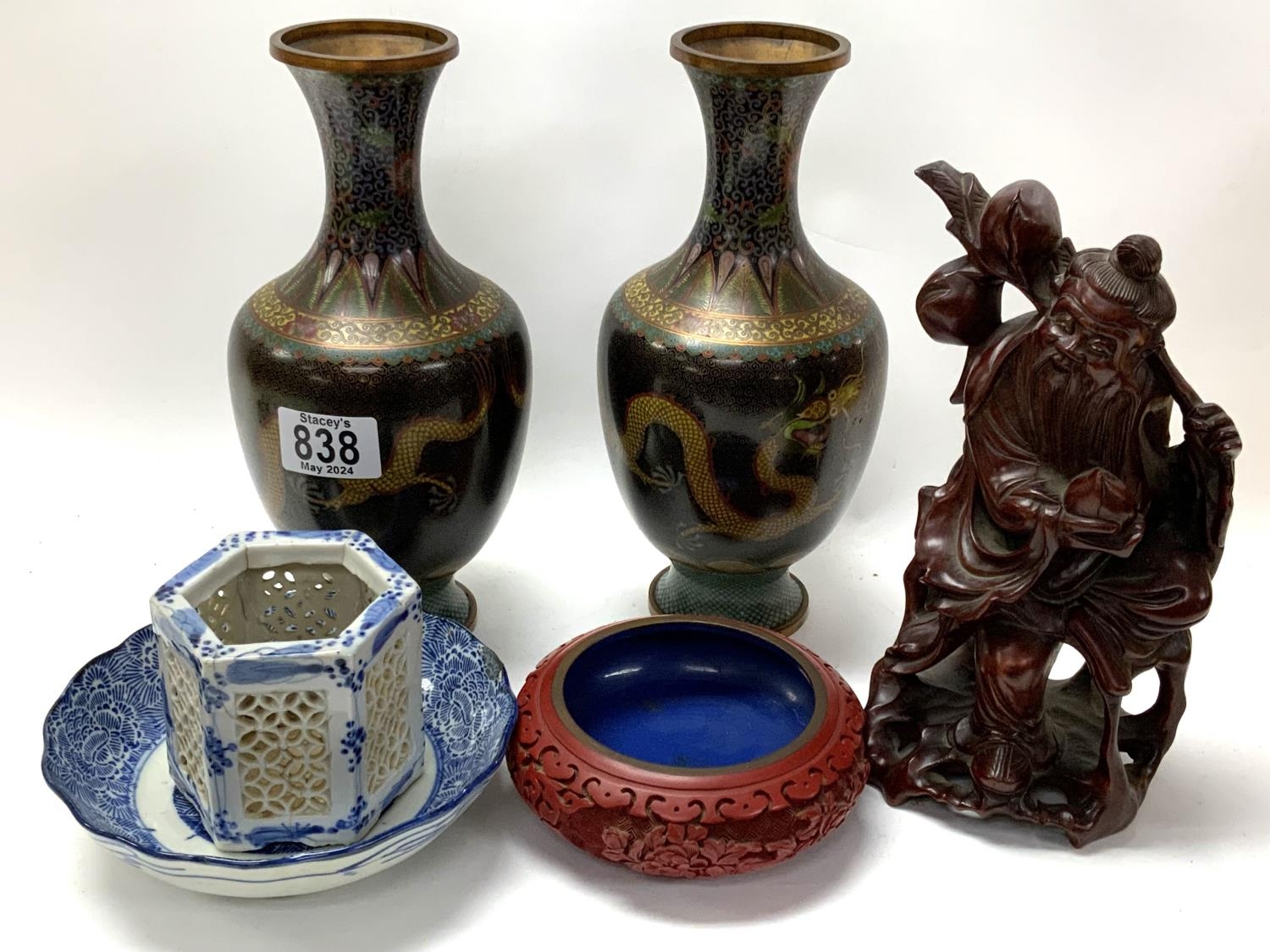 Mixed oriental lot, a pair of Chinese Bronze Cloisonné vases, Carved wooden deity figure, carved cinnabar bowl, etc.