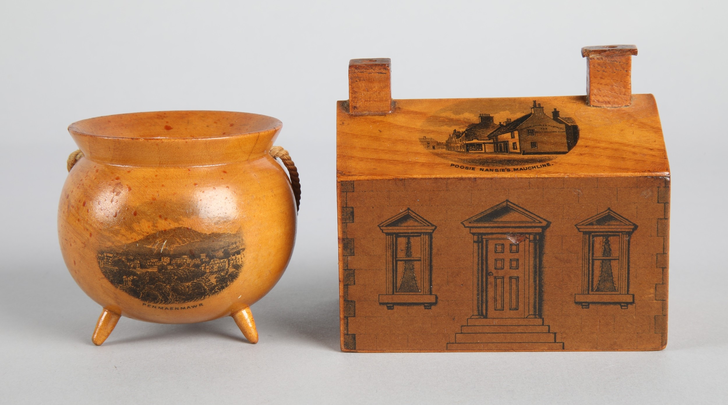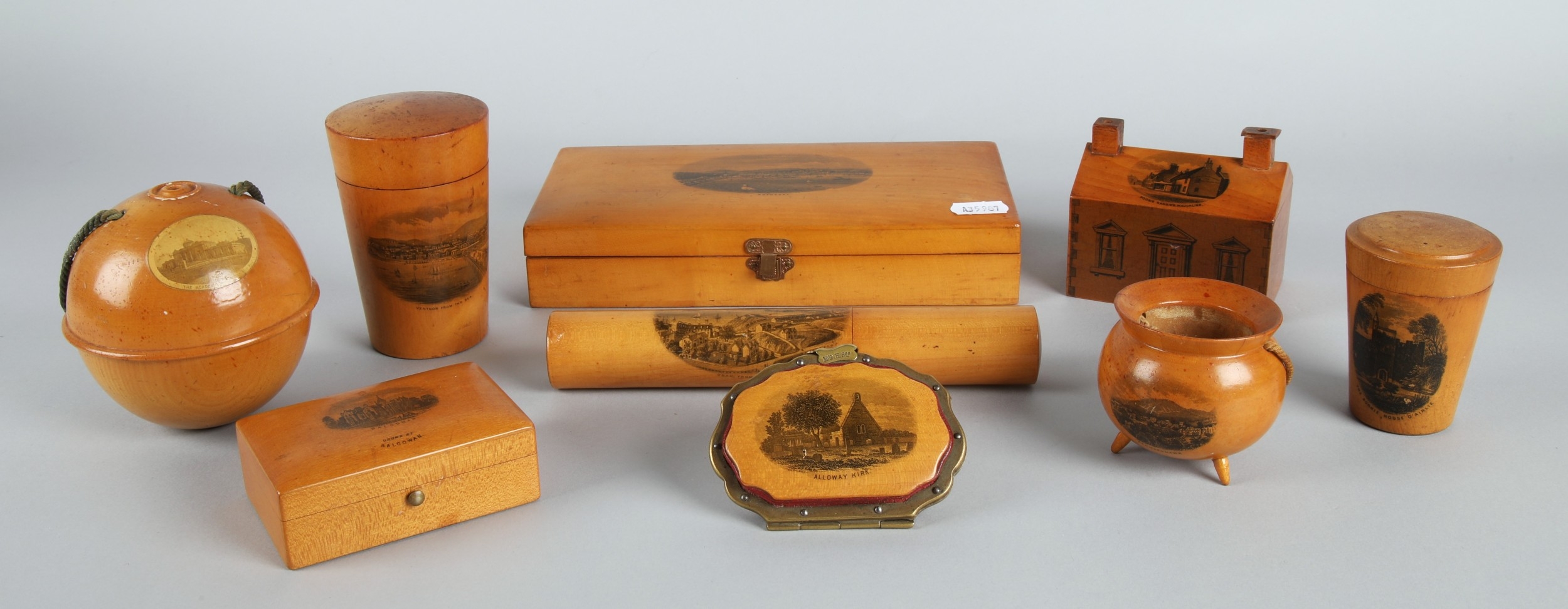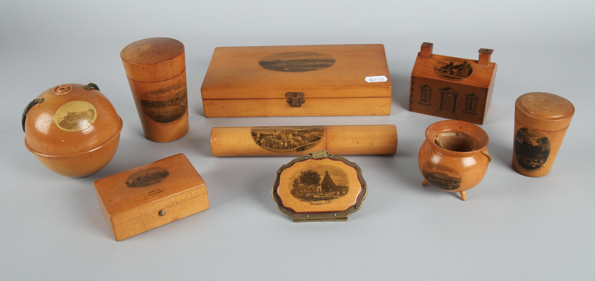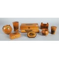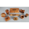 Collection of Mauchline ware to include miniature caldron, string ball, trinket boxes, house form money bank etc. (9).