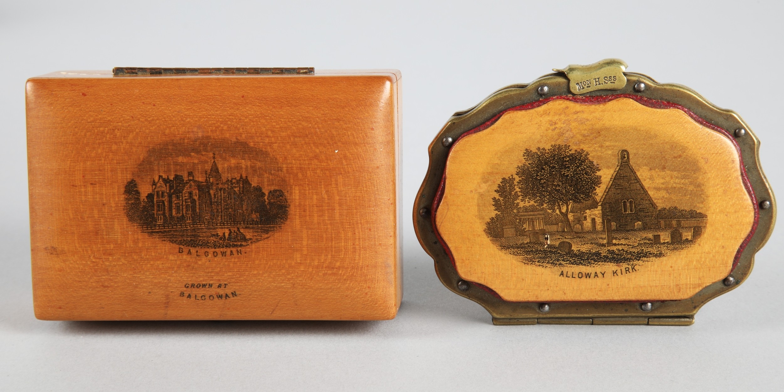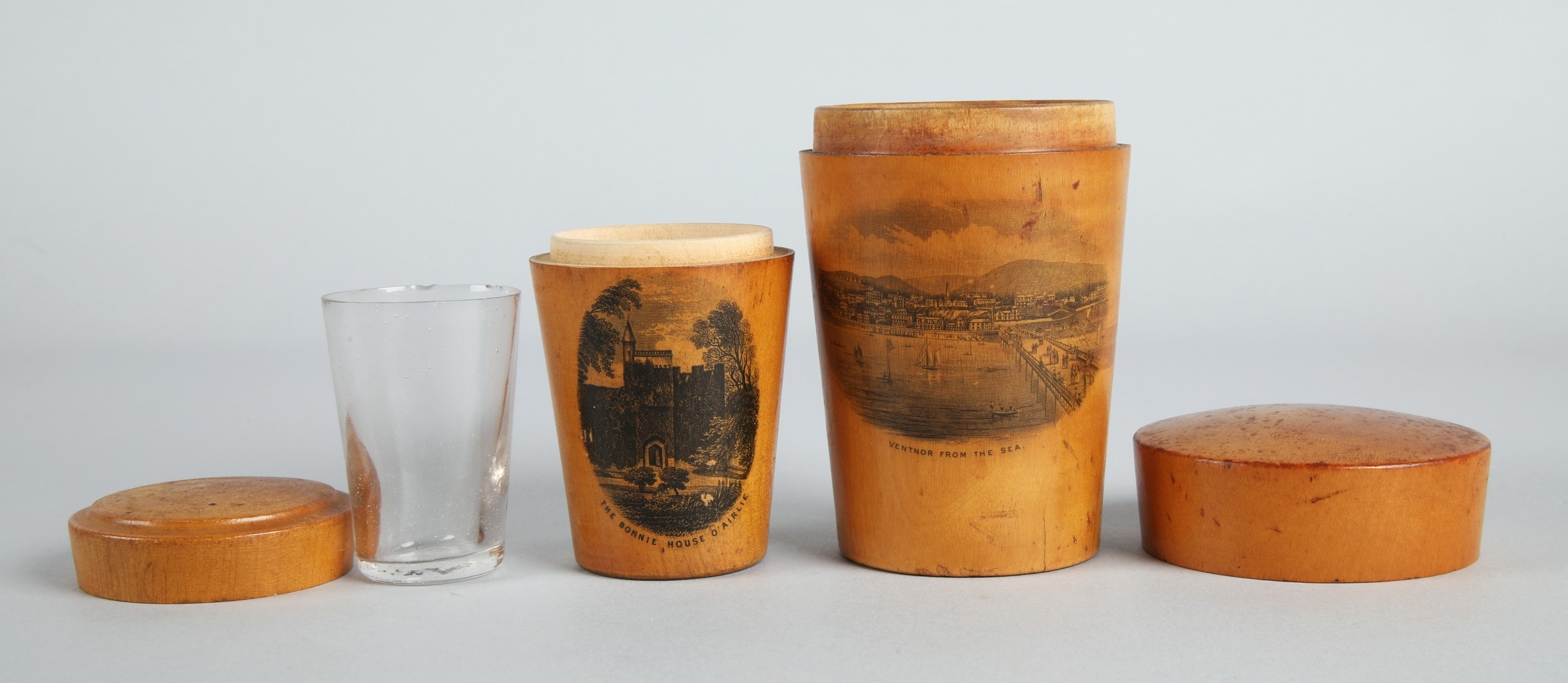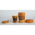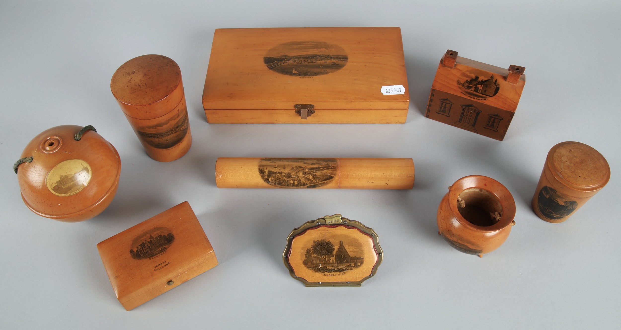 Collection of Mauchline ware to include miniature caldron, string ball, trinket boxes, house form money bank etc. (9).