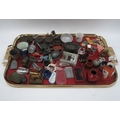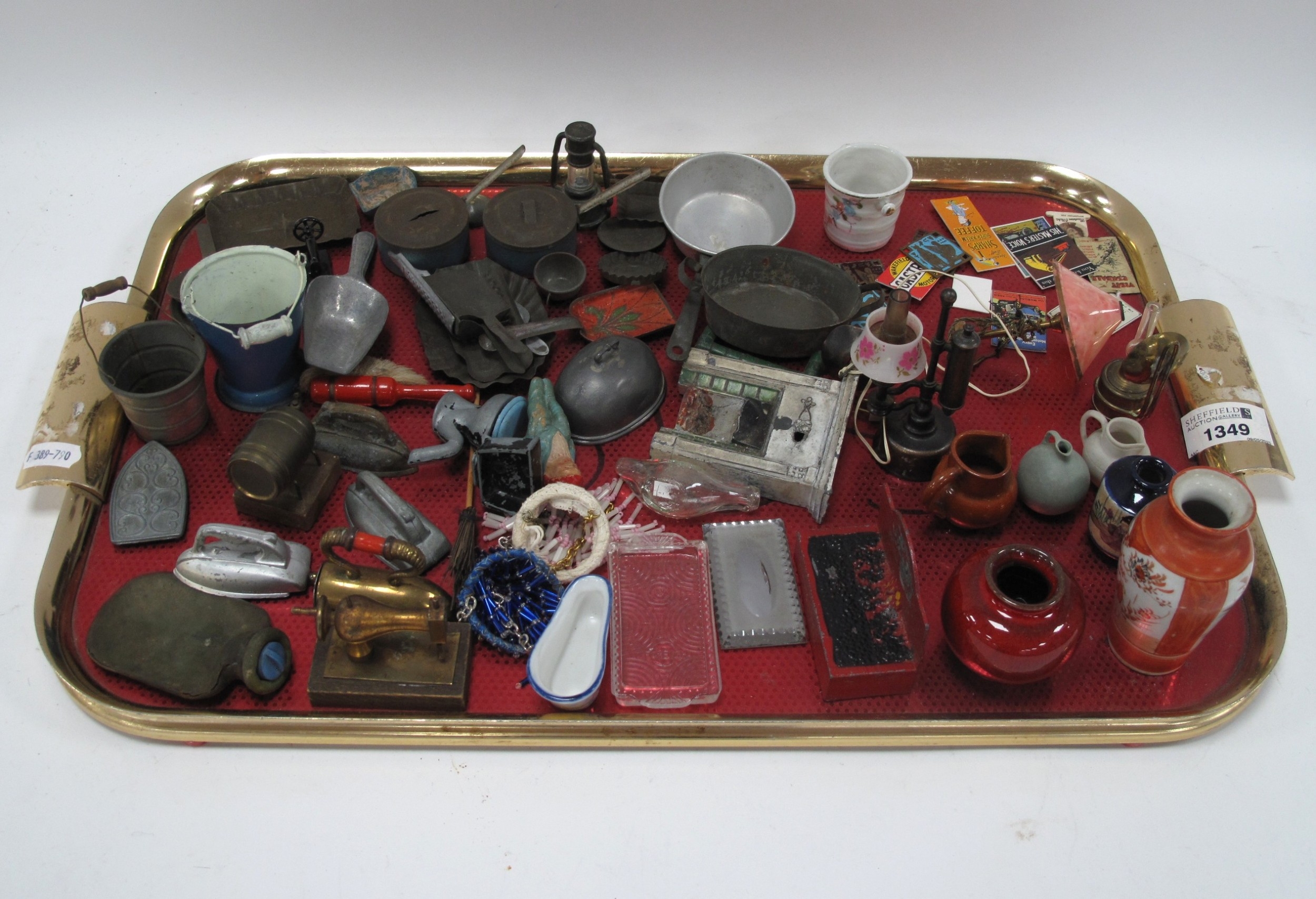 Dolls House Furnishings, mainly vintage, including fireplate, table lamp, pans, kitchen utensils, irons, sewing machine:- One Tray.