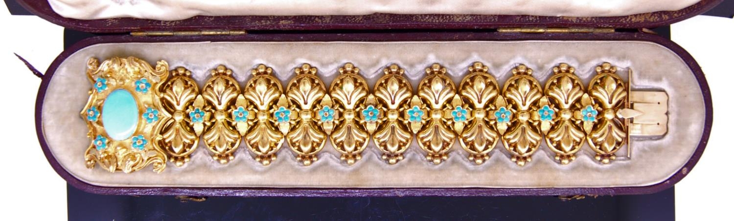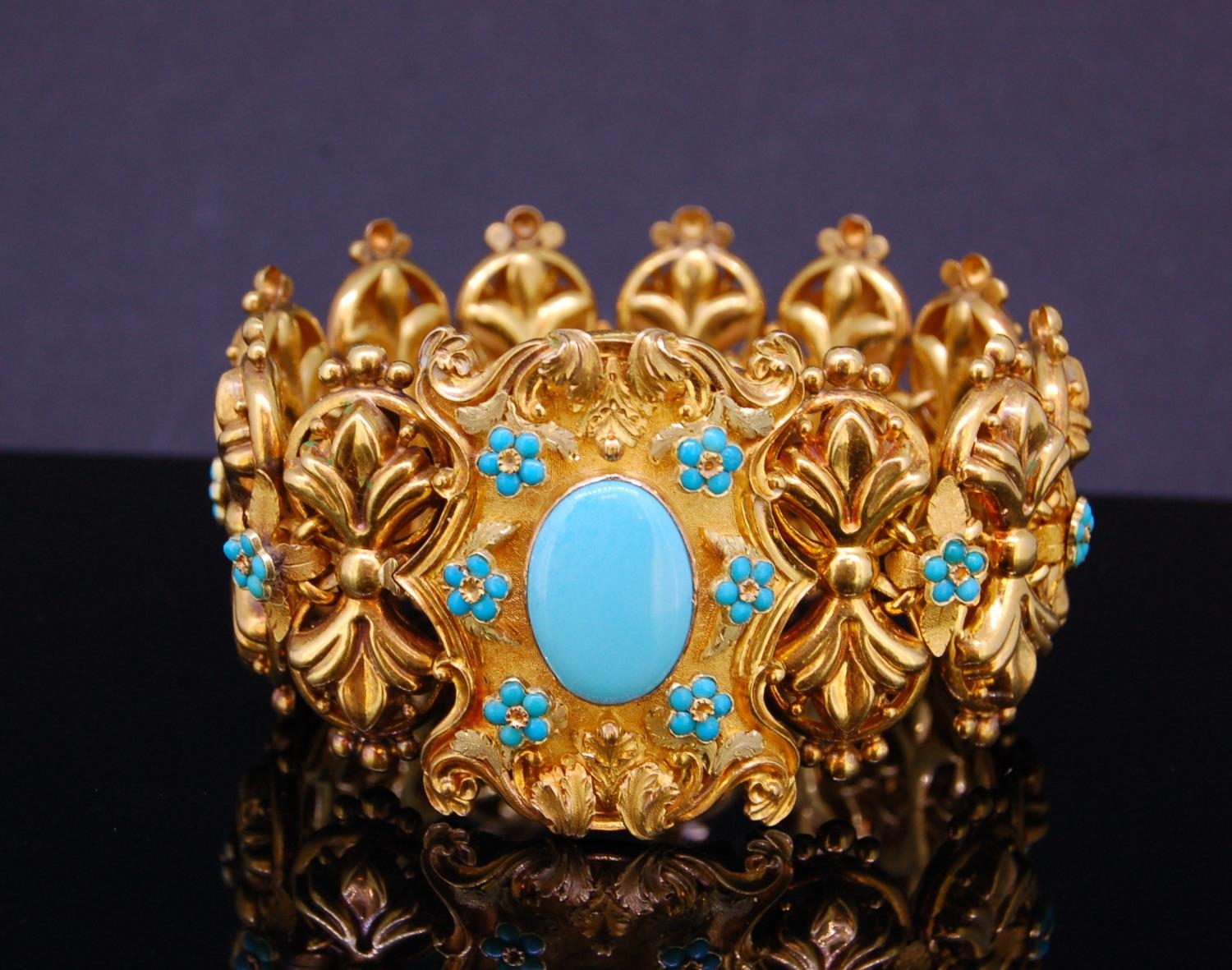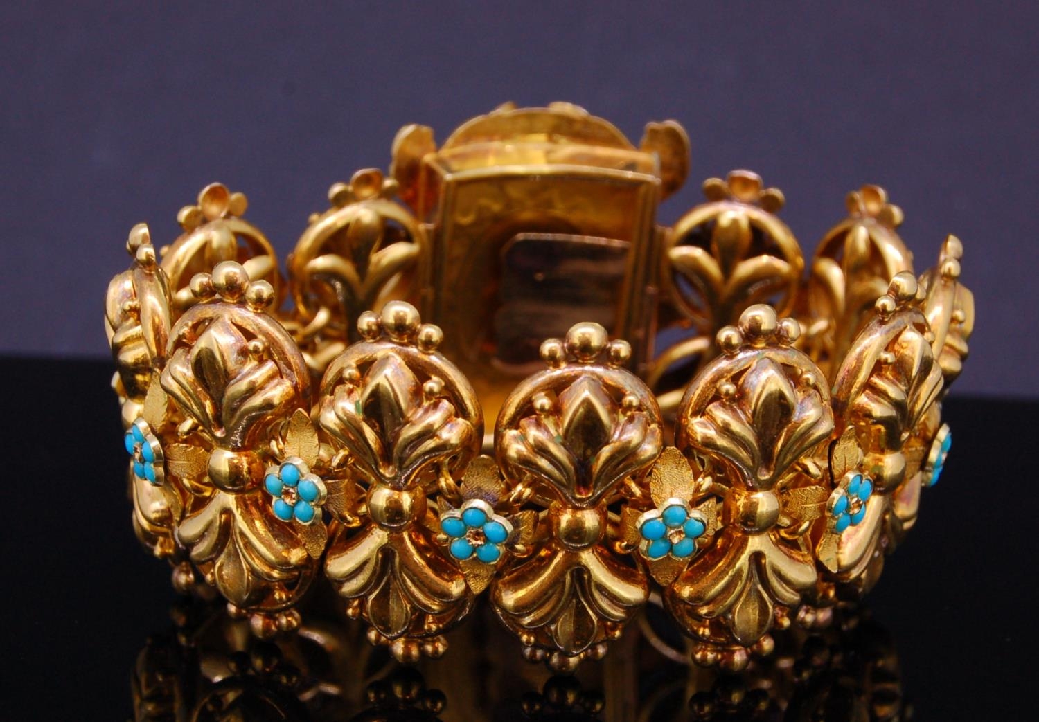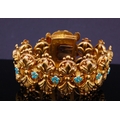 ANTIQUE TURQOISE LINK BRACELET, the links of scrolling design, alternated with a floral shaped turquoise set link. The clasp set with a large cabochon cut turquoise accented with turquoise set floral motifs and scrolling surmount. L. 19 cm. 59.9 grams. With a fitted box.