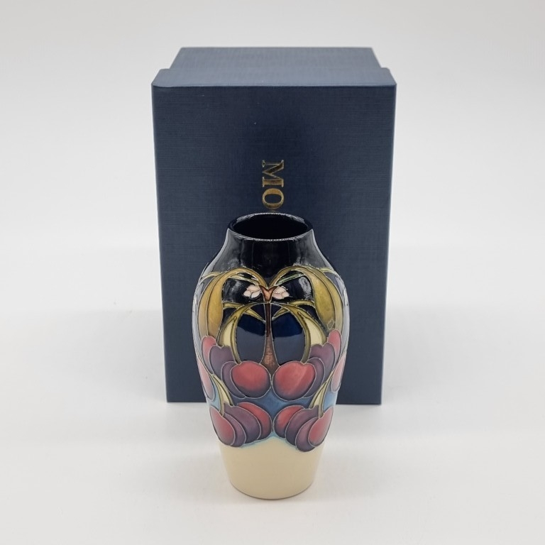 A Moorcroft 'Mediterranean Cherries' pattern vase, by Kerry Goodwin, 13.5cm high, boxed.