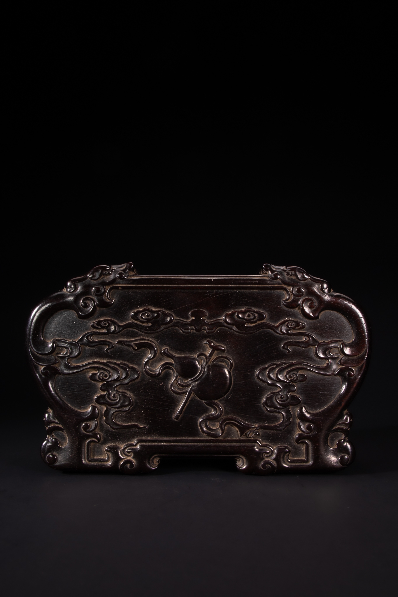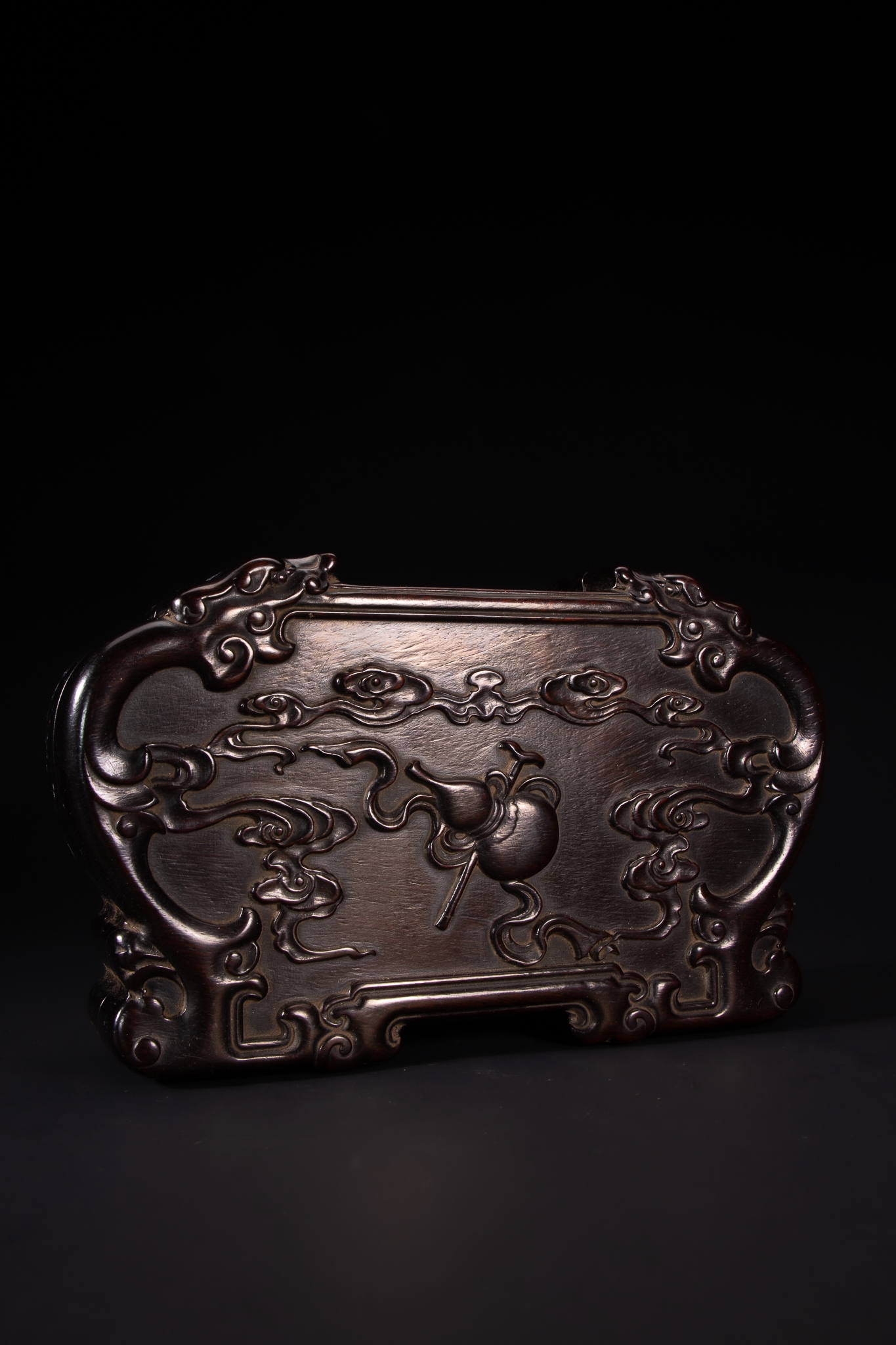 A Chinese rectangular wooden box carved in relief on the lid with flowing cloud scrolls surrounding a central auspicious emblem, framed by raised borders and stylised corner terminals. The surface shows a deep, dark brown tone with a smooth, polished finish.