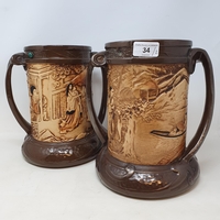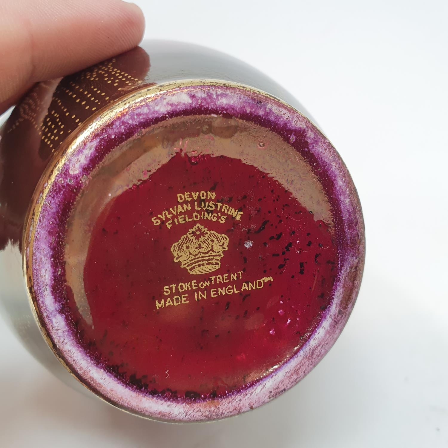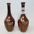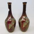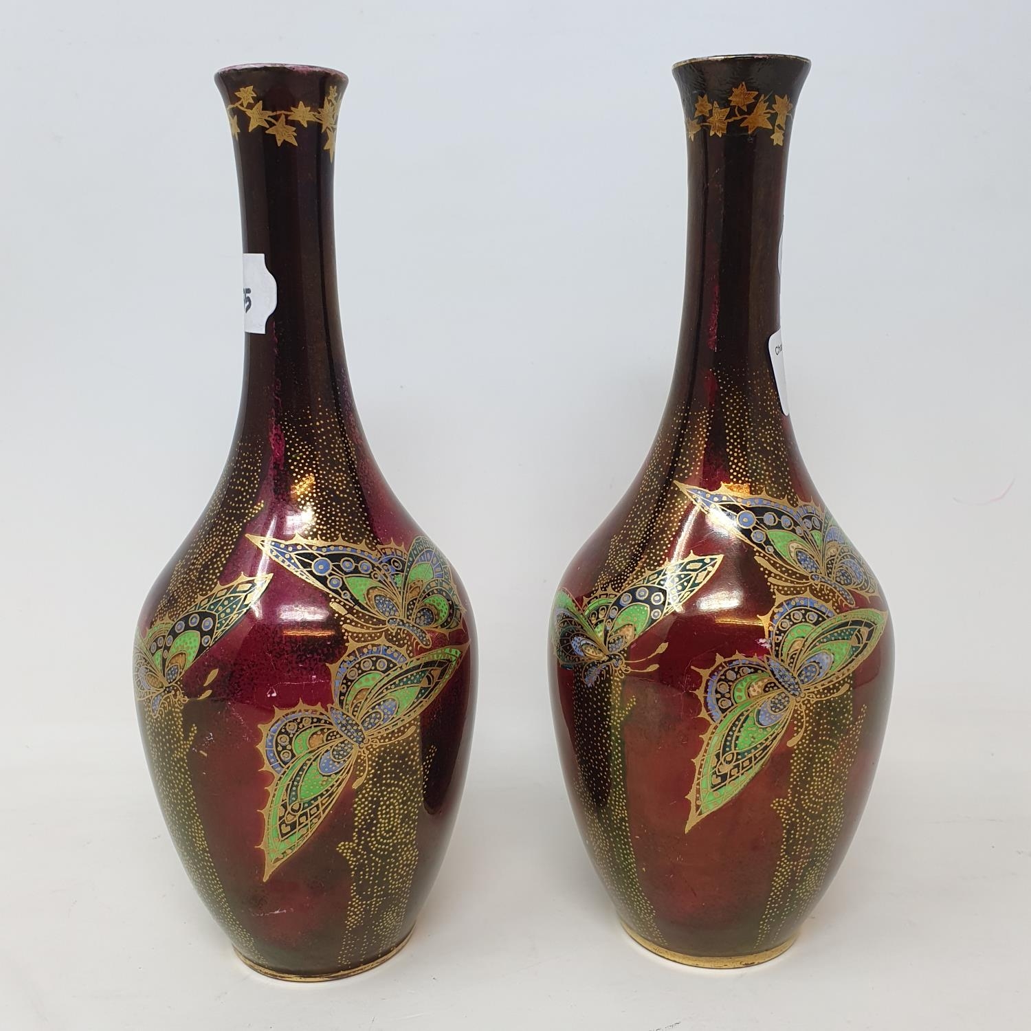 A pair of Devon Fieldings Sylvan Lustrine bottle vases decorated with butterflies on a deep red lustre ground, factory marks to bases, 23.5 cm high