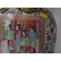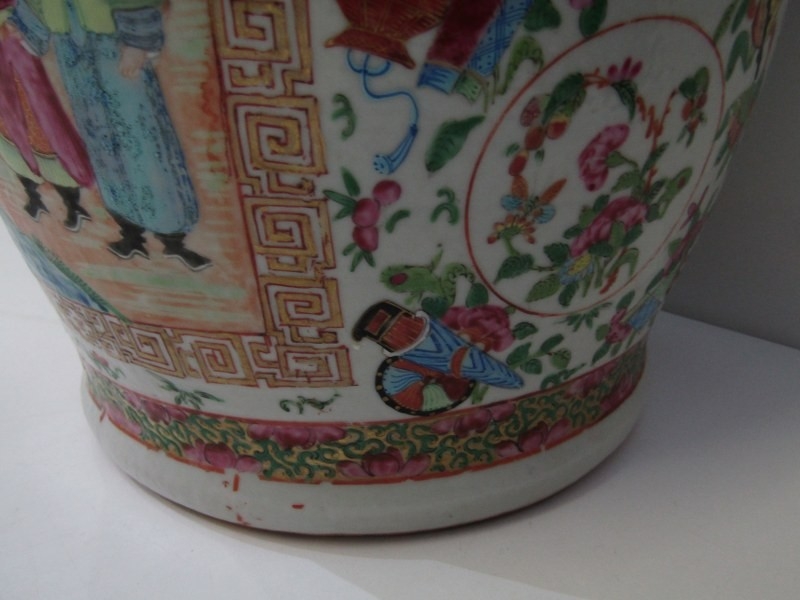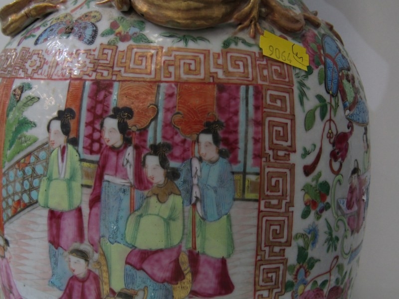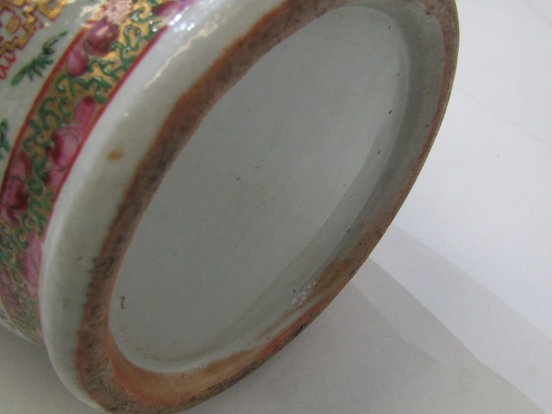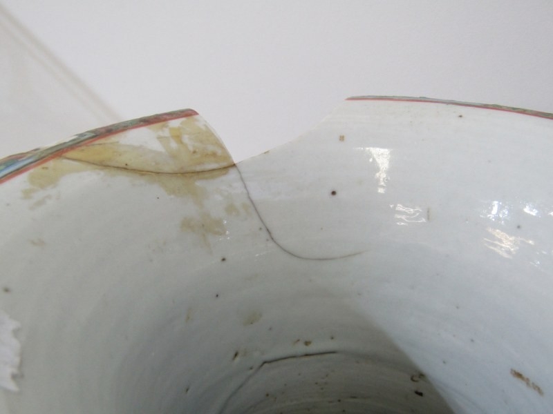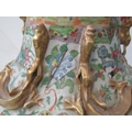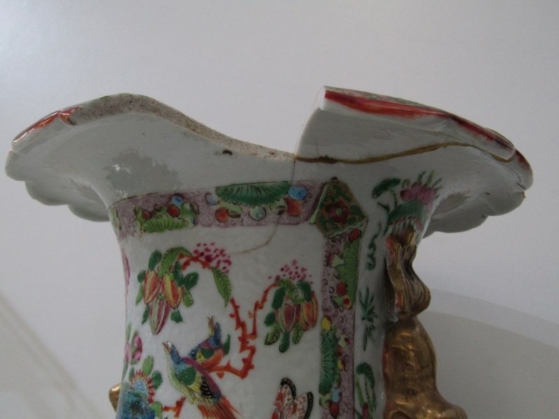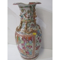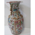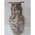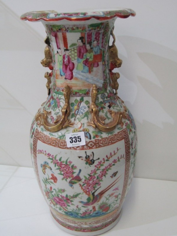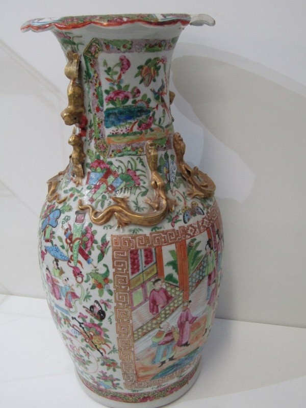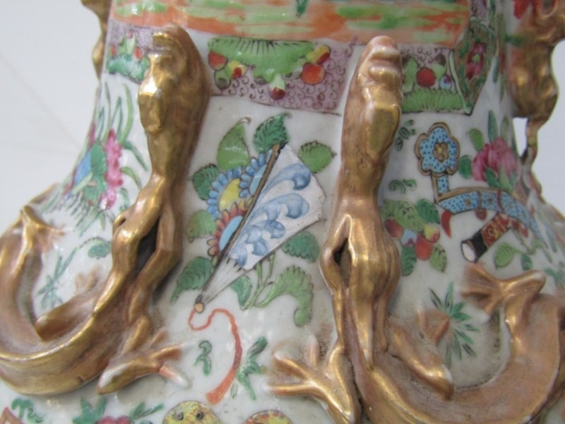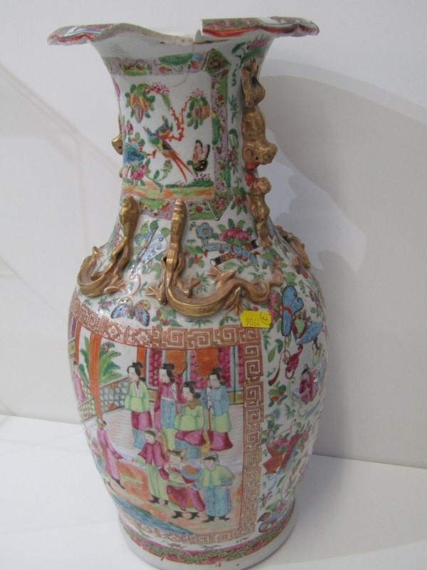 ORIENTAL VASE, a 19th Century Chinese famille rose vase, with various panels depicting Chinese figures, birds and flowers, with mythical dragon figures in relief, 43cm height (damage and loss)