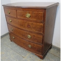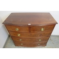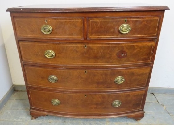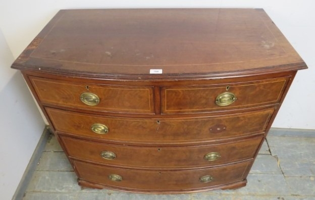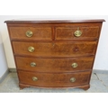 A late 19th Century bow fronted inlaid mahogany chest of two short over three long drawers with brass oval handles. H98cm x W102cm x D53cm approx.