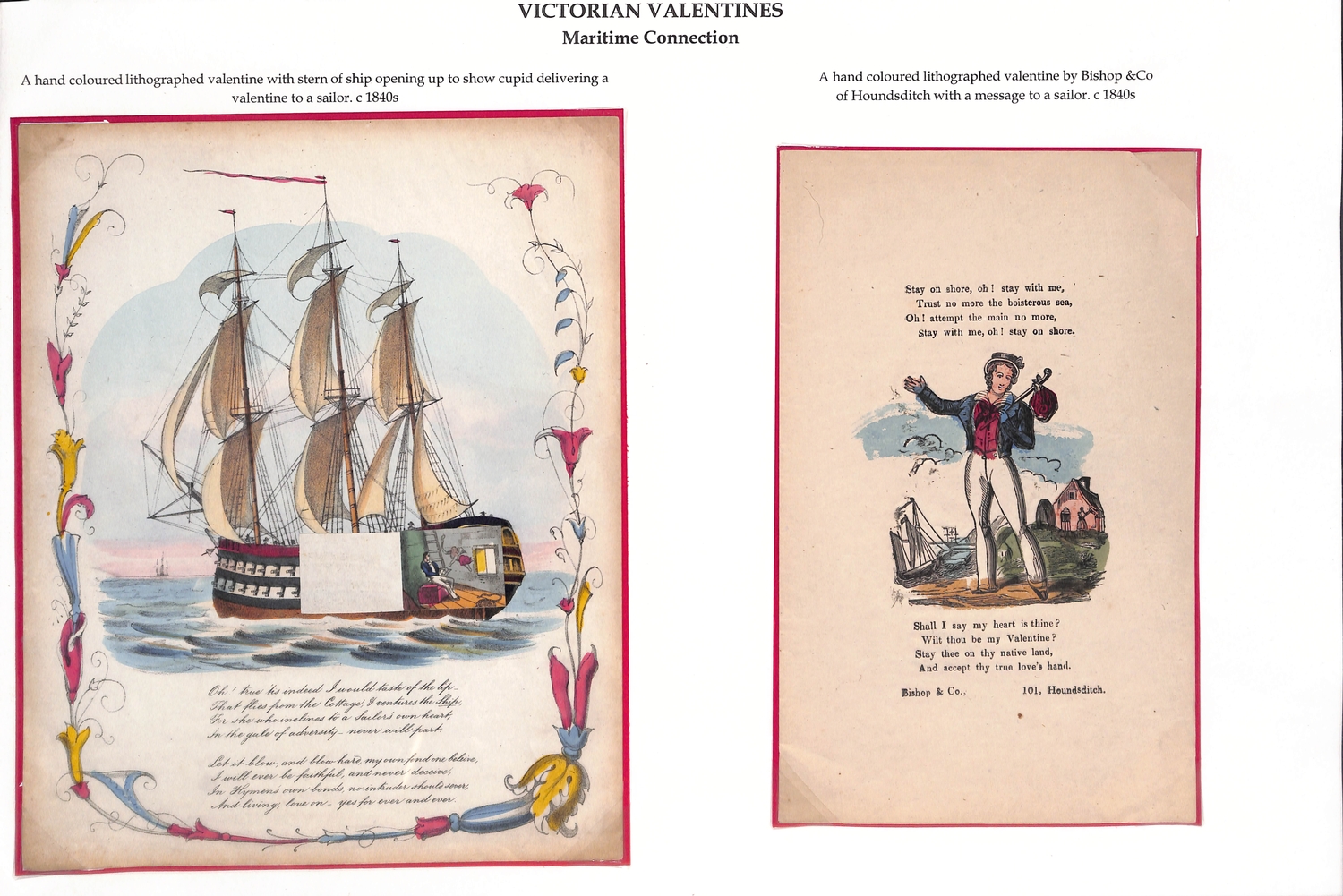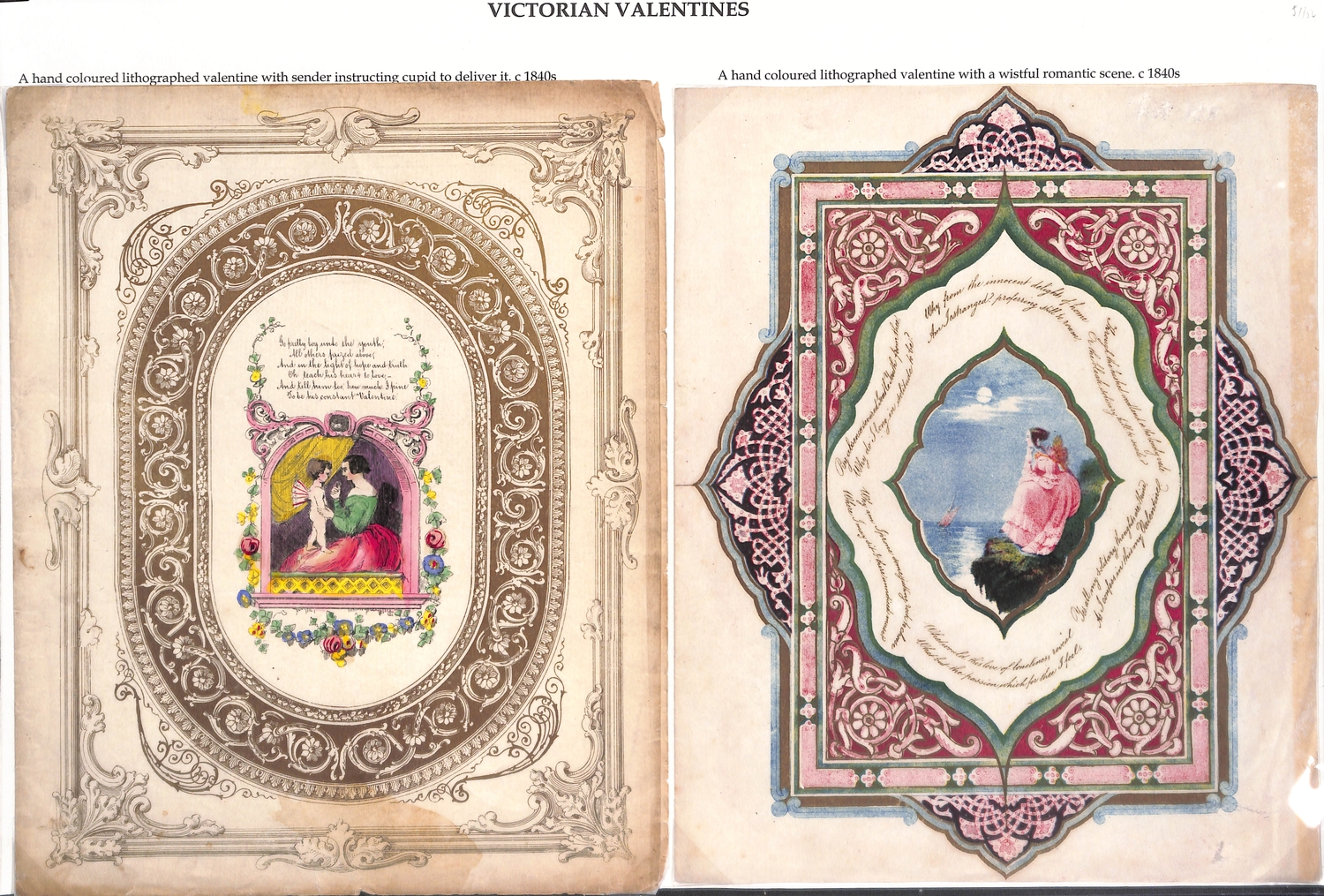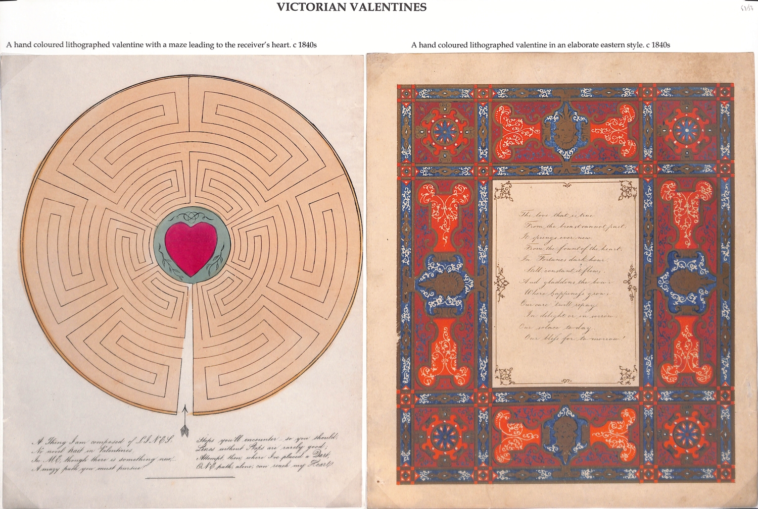 c.1840-60 Printed lithographic valentine lettersheets with attractive borders containing a verse or romantic scene, a sailor, a ship with stern opening to reveal cupid delivering a valentine to a sailor, or a heart within a maze, all handcoloured, an attractive group. (6).