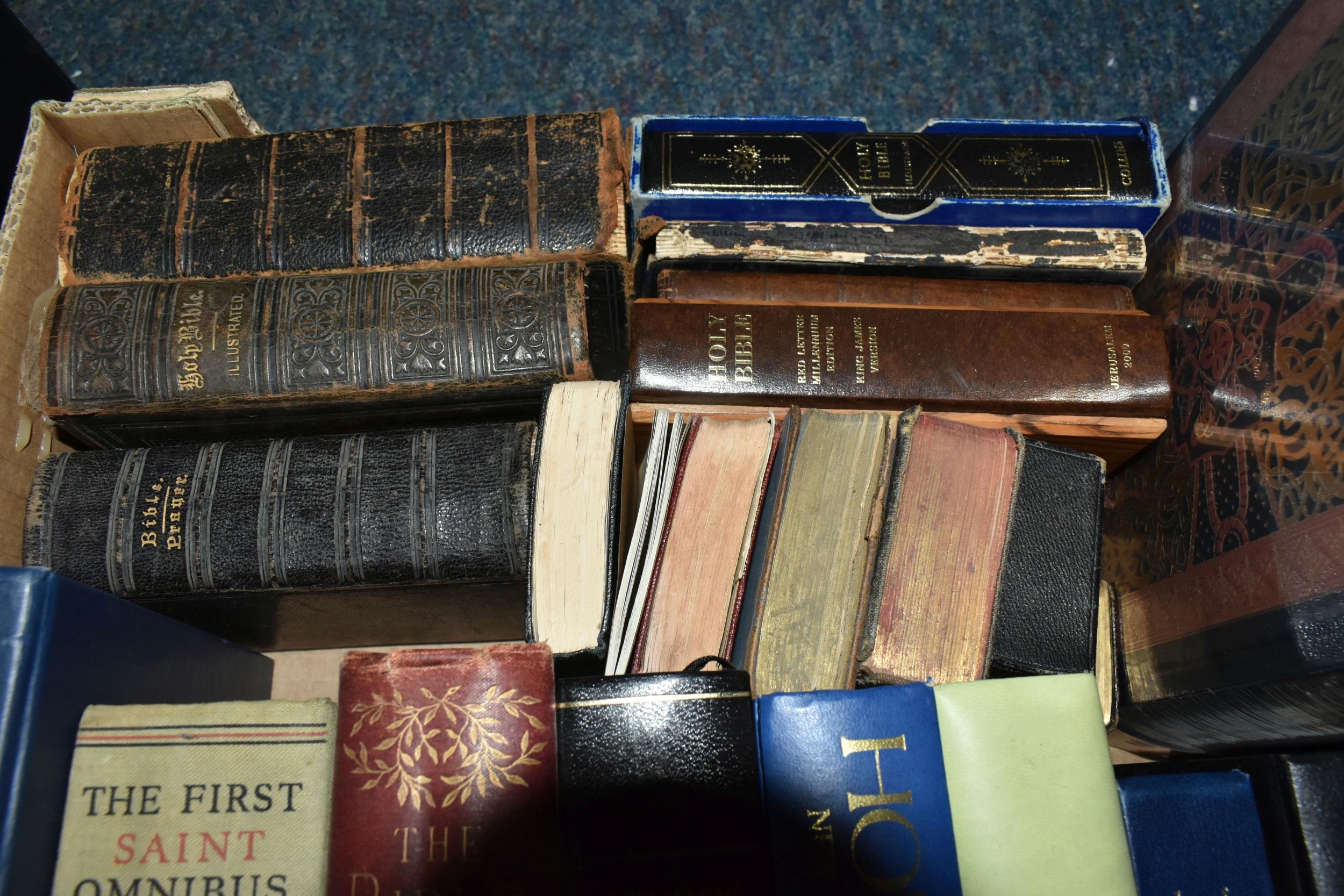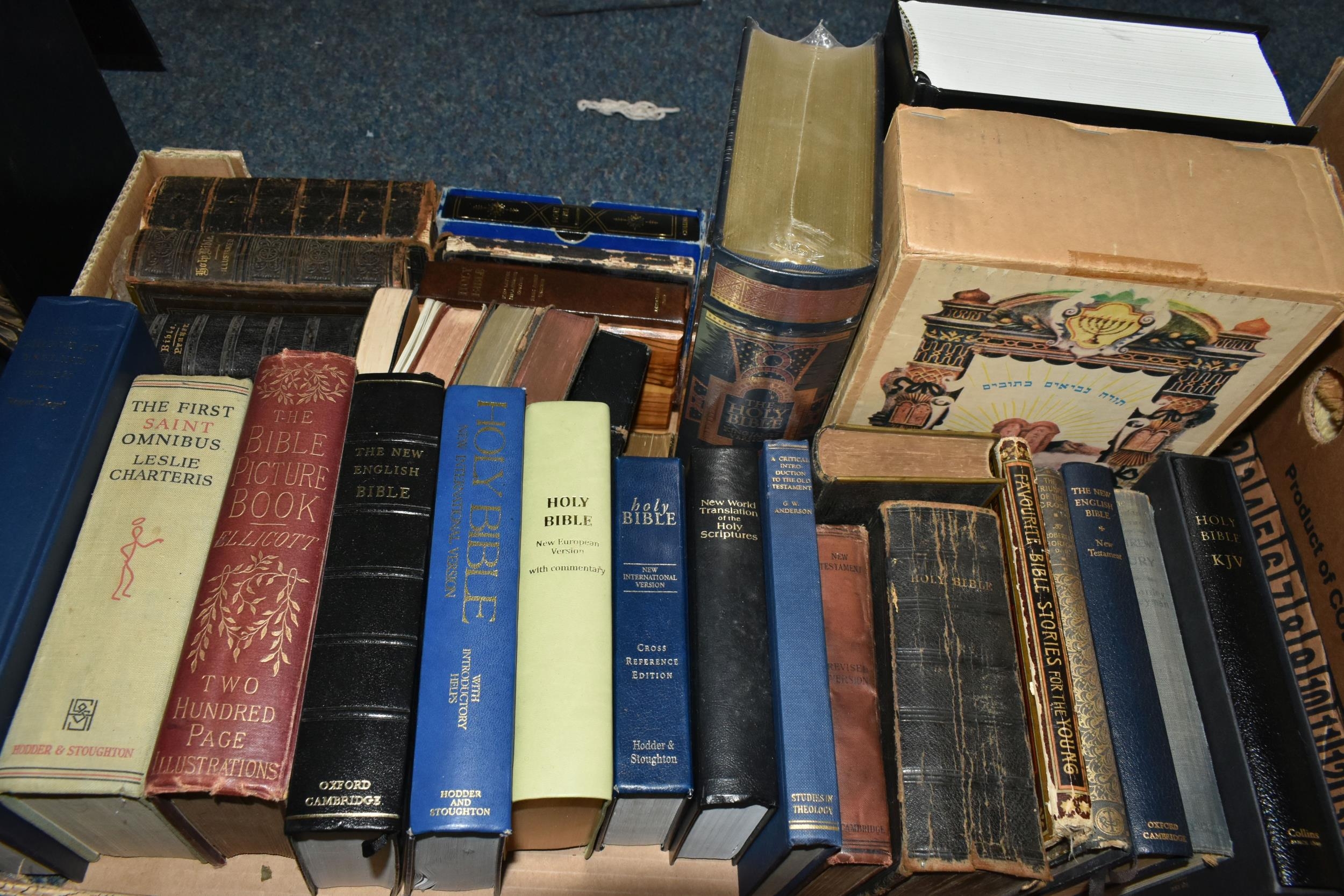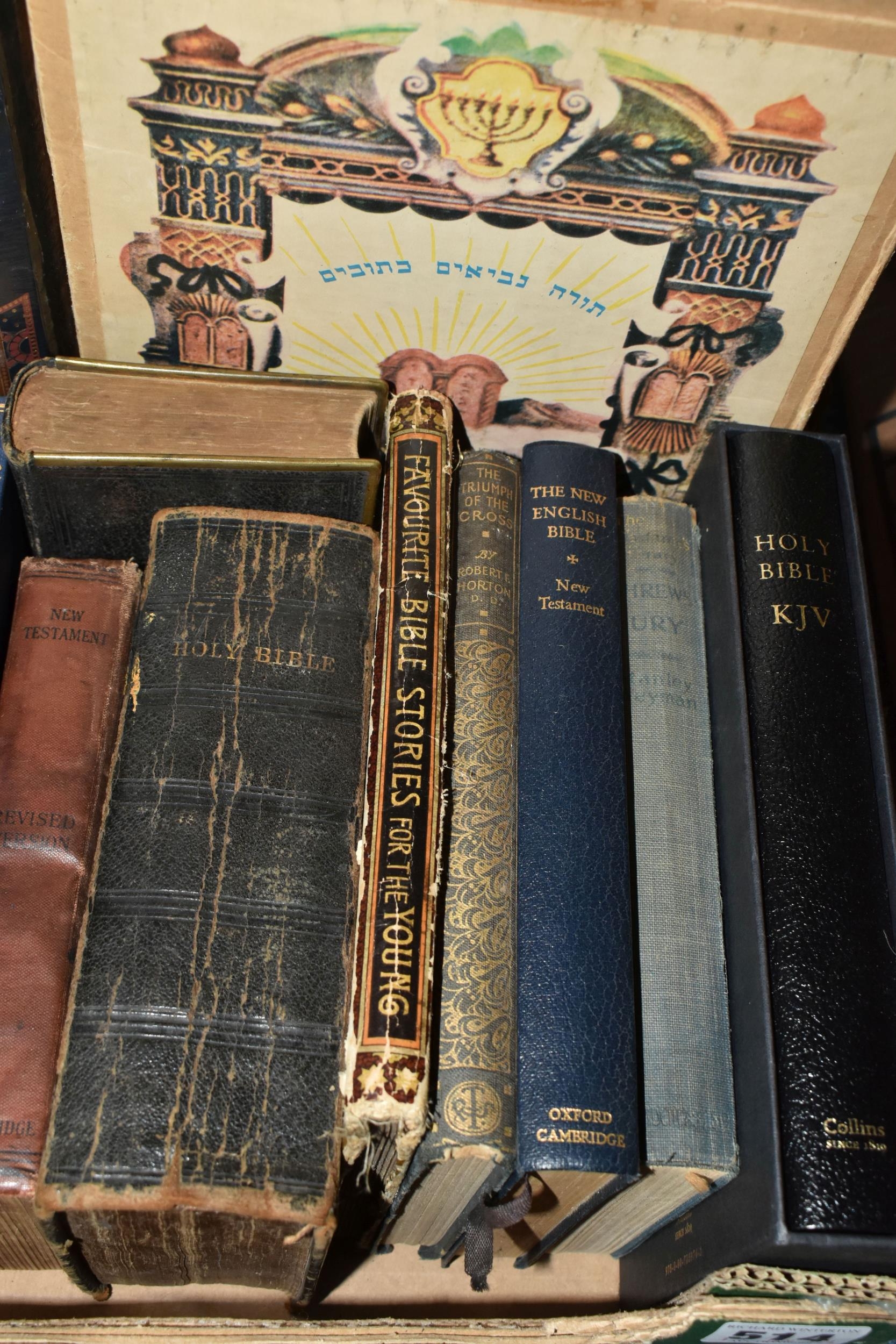 ONE BOX OF RELIGIOUS BOOKS containing approximately thirty-three titles, mostly Bibles dating from the Victorian era to the late 20th century including an elaborately bound King James version and two Jewish publications of The Holy Scriptures