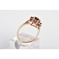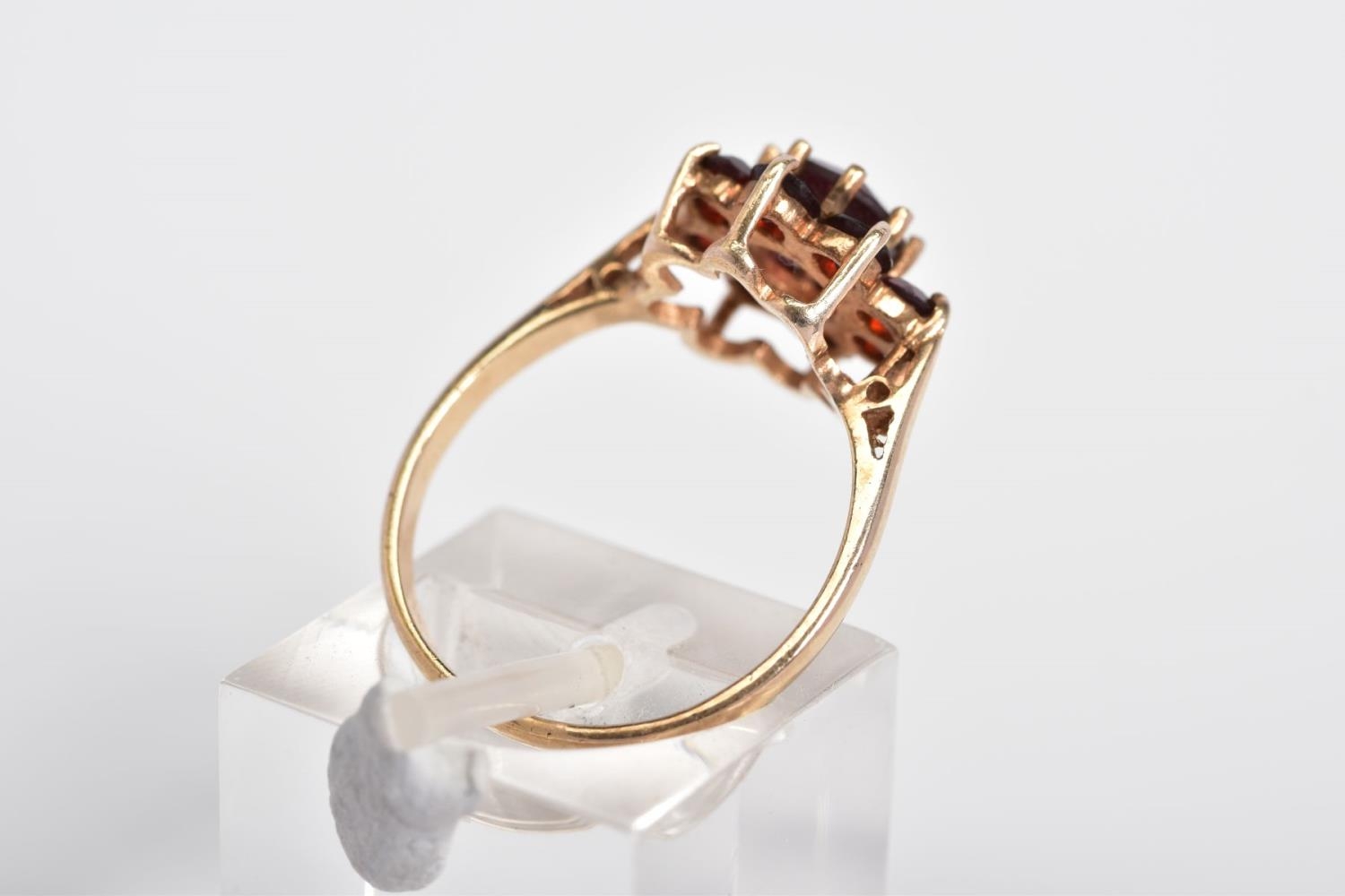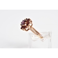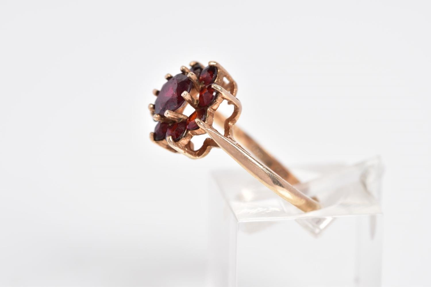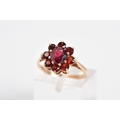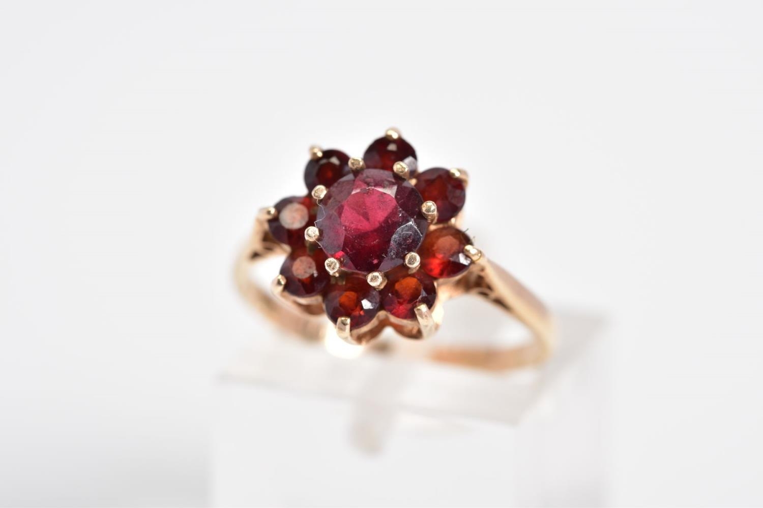A GARNET CLUSTER RING, designed with a raised cluster set with nine circular cut garnets, to the tapered shoulders, stamped 9ct, ring size M, approximate weight 2.4 grams