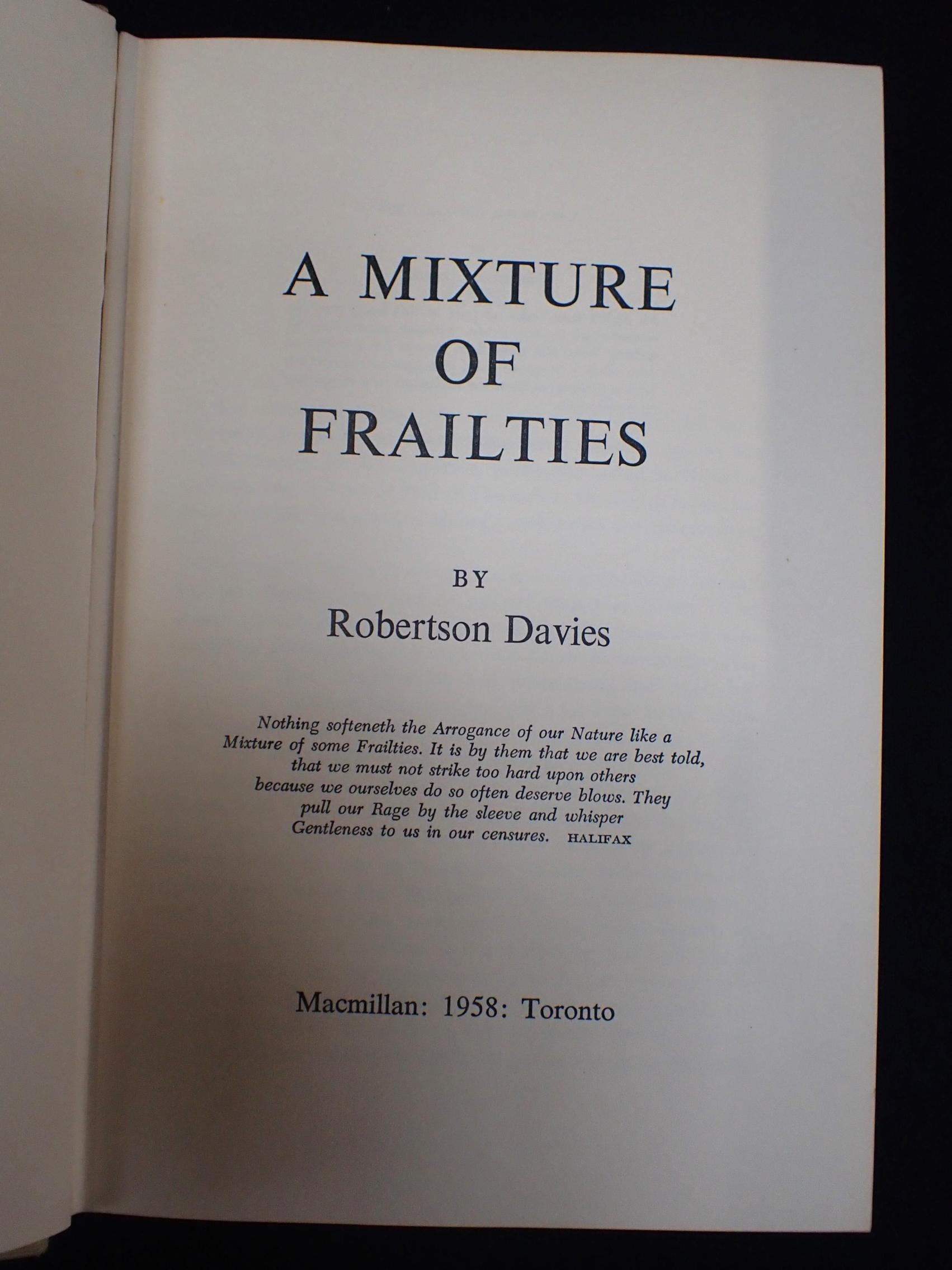 ROBERTSON DAVIES: 'A MIXTURE OF FRAILTIES' Macmillan 1958, with unclipped jacket (some damage)