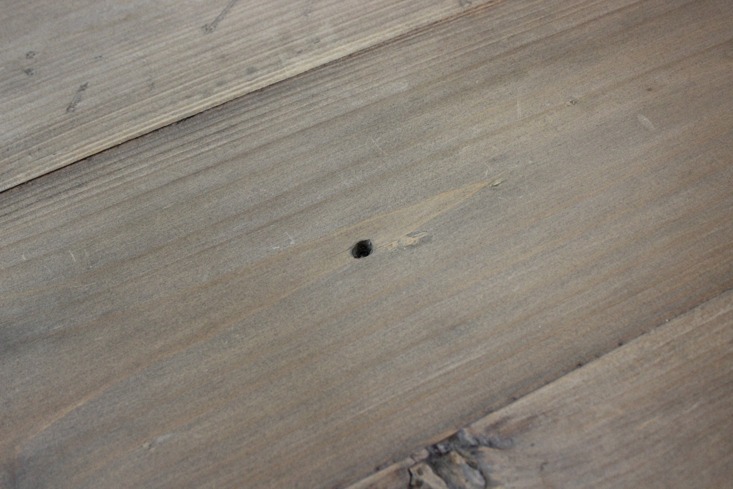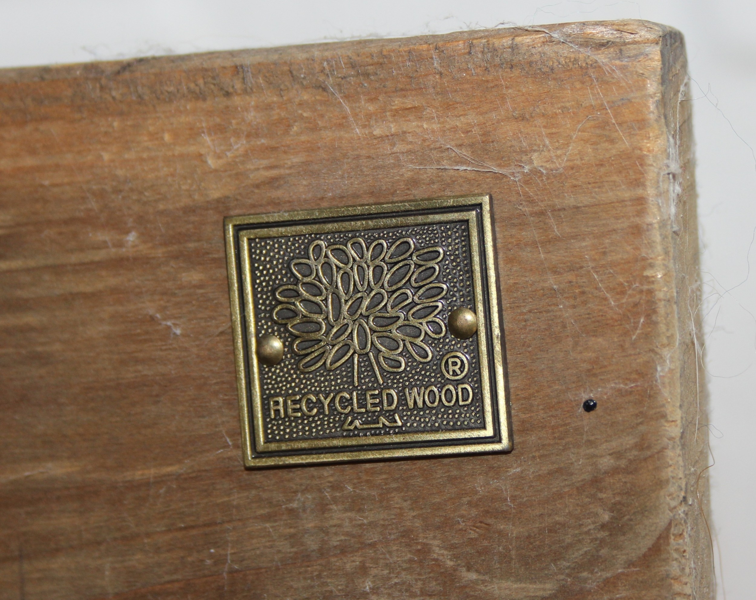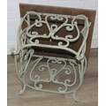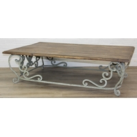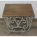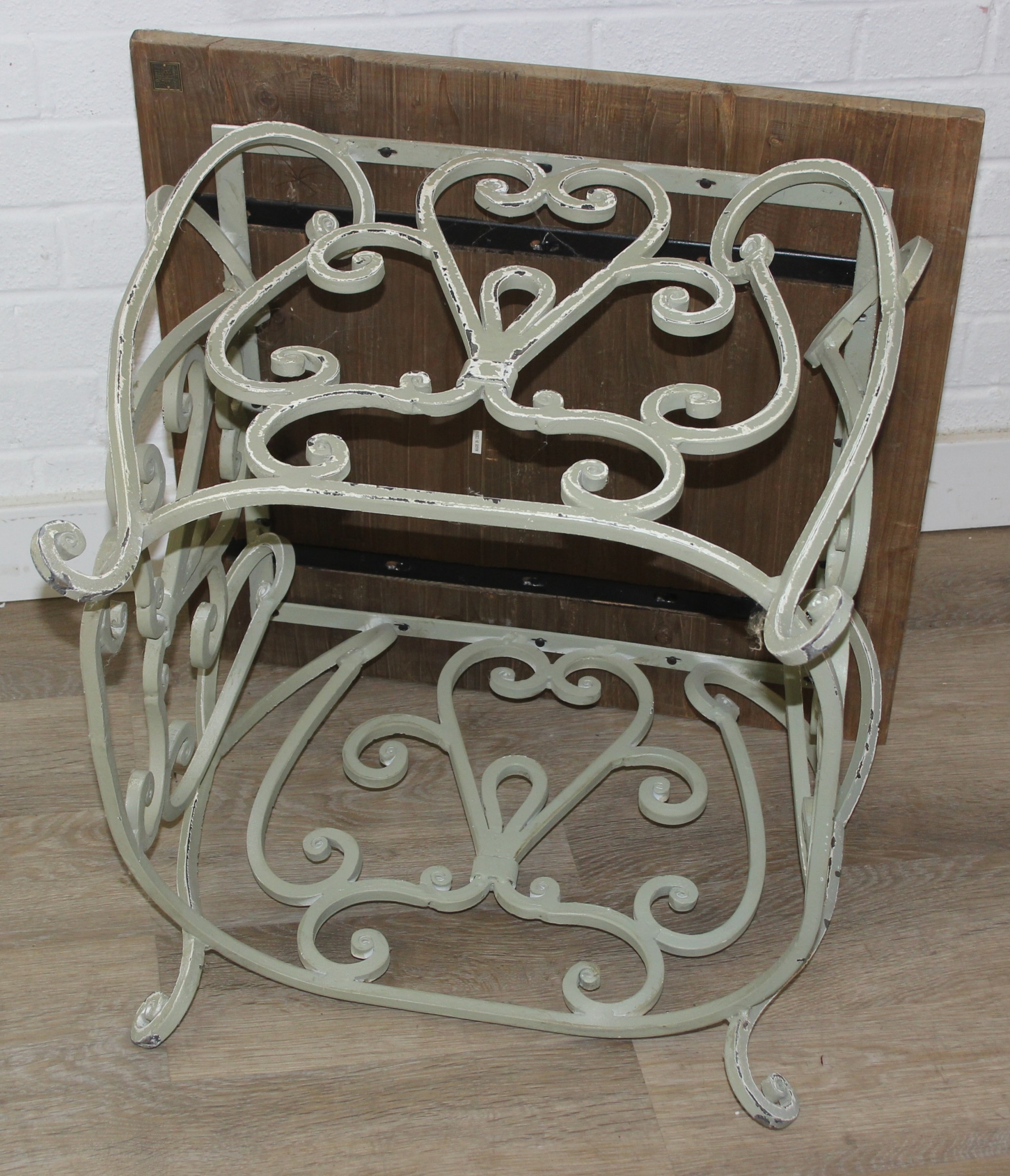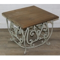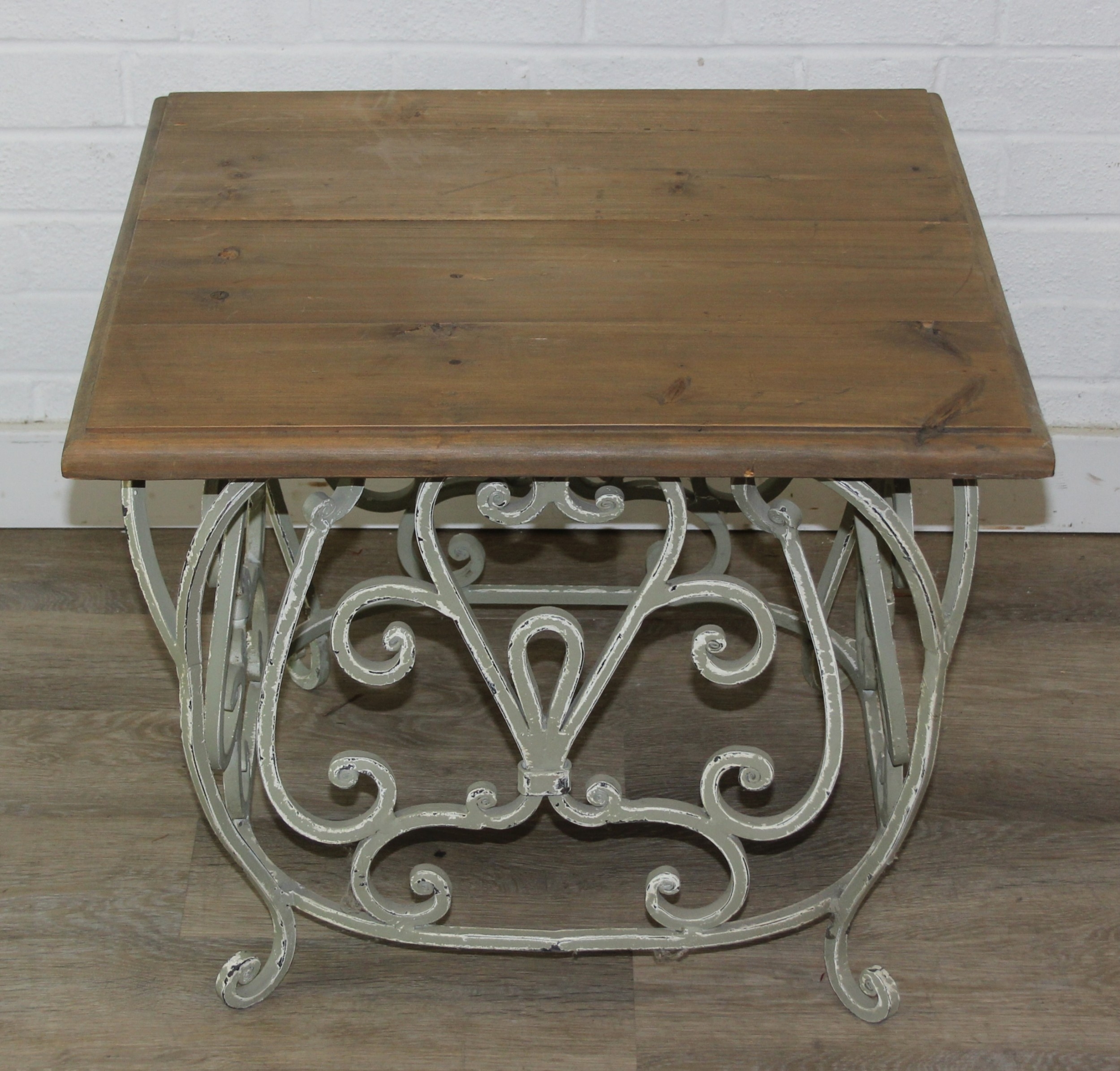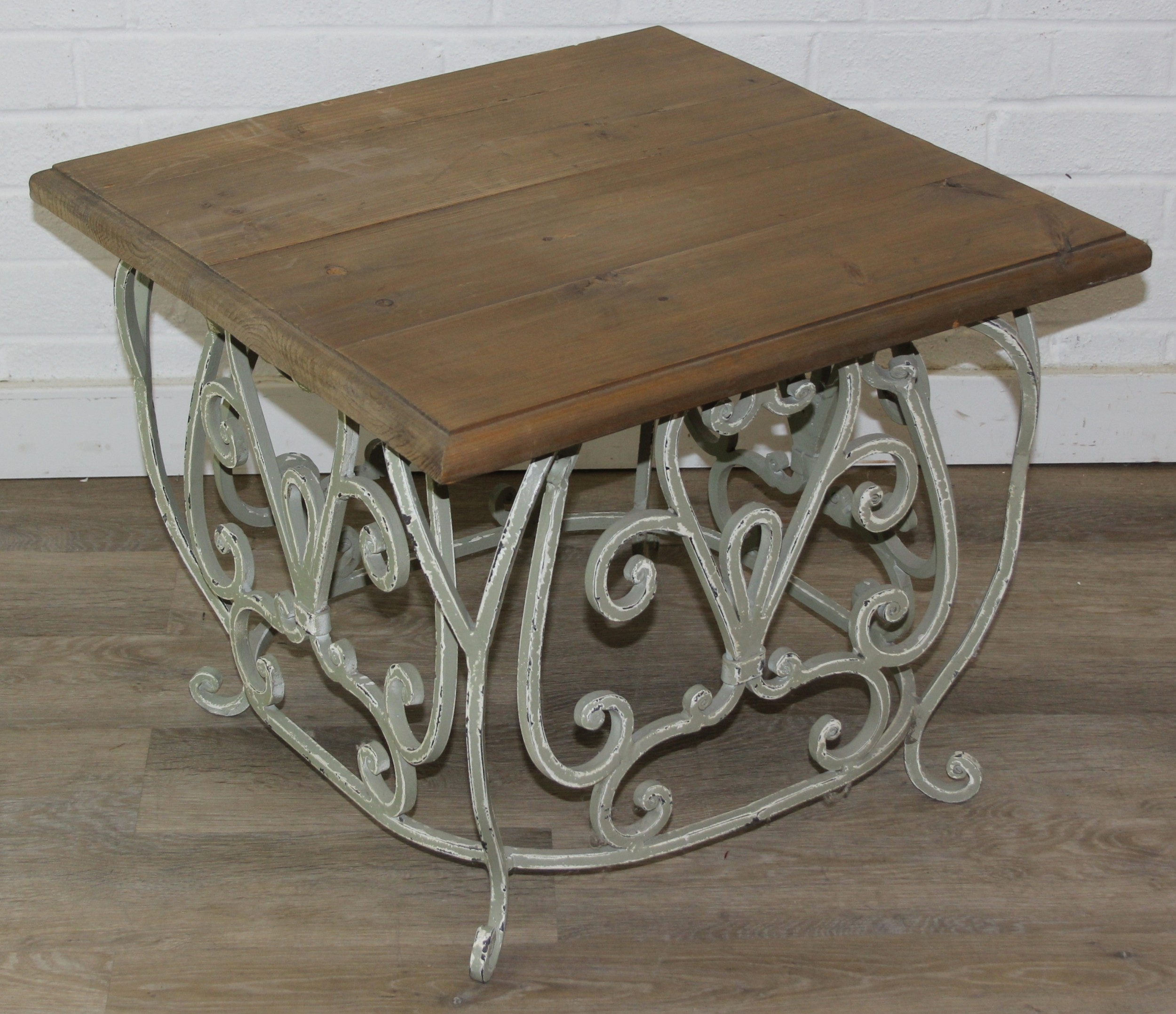 A vintage wooden topped low table with distressed painted wrought iron base, 59cm x 59cm x 61cm